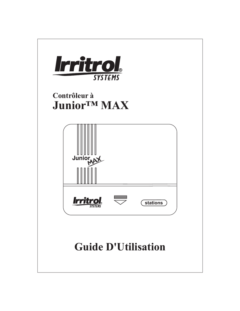 Contrôleur à Junior™ MAX stations Guide D'Utilisation Nous vous remercions d’avoir choisi le programmateur Junior MAX d’Irritrol Systems, qui se distingue par ses nombreuses fonctionnalités évoluées. Le Junior MAX est le dernier-né de la gamme Junior d’Irritrol Systems. Il se joint au Junior Plus et au Junior DC pour former la gamme de programmateurs la plus polyvalente, la plus évoluée et la plus économique actuellement offerte dans le commerce. Les pages suivantes présentent une description des fonctionnalités du Junior MAX, ainsi que des instructions d’emploi claires qui vous permettront de tirer un rendement maximal de votre nouveau programmateur. Nous sommes convaincus que vous ne manquerez pas d’être impressionné par la puissance du Junior Max et enchanté par sa qualité et son rapport coût-rendement. Si vous avez quelque suggestion que ce soit concernant d’autres fonctionnalités à ajouter aux programmateurs ou autres produits Irritrol Systems, n’hésitez pas à nous en faire part. Nous accordons une grande valeur à vos idées ! Irritrol Irrigation Systems International Product Manager 5825 Jasmine Street Riverside, CA 92504 U.S.A. ______________________________________________________ Au sujet de la mémoire du Junior MAX Ce contrôleur est équipé d’une batterie de secours « intégrée » qui conserve la mémoire pendant plusieurs années si l’appareil n’est pas sous tension. Si vous souhaitez configurer le programmateur sans le brancher sur l’alimentation secteur, installez la pile alcaline 9 V. La pile 9 V active l’affichage. Pour allumer l’indicateur lumineux du guide de programmation, appuyez sur une touche quelconque. Si vous n’appuyez sur aucune touche, l’indicateur lumineux s’éteint au bout de 10 secondes. Coupe-circuit automatique Le programmateur Junior MAX comporte un coupe-circuit automatique grâce auquel il n’est plus nécessaire de changer les fusibles. En cas de présence d’un court-circuit dans le câblage réseau ou dans l’électrovanne, ce coupe-circuit s’ouvre et coupe la sortie électrique. Après un certain délai, le coupe-circuit se referme automatiquement. Cette séquence se poursuit jusqu’à ce que le programme passe à la voie suivante. Pour vérifier s’il y a un court-circuit, passez en mode manuel et faites démarrer la voie. Si cette dernière ne démarre pas ou si elle s’arrête avant la fin de la durée de fonctionnement fixée, réparez le câblage réseau ou l’électrovanne. Indication de panne de courant En cas de panne de courant, si une pile 9 V est connectée, l’indicateur lumineux « 24V » clignote. Il cesse de clignoter aussitôt que l’alimentation électrique est rétablie. Caractéristiques électriques : Tension d’entrée : • 120 V c.a., 50/60 Hz (transformateur enfichable, homologué ULC) • 230 V c.a., 50/60 Hz (transformateur enfichable, marque CE) • 240 V c.a., 50/60 Hz (transformateur enfichable, SAA) 2 • 60 W (0,5 A) maximum Tension de sortie voie : • 24 V c.a. 6 VA (0,25 A) par voie maximum 6 VA (0,25 A) démarrage pompe/électrovanne principale 12 VA (0,50 A) charge totale INSTRUCTIONS D’INSTALLATION: Indicateur lumineux du guide de programmation AUTO DI LU MA ME JE VE SA ANNÉE MOIS JOUR HEURE Arrêt Systéme Heure/jour Semiautomatique Durée d'Arrosage Jours d'Arrosage Heures de Démarrage Manuel VOIE DÉMARRAGE Reglage % ÉCRAN ACL MULTILINGUE Voir les instructions d’installation et de remplacement se trouvant à l’intérieur du sachet en plastique. Tiroir de la pile 9 volts Réinitialisation du fusible électronique TRANSFORMATEUR REMISE À ZÉRO CAPTEUR Installer dans un endroit protégé ÉLECTROVANNE PRINCIPALE C O M M U N E À T O U T E S L E S É L E C T R O VA N N E S Retirer le couvercle inférieur. Installer l’appareil sur le mur en utilisant la fente de vis supérieure. Posez le programmateur à plat, puis insérez la vis dans l’orifice du bas, en dessous de la plaquette à bornes. Brancher les fils du solénoïde sur le bornier. Brancher un fil du solénoïde sur le numéro de voie correspondant du bornier et l’autre sur la borne commune C. Pour terminer, brancher les fils du transformateur sur les bornes 24 V c.a. Pile de 9 V c.c.. Le compartiment de la pile 9 volts se trouve du côté droit du boîtier. Appuyez sur le tiroir de la pile pour le débloquer et le faire glisser vers l’extérieur. La pile 9 volts alimente l’écran à cristaux liquides en l’absence d’alimentation secteur et permet de procéder à la programmation « dans un fauteuil ». En cas de panne de courant, les paramètres de programmation sont sauvegardés par une pile lithium intégrée. Remarque : Le transformateur ne doit être branché sur l’alimentation c.a. qu’une fois que toutes les connexions ont été effectuées et vérifiées. 3 Connexion et utilisation du capteur : AUTO DI LU MA ME JE VE SA Arrêt Systéme ANNÉE MOIS JOUR HEURE Heure/jour Semiautomatique Manuel VOIE DÉMARRAGE Reglage % Durée d'Arrosage Jours d'Arrosage Heures de Démarrage TRANSFORMATEUR REMISE À ZÉRO CAPTEUR Installer dans un endroit protégé CAPTEUR Pour connecter un capteur de pluie, retirer le cavalier de la borne du capteur et brancher l’un des fils du commutateur de pluie sur la borne commune C et l’autre sur la borne de contact NF (normalement fermé). Dès que les contacts du commutateur de pluie passent de la position NF à la position NO (normalement ouvert), l’arrosage est interrompu. L’arrosage reprend une fois que le commutateur est sec et que ses contacts repassent à la position NO. Lorsque l’arrosage est interrompu par l’ouverture du commutateur, l’affichage indique : OFF (arrêt) 4 Présentation en schéma fonctionnel de la séquence de programmation des 3 paramètres d’arrosage : durée, jours et démarrages d’arrosage pour chaque programme. Durée d’arrosage Durée d’arrosage Programme A Programme B Durée d’ar