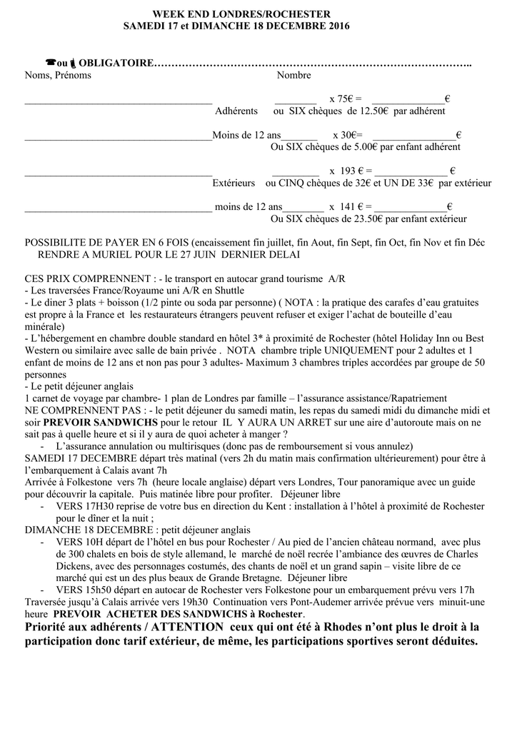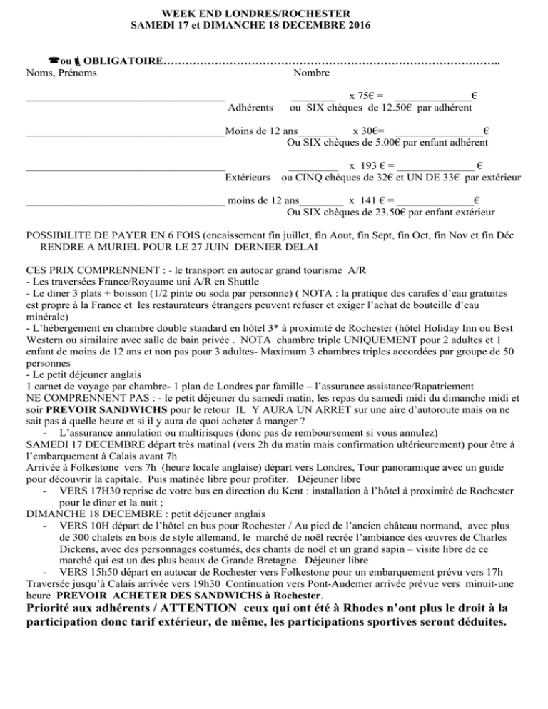 WEEK END LONDRES/ROCHESTER SAMEDI 17 et DIMANCHE 18 DECEMBRE 2016 ouOBLIGATOIRE……………………………………………………………………………….. Noms, Prénoms Nombre ____________________________________ Adhérents ________ x 75€ = ______________€ ou SIX chèques de 12.50€ par adhérent ____________________________________Moins de 12 ans_______ x 30€= ________________€ Ou SIX chèques de 5.00€ par enfant adhérent ____________________________________ Extérieurs _________ x 193 € = ______________ € ou CINQ chèques de 32€ et UN DE 33€ par extérieur ____________________________________ moins de 12 ans________ x 141 € = ______________€ Ou SIX chèques de 23.50€ par enfant extérieur POSSIBILITE DE PAYER EN 6 FOIS (encaissement fin juillet, fin Aout, fin Sept, fin Oct, fin Nov et fin Déc RENDRE A MURIEL POUR LE 27 JUIN DERNIER DELAI CES PRIX COMPRENNENT : - le transport en autocar grand tourisme A/R - Les traversées France/Royaume uni A/R en Shuttle - Le diner 3 plats + boisson (1/2 pinte ou soda par personne) ( NOTA : la pratique des carafes d’eau gratuites est propre à la France et les restaurateurs étrangers peuvent refuser et exiger l’achat de bouteille d’eau minérale) - L’hébergement en chambre double standard en hôtel 3* à proximité de Rochester (hôtel Holiday Inn ou Best Western ou similaire avec salle de bain privée . NOTA chambre triple UNIQUEMENT pour 2 adultes et 1 enfant de moins de 12 ans et non pas pour 3 adultes- Maximum 3 chambres triples accordées par groupe de 50 personnes - Le petit déjeuner anglais 1 carnet de voyage par chambre- 1 plan de Londres par famille – l’assurance assistance/Rapatriement NE COMPRENNENT PAS : - le petit déjeuner du samedi matin, les repas du samedi midi du dimanche midi et soir PREVOIR SANDWICHS pour le retour IL Y AURA UN ARRET sur une aire d’autoroute mais on ne sait pas à quelle heure et si il y aura de quoi acheter à manger ? - L’assurance annulation ou multirisques (donc pas de remboursement si vous annulez) SAMEDI 17 DECEMBRE départ très matinal (vers 2h du matin mais confirmation ultérieurement) pour être à l’embarquement à Calais avant 7h Arrivée à Folkestone vers 7h (heure locale anglaise) départ vers Londres, Tour panoramique avec un guide pour découvrir la capitale. Puis matinée libre pour profiter. Déjeuner libre - VERS 17H30 reprise de votre bus en direction du Kent : installation à l’hôtel à proximité de Rochester pour le dîner et la nuit ; DIMANCHE 18 DECEMBRE : petit déjeuner anglais - VERS 10H départ de l’hôtel en bus pour Rochester / Au pied de l’ancien château normand, avec plus de 300 chalets en bois de style allemand, le marché de noël recrée l’ambiance des œuvres de Charles Dickens, avec des personnages costumés, des chants de noël et un grand sapin – visite libre de ce marché qui est un des plus beaux de Grande Bretagne. Déjeuner libre - VERS 15h50 départ en autocar de Rochester vers Folkestone pour un embarquement prévu vers 17h Traversée jusqu’à Calais arrivée vers 19h30 Continuation vers Pont-Audemer arrivée prévue vers minuit-une heure PREVOIR ACHETER DES SANDWICHS à Rochester. Priorité aux adhérents / ATTENTION ceux qui ont été à Rhodes n’ont plus le droit à la participation donc tarif extérieur, de même, les participations sportives seront déduites.