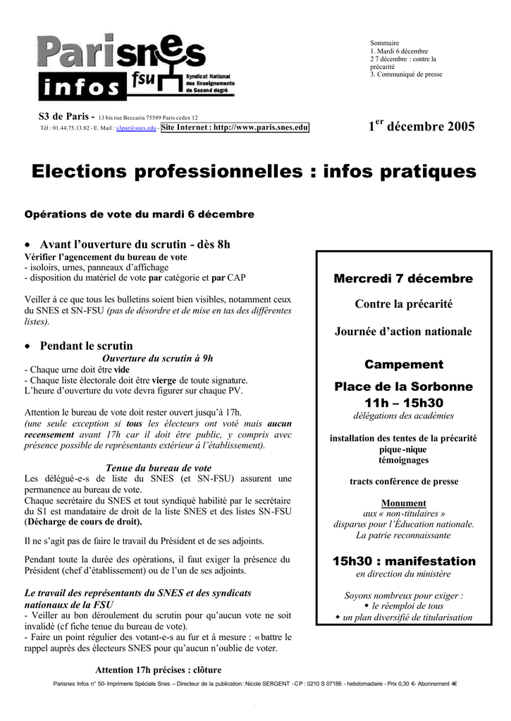 Sommaire 1. Mardi 6 décembre 2 7 décembre : contre la précarité 3. Communiqué de presse S3 de Paris - 13 bis rue Beccaria 75589 Paris cedex 12 Tél : 01.44.75.13.82 - E. Mail : [email protected] - Site Internet : http://www.paris.snes.edu 1er décembre 2005 Elections professionnelles : infos pratiques Opérations de vote du mardi 6 décembre • Avant l’ouverture du scrutin - dès 8h Vérifier l’agencement du bureau de vote - isoloirs, urnes, panneaux d’affichage - disposition du matériel de vote par catégorie et par CAP Mercredi 7 décembre Veiller à ce que tous les bulletins soient bien visibles, notamment ceux du SNES et SN-FSU (pas de désordre et de mise en tas des différentes listes). Contre la précarité Journée d’action nationale • Pendant le scrutin Ouverture du scrutin à 9h Campement - Chaque urne doit être vide - Chaque liste électorale doit être vierge de toute signature. L’heure d’ouverture du vote devra figurer sur chaque PV. Attention le bureau de vote doit rester ouvert jusqu’à 17h. (une seule exception si tous les électeurs ont voté mais aucun recensement avant 17h car il doit être public, y compris avec présence possible de représentants extérieur à l’établissement). Tenue du bureau de vote Les délégué-e-s de liste du SNES (et SN-FSU) assurent une permanence au bureau de vote. Chaque secrétaire du SNES et tout syndiqué habilité par le secrétaire du S1 est mandataire de droit de la liste SNES et des listes SN-FSU (Décharge de cours de droit). Il ne s’agit pas de faire le travail du Président et de ses adjoints. Place de la Sorbonne 11h – 15h30 délégations des académies installation des tentes de la précarité pique -nique témoignages tracts conférence de presse Monument aux « non-titulaires » disparus pour l’Éducation nationale. La patrie reconnaissante Pendant toute la durée des opérations, il faut exiger la présence du Président (chef d’établissement) ou de l’un de ses adjoints. 15h30 : manifestation Le travail des représentants du SNES et des syndicats nationaux de la FSU Soyons nombreux pour exiger : w le réemploi de tous w un plan diversifié de titularisation - Veiller au bon déroulement du scrutin pour qu’aucun vote ne soit invalidé (cf fiche tenue du bureau de vote). - Faire un point régulier des votant-e-s au fur et à mesure : « battre le rappel auprès des électeurs SNES pour qu’aucun n’oublie de voter. en direction du ministère Attention 17h précises : clôture Parisnes Infos n° 50- Imprimerie Spéciale Snes – Directeur de la publication : Nicole SERGENT - CP : 0210 S 07186 - hebdomadaire - Prix 0,30 €- Abonnement 4€ 1 Mardi 6 décembre Elections professionnelles CAPA - CAPN S3 de Paris A mettre à disposition des délégué-e-s SNES Tenue des Bureaux de vote dans les S1 ü Matériel de vote Veiller à ce que chaque électeur(trice) prenne bien les bulletins de vote correspondant à sa catégorie : w Agrégés – certifiés/AE – CPE (DCIO et Co-Psy dans les CIO) matériel bleu (CAPA) et matériel blanc (CAPN) « enveloppe n°1 » contient le bulletin de vote w PEGC – MI-SE matériel bleu (CAPA ou CPCA) w Chaire supérieure matériel blanc (CAPN) « enveloppe n°2 » ü Opérations successives : vote CAPA, vote CAPN Bien donner les indications à chacun (cf comment voter) Pour chaque vote, respecter l’ordre des opérations 1) Signature de la liste électorale CAPA ou CAPN. 2) Vérification enveloppe n°2 = nom, prénom, signature ; enveloppe cachetée. à Bien respecter couleur, modalités 3) Glisser enveloppe n°2 dans l’urne. Attention : sur l’enveloppe n°2, le nom d’électeur(trice) doit être le même que celui qui figure sur la liste électorale et la signature en conformité avec ce nom (nom d’usage parfois différent du nom déclaré à l’administration). 2 à Ne pas oublier de signer chaque liste électorale A 17h : recensement des votes Opération très importante à contrôler Aucun dépouillement dans l’établissement ! C’est le Président qui est responsable du recencement. Les représentant-e-s de listes ont droit à en contrôler chaque phase. v Recensement des votes directs v Confection des plis d’envoi Au fur et à mesure, on met sous enveloppe par corps et par CAP. Quand le recensement des votes directs et par correspondance est effectué et les 2 PV établis pour un corps et une CAP. Sont donc mis sous enveloppe (pli d’envoi) Il faut procéder par catégorie et par CAP . Un procès verbal (PV) est établi à chaque fois. Ex : certifiés/AE : CAPA puis CAPN (ou vice versa) - On compte le nombre de votants : décompte des enveloppes n°2 et des signatures sur liste électorale (il doit y avoir concordance !) Vérifier bien que les enveloppes n°2 sont cachetées. On établit le PV. Toute remarque ou anomalie constatée peut être portée au PV Chaque PV est signé par le Président et les représentants de liste. v Faire la même chose pour le recensement des votes par correspondance (Procès-verbal particulier). Ouverture des enveloppes d’expédition dites n°3 (être attentif au contenu : 2 enveloppes ou 1 enveloppe). Le Président émarge la liste électorale des votes par correspondance en face du nom de l’électeur et pour chaque CAP et indique la mention VPC. Sont mises à part (mais à joindre au PV) - les enveloppes n°3 qui n’auraient pas fait l’objet d’un envoi postal ou parvenues après 17h. Pour chaque corps et chaque CAP - toutes les enveloppes n°2 de la CAP concernée (votes directs et votes par correspondance). - la liste électorale émargée - les PV (1 PV votes directs ; 1 PV vote par correspondance) - les enveloppes mises à part. Vérifier bien que tout y soit. Chaque pli est cacheté et scellé. Récapitulatif : il y a donc - 2 plis pour certifiés/AE ; 2 plis pour agrégés ; 2 plis pour CPE - 1 pli pour PEGC ; 1 pli pour MI-SE ; 1 pli pour chaire supérieure. (et aussi autres corps : 2 plis