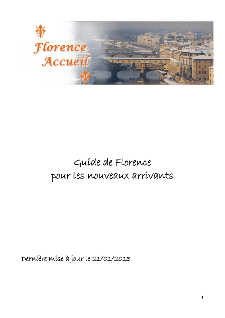 Guide de Florence pour les nouveaux arrivants Dernière mise à jour le 21/01/2013 1 Bienvenue à Florence ! Les informations contenues dans ce guide visent à faciliter votre installation et votre intégration à Florence. Elles sont données à titre indicatif et ne sont évidemment pas exhaustives. Nous espérons néanmoins que ce livret vous sera utile pour « démarrer » dans la ville et sera un utile complément à notre forum, plate-forme d’échanges des bons plans de nos membres. http://fr.groups.yahoo.com/group/florenceaccueil/, N’hésitez pas à nous faire part de vos commentaires et remarques, sur [email protected]. Bonne lecture, 2 SOMMAIRE En guise d’introduction : check list de départ / avant de quitter la France Partie I - S’installer à Florence Formalités administratives La santé Se loger Les écoles La voiture et autres transports Partie II - Vie pratique, bonnes adresses Dépannage et entretien Les animaux Le coin des gourmands Le coin shopping et beauté Le coin culture Le coin des sportifs Le coin Bimbi Partie III – Baby-sitters et adresses médicales recommandées par Florence Accueil Liste des baby- sitters Liste des praticiens médicaux Les jours fériés et fêtes traditionnelles à Florence Numéros utiles 3 En guise d’introduction : avant de quitter la France Félicitations pour votre expatriation, l'une des expériences personnelles et familiales les plus enrichissantes. Vous qui arrivez dans les semaines/mois qui viennent avez certainement beaucoup d'interrogations! Voici quelques infos pour vous aider à « démarrer ». N’hésitez pas à solliciter Florence Accueil à nouveau, nous vous aiderons avec le plus grand plaisir ! 4 sécurité sociale : ne pas quitter la France sans avoir obtenu la carte sanitaire européenne, dont vous devez faire une demande auprès du bureau de sécurité sociale dont vous dépendez ; cette carte couvre les soins urgents dans une première période. couverture médicale/assurance santé : si votre conjoint travaille en Italie, vérifiez-bien ce qui est prévu par son employeur localement en Italie; sinon, des assurances privées peuvent être souscrites, soit par l’employeur, soit par vous directement. (Tessera Sanitaria en local ou assurances pour expatriés ; pour la Tessera Sanitaria, il n’est malheureusement pas possible d’avoir un interlocuteur spécialisé sur l’international et le rendez-vous n’est pas facile ; prévoyez les mêmes documents que pour la Résidence, et une personne qui vous aide en italien si votre niveau n’est pas suffisant). assurances : vérifier l’étendue géographique de vos assurances actuelles (et les clauses spécifiques éventuelles en cas d’expatriation), notamment la responsabilité civile, l’assurance auto. L’assurance habitation est utile même si vous êtes locataires. Mr Michel Cohen, francophone et installé de longue date en Italie, qui gère de nombreuses familles de l'Eurofort et de l'école Française -et l'école elle-même Mr Michel COHEN, Gruppo SAI Fondiaria, (Via cassia 170-5023 TAVARNUZZE, près de Florence). Mobile: 335 5866 324, Fixe 055 237 45 39, [email protected], Il est plus facilement joignable sur son portable, ou passe vous voir à domicile à Florence. Mr Cohen cite souvent la « RC du chef de famille à 40/50 euros ». courrier : la poste offre des forfaits 6 mois et an renouvelables pour faire suivre votre courrier à votre nouvelle adresse– coût de mémoire de 100 euros/an- et vous transmets régulièrement tout votre courrier ; possibilité d’inclure le nom des parents et des enfants. en cas de démission pour suivi de conjoint /chômage en cours en France : prenez impérativement rendez-vous avec Pole Emploi en France AVANT votre départ, et signalez votre départ en Italie ; Pole Emploi vous fournira des formulaires à présenter à votre arrivée en Italie ; attention vous devrez ensuite vous présenter à l’équivalent de Pole Emploi en Italie (Centro Per L’impiego+INPS, dans la même journée) dans un délai de 7 jours suivant votre rendez-vous avec Pole Emploi en France. déclaration aux services fiscaux français mentionner votre départ en Italie, ils vous indiqueront un bureau spécialisé dans les déclarations des français à l’étranger. banque : vérifier auprès de votre banque française les frais assortis aux virements de France en Italie ; clôturer vos PEA (qui ne sont accessibles qu’aux résidents français). vaccins: mieux vaut les mettre à jour avant de partir et programmer les rappels lors de vos retours en France ; en effet les vaccins italiens ne sont pas regroupés de la même manière que les vaccins français. Puis faites faire les vaccins « panachages français » en bonne date lors de vos séjours en France. 5 Partie I S’installer à Florence Dans cette partie, sont listées toutes les déclarations administratives obligatoires. Nous avons également répertoriées les adresses qui faciliteront votre installation 6 Les formalités administratives Le Codice Fiscale Vous obtiendrez ce numéro indispensable sur présentation d’une carte d’identité ou d’un passeport auprès de l’Agenzia delle Entrate. Une carte verte vous sera remise à l’issue de votre demande, cette carte vous sera demandée très souvent dans votre vie quotidienne. Elle est indispensable. Agenzia delle entrate Via di san Caterina d’Alessandria tel :055 50 51 41 Inscription auprès du bureau d’état civil ou « Anagrafe » de Florence ou à la mairie de votre commune Anagrafe Via Petrapiana 25 (bâtiment de la poste) Pour un séjour entre 3 et 12 mois : inscription au bureau des populations temporaires. Les documents à fournir sont les suivants : Pour les étudiants Doc attestant l’inscription à une institution public ou privée Doc justifiant des ressources financières suffisantes Carte européenne de sécurité sociale Pour les travailleurs 1 contrat de travail Pour les conjoints et mineurs Docu