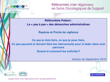GEX PATIENT Référentiels Patient Le « Pas à pas » des démarches administratives Référentiels Patient : Le « pas à pas » des démarches administratives Repères et Points de vigilance Ce que je dois faire, ce que je peux faire, Ce que peuvent et doivent faire les intervenants pour m’aider dans mon parcours Quand et comment les solliciter? Version de Septembre 2016 GEX PATIENT Copyright AFSOS, version validée décembre 2015, actualisée septembre 2016 1 1 GEX PATIENT Contributeurs Référentiels Patient Le « Pas à pas » des démarches administratives Coordonnateurs Savariaud Nathalie, Présidente Association Life is Rose ; Thirry Dominique, Directrice, Association Juris Santé, Lyon. Méthodologistes Farsi Fadila, oncologue, Lyon; Dumont Marjorie, assistante projets, Lyon. Membres du groupe de travail et du gex patient Barruel-Sinemale Florence, Psychologue, Montfermeil ; Baroth Pierre, Juriste, Lyon ; Bas Karine, Juriste, Lyon ; Blanchard Anne, Paris ; Carretier Julien, Méthodologiste, Centre Léon Bérard ; Cerisey Catherine, co-fondatrice ; Patients and Web, Gentilly ; Delestit Corinne, Lyon; Dufranc Céline, Rose Association ; Garcia Coline, Juriste, Lyon ; Farsi Fadila, oncologue, directeur RRC, Lyon ; Krakowski Ivan, Oncologue médical , Bordeaux ; Le Ravallec Lauriane, Juriste, Lyon ; Lores Océane, RRH, Lyon ; Marisco Giovanna, Cancer Contribution ; Mostefaoui Naoëlle, Juriste, Lyon; Savariaud Nathalie, Présidente, Association Life is Rose ; Scotte Florian, Oncologue, Paris ; Simonet Orianne, Juriste, Lyon ; Thirry Dominique, Directrice, Association Juris Santé, Lyon ; Thomas Michèle, ARTUR; Verdure Anaïs, Juriste, Lyon. Participants aux ateliers des J2R du 10/12/2015 Chateil Stéphane, Coordonnateur administratif, Amiens ; Leroux Marie-Hélène, Cadre de santé, Nantes ; Nimubona Donavine, Médecin coordinateur, Rennes ; Rhouni Samia, Assistante projet RRC, Vandoeuvre-lès-Nancy ; Rufin-Duhamel Guy-Albert, Coordonnateur, Fort de France ; Delbegue MarieAnge, IDE annonce, Nantes ; Bonvent Viviane, Cadre de santé, Fort-de-France ; Pelé Solen, Chef de projet Nantes ; Gerat-Muller Véronique, Psychologue, Bordeaux. Relecteurs Berardo Nicole, Association Provence Stomie Contact, Monteux ; Bertou Jean-Louis, Président, Association France Colon, Forcalquier ; Besse Sandrine, Centre Azuréen de cancérologie, Mougins ; Billot Evelyne, Assistante sociale, Centre Georges-François Leclercq, Dijon ; Brousse Annie, Secrétaire Générale, Vivre Comme Avant, Lille ; Brunet Majid, Chef de projets, Réseau Espace Santé Cancer, Lyon ; Carpentier Lyliane, Présidente, Audelà du Cancer, Dunkerque ; Chaptal Charlotte, Assistante Sociale, Centre Jean Perrin, Clermont-Ferrand ; Claret Céline, Assistante Sociale, Centre Oscar Lombret, Lille ; Dewas Sylvie, Oncologue Radiothérapeute, Centre Radiothérapie Bourgogne, Lille ; Duffaud Florence , Chef de service oncologie médicale et soins palliatifs, CHU Timone, Marseille ; Duquesne Karine, Correspondante régionale Nord Pas de Calais France Lymphome Espoir ; Duval Betty, cadre socio-éducatif, CHU Timone, Marseille ; Fantoni Sophie, Médecin du travail et pathologie professionnelle, CHRU Lille – Hôpital Huriez, Lille ; Ferrand Natalie, IDE, Groupe Hospitalier mutualiste de Grenoble, Grenoble ; Fouchard Brigitte, assistante sociale, CARSAT, Besançon ; Frimat Paul, Président, Plateforme téléphonique Santé Emploi Info Service ; Garnier Virginie, Assistante sociale, Clinique de l’Alliance, Saint-Cyr-Sur-Loire ; Gautheron Laura, Chargée de projet, Réseau Espace Santé Cancer, Lyon ; Gey Thomas, Pneumologue, Clinique Teissier, Valenciennes ; Guguen Bénédicte, Cadre socio-éducatif, CH Bretagne Atlantique, Vannes ; Julhiet Diane, Présidente, Association HNPCC Lynch ; Klein Isabelle, Médecin coordonnateur, réseau Oncolor, Vandoeuvre les Nancy ; Knoche Anne- Bé, Responsable organisation et communication, EFEC, Paris ; LabrosseCanat Hélène, Chef de projets, Réseau Espace Santé Cancer, Lyon ; Laine Anne-Lise, Responsable pole social, Institut Paoli Calmette, Marseille ; Lemonnier Evelyne, assistante sociale, CARSAT, Besançon ; Mekil Claude, IDE stomathérapeute, Hôpital Privé, Villeneuve d’Asq ; Metayer Sylvie, Coordonnateur, Réseau Oncovannes, Vannes ; Meyrieux Charlotte, responsable qualité, Institut Sainte Catherine, Avignon ; Noel Marie-Pierre, Hématologue, CHU, Lille ; Paris Véronique, assistante sociale, CARSAT, Besançon ; Plancon Morgane, Médecin de la douleur et médecin palliatif, Centre Hospitalier, Valenciennes ; Reich Michel, psychiatre, Centre Oscar Lambret, Lille ; Rolland Lydie, Psychologue, Clinique d’Argonnay, Argonnay ; Russo Elisabeth, Responsable secrétariat médical et archives, Institut Paoli Calmette, Marseille ; Sanglier Claude, Bénévole, Comité départemental ligue contre le cancer, Trégueux ; Shoemacker Grégory, Assistant social, Centre hospitalier, Dunkerque ; Sierra Karine, Assistante Sociale, Centre Antoine Lacassagne, Nice ; Verland Célia, Coordinatrice réseau, CISS Haute Normandie, Rouen ; Vincent Lionel, Oncologue médical, Centre hospitalier, Roanne ; Walter Sabine, Médecin Coordonnateur, 3C Var Est, Draguignan, Watcher Thierry, Chef de service oncologie radiothérapie, Centre hospitalier régional, Orléans ; Worms Anne, psychologue, Centre hospitalier régional, Orléans ; Zaccagnigni Catherine, assistante sociale, Réseau Betek Pen,AFSOS, Quimper. Copyright version validée décembre 2015, actualisée septembre 2016 2 GEX PATIENT Référentiels Patient Le « Pas à pas » des démarches administratives Référentiels Patient : Le « Pas à pas » des démarches administratives Objectifs des référentiels 4 Les étapes / les démarches 5 Référentiel 1 : Dès le début de votre maladie / de votre parcours de soins 6 Référentiel 2 : Dès que possible 21 Référentiel 3 : A tout moment 26 Référentiel 4 : A la fin de vos traitements ou pendant vos traiteme