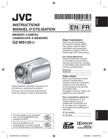 INSTRUCTIONS MANUEL D’UTILISATION MEMORY CAMERA CAMÉSCOPE À MÉMOIRE GZ-MS120 U EN FR ENGLISH LYT1995-001B-M Dear Customers Thank you for purchasing this memory camera. Before use, please read the safety information and precautions contained in pages 2 and 3 to ensure safe use of this product. For Future Reference: Enter the Model No. (located on the bottom of the memory camera) and Serial No. (located on the battery pack mount of the memory camera) below. Model No. Serial No. Cher client, Please read the instruction manual prior to connecting or operating this product. Por favor, lea el manual de instrucciones antes de conectar u operar este producto. Nous vous remercions d’avoir acheté ce caméscope à mémoire. Avant de commencer, veuillez lire les informations et les précautions de sécurité présentées dans les pages 2 et 3 pour utiliser cet appareil en toute sécurité. Pour consultation ultérieure: Noter ci-dessous le N° de modèle (figurant sous le caméscope à mémoire) et le N° de série (sur le logement de la batterie du caméscope à mémoire). N° de série FRANÇAIS N° de modèle For more details on the operations, refer to the GUIDEBOOK in the supplied CD-ROM. Pour plus de détails sur son fonctionnement, consultez le GUIDE D’UTILISATION dans le CD-ROM fourni. GZ-MS120UC_IB_EN.indb 1 4/30/2009 1:22:08 PM Safety Precautions CAUTION RISK OF ELECTRIC SHOCK DO NOT OPEN CAUTION: TO REDUCE THE RISK OF ELECTRIC SHOCK, DO NOT REMOVE COVER (OR BACK). NO USER-SERVICEABLE PARTS INSIDE. REFER SERVICING TO QUALIFIED SERVICE PERSONNEL. The lightning flash with arrowhead symbol, within an equilateral triangle, is intended to alert the user to the presence of uninsulated "dangerous voltage" within the product's enclosure that may be of sufficient magnitude to constitute a risk of electric shock to persons. The exclamation point within an equilateral triangle is intended to alert the user to the presence of important operating and maintenance (servicing) instructions in the literature accompanying the appliance. WARNING: TO PREVENT FIRE OR SHOCK HAZARD, DO NOT EXPOSE THIS UNIT TO RAIN OR MOISTURE. NOTES: •The rating plate and safety caution are on the bottom and/or the back of the main unit. •The serial number plate is on the battery pack mount. •The rating information and safety caution of the AC adapter are on its upper and lower sides. For USA-California Only This product contains a CR Coin Cell Lithium Battery which contains Perchlorate Material – special handling may apply. See www.dtsc.ca.gov/hazardouswaste/perchlorate When the equipment is installed in a cabinet or on a shelf, make sure that it has sufficient space on all sides to allow for ventilation (10 cm (3-15/16 ") or more on both sides, on top and at the rear). Do not block the ventilation holes. (If the ventilation holes are blocked by a newspaper, or cloth etc. the heat may not be able to get out.) No naked flame sources, such as lighted candles, should be placed on the apparatus. When discarding batteries, environmental problems must be considered and the local rules or laws governing the disposal of these batteries must be followed strictly. The apparatus shall not be exposed to dripping or splashing. Do not use this equipment in a bathroom or places with water. Also do not place any containers filled with water or liquids (such as cosmetics or medicines, flower vases, potted plants, cups etc.) on top of this unit. (If water or liquid is allowed to enter this equipment, fire or electric shock may be caused.) Do not point the lens directly into the sun. This can cause eye injuries, as well as lead to the malfunctioning of internal circuitry. There is also a risk of fire or electric shock. CAUTION! The following notes concern possible physical damage to the camcorder and to the user. Carrying or holding the camcorder by the LCD monitor can result in dropping the unit, or in a malfunction. Do not use a tripod on unsteady or unlevel surfaces. It could tip over, causing serious damage to the camcorder. CAUTION! Connecting cables (Audio/Video, S-Video, etc.) to the camcorder and leaving it on top of the TV is not recommended, as tripping on the cables will cause the camcorder to fall, resulting in damage. CAUTION: The mains plug shall remain readily operable. WARNING: The battery pack and the camcorder with battery installed should not be exposed to excessive heat such as direct sunshine, fire or the Iike. GZ-MS120UC_IB_EN.indb 2 4/14/2009 2:07:31 PM 1. 2. 3. 4. 5. 6. 7. Read these instructions. Keep these instructions. Heed all warnings. Follow all instructions. Do not use this apparatus near water. Clean only with dry cloth. Do not block any ventilation openings. Install in accordance with the manufacturer’s instructions. 8. Do not install near any heat sources such as radiators, heat registers, stoves, or other apparatus (including amplifiers) that produce heat. 9. Only use attachments/accessories specified by the manufacturer. 10.Use only with the cart, stand, tripod, bracket, or table specified by the manufacturer, or sold with the apparatus. When a cart is used, use caution when moving the cart/apparatus combination to avoid injury from tip-over. 11.Unplug this apparatus during lightning storms or when unused for long periods of time. 12.Refer all servicing to qualified service personnel. Servicing is required when the apparatus has been damaged in any way, such as power-supply cord or plug is damaged, liquid has been spilled or objects have fallen into the apparatus, the apparatus has been exposed to rain or moisture, does not operate normally, or has been dropped. Remember that this camcorder is intended for private consumer use only. Any commercial use without proper permission is prohibited. (Even if you record an event such as a show, performance or exhibition for personal enjoyment, it is strongly recommended that you obtain permission beforehand.) ENGLISH IMPORTANT SAFETY INSTRUCTIONS Tra