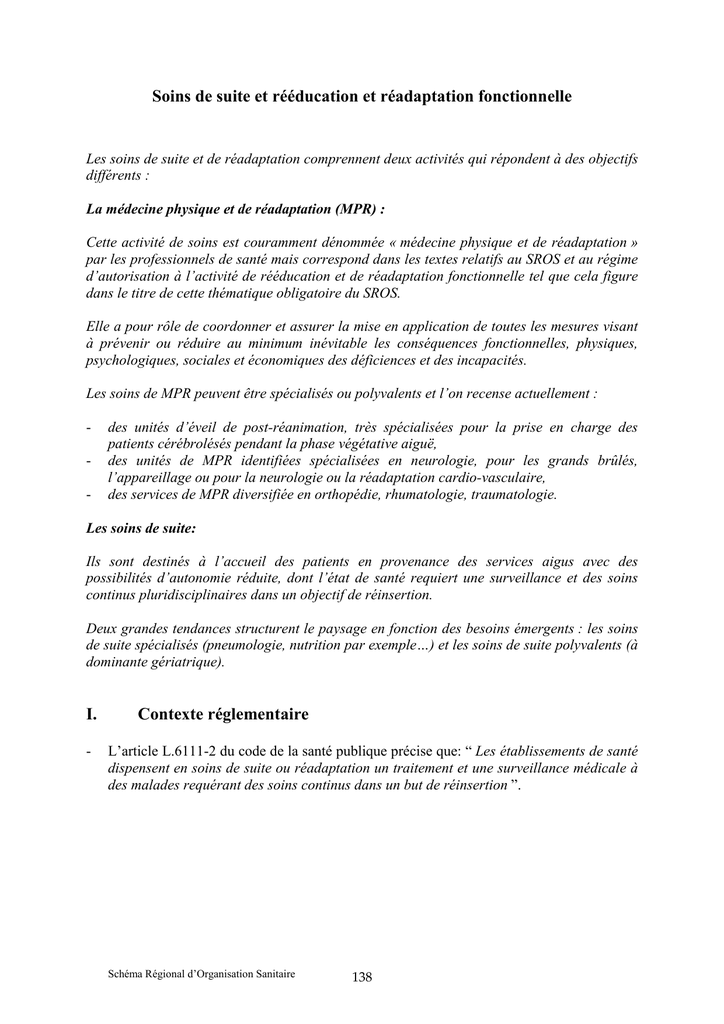 Soins de suite et rééducation et réadaptation fonctionnelle Les soins de suite et de réadaptation comprennent deux activités qui répondent à des objectifs différents : La médecine physique et de réadaptation (MPR) : Cette activité de soins est couramment dénommée « médecine physique et de réadaptation » par les professionnels de santé mais correspond dans les textes relatifs au SROS et au régime d’autorisation à l’activité de rééducation et de réadaptation fonctionnelle tel que cela figure dans le titre de cette thématique obligatoire du SROS. Elle a pour rôle de coordonner et assurer la mise en application de toutes les mesures visant à prévenir ou réduire au minimum inévitable les conséquences fonctionnelles, physiques, psychologiques, sociales et économiques des déficiences et des incapacités. Les soins de MPR peuvent être spécialisés ou polyvalents et l’on recense actuellement : - des unités d’éveil de post-réanimation, très spécialisées pour la prise en charge des patients cérébrolésés pendant la phase végétative aiguë, des unités de MPR identifiées spécialisées en neurologie, pour les grands brûlés, l’appareillage ou pour la neurologie ou la réadaptation cardio-vasculaire, des services de MPR diversifiée en orthopédie, rhumatologie, traumatologie. Les soins de suite: Ils sont destinés à l’accueil des patients en provenance des services aigus avec des possibilités d’autonomie réduite, dont l’état de santé requiert une surveillance et des soins continus pluridisciplinaires dans un objectif de réinsertion. Deux grandes tendances structurent le paysage en fonction des besoins émergents : les soins de suite spécialisés (pneumologie, nutrition par exemple…) et les soins de suite polyvalents (à dominante gériatrique). I. - Contexte réglementaire L’article L.6111-2 du code de la santé publique précise que: “ Les établissements de santé dispensent en soins de suite ou réadaptation un traitement et une surveillance médicale à des malades requérant des soins continus dans un but de réinsertion ”. Schéma Régional d’Organisation Sanitaire 138 - La circulaire n° 97-841 du 31 décembre 1997 définit 5 fonctions de soins techniques d’accompagnement caractérisant la prise en charge en soins de suite ou de réadaptation dans un but de “ réinsertion des malades, de façon prioritaire à domicile ou parfois dans une institution sociale ou médico-sociale si leur état stabilisé le requiert ” : limitation des handicaps physiques, restauration somatique et psychologique, éducation du patient et éventuellement de son entourage, poursuite et suivi des soins et du traitement, préparation de la sortie et de la réinsertion. Contexte régional II. • Etat des lieux de l’équipement : La Haute-Normandie est dotée de 2 526 lits autorisés au 1er août 2005 soit 1,42 (dont 0,36 en MPR) lits pour 1 000 habitants pour un indice de besoins de 1,45 . Elle continue à présenter un déficit par rapport au niveau national (1,59 lits pour 1 000 habitants dont 0,54 en MPR) malgré un rattrapage certain. Ce défaut d’équipement est aggravé par le décalage entre les autorisations accordées et les capacités réellement installées qui atteste d’un déficit réel de près de 400 lits au total, au regard de l’indice régional des besoins. La Haute-Normandie figurait ainsi à la 21ème place des 22 régions de France métropolitaine en terme de taux d’équipement installé au 1er janvier 2004. Le taux d’équipement en places installées en MPR (3,87 places pour 100 000 habitants) reste encore moitié moindre qu’au niveau national, mais la mise en œuvre des autorisations accordées permettrait globalement la mise à niveau de la région. Toutefois, le territoire de Dieppe resterait encore sous doté, avec un taux d’équipement autorisé de 2,88. La répartition régionale demeure contrastée au sein de la région d’une part, entre les 4 territoires de santé, d’autre part, au regard des structures où les capacités sont implantées : - Territoire de Rouen-Elbeuf : 1.092 lits (43,2% des capacités 1,4 lits autorisés/1 000 habitants) Territoire du Havre : 526 lits (20,8% des capacités 1,16 lits autorisés/1 000 habitants) Territoire d’Evreux-Vernon : 766 lits (30,3% des capacités 2 lits autorisés/1 000 habitants) Territoire de Dieppe : 142 lits (5,6% des capacités 0,82 lits autorisés/1 000 habitants) régionales, régionales, régionales, régionales, S’agissant des structures, l’offre de soins de suite médicalisés polyvalents, plutôt à vocation de proximité, est souvent concentrée sur les grandes agglomérations. Schéma Régional d’Organisation Sanitaire 139 • - Identification des problématiques : Un manque de capacités et, parallèlement, une augmentation des besoins. Ainsi, l’augmentation prévisible de 37% de la population des plus de 75 ans à l’horizon 2010 devrait induire une augmentation du recrutement de 19% pour la période 2002-2010 de nature essentiellement gériatrique (pour la prise en charge de polypathologies, orthopédie gériatrique, AVC, démences...). En outre, l’existence d’indicateurs de morbi-mortalité péjoratifs en cancérologie et en alcoologie (notamment dans le territoire du Havre) doit faire porter une attention particulière dans ces domaines. - Un recours partiellement inapproprié faute de fluidité du secteur des SSR avec des disponibilités d’aval souvent insuffisantes (notamment dans la filière des cérébrolésés, l’accueil dans des institutions des adultes de moins de 60 ans lourdement dépendants, des personnes âgées lourdement malades ou dépendantes ainsi que dans le domaine du retour à domicile), un certain nombre d’inadéquations à l’entrée en SSR et des alternatives à l’hospitalisation complète insuffisamment développées. - Des besoins de prise en charge en SSR spécialisés ou très