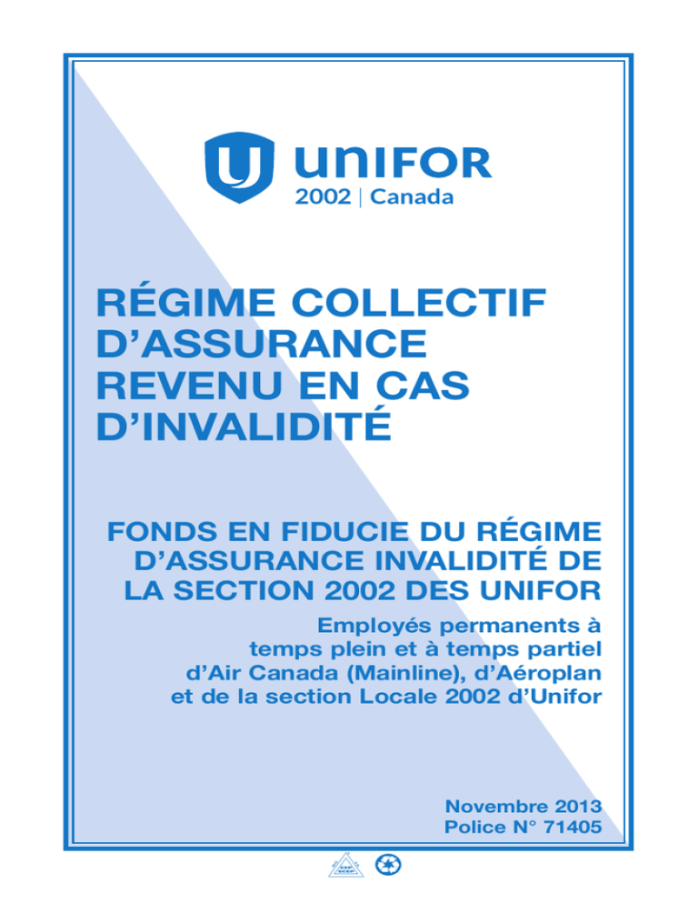 RÉGIME COLLECTIF D’ASSURANCE REVENU EN CAS D’INVALIDITÉ FONDS EN FIDUCIE DU RÉGIME D’ASSURANCE INVALIDITÉ DE LA SECTION 2002 DES UNIFOR Employés permanents à temps plein et à temps partiel d’Air Canada (Mainline), d’Aéroplan et de la section Locale 2002 d’Unifor Novembre 2013 Police N° 71405 Le présent régime est administré par CANADIAN BENEFITS CONSULTING GROUP LTD. Les indemnités d’invalidité de courte durée sont payées par CANADIAN BENEFITS CONSULTING GROUP LTD. 2300, rue Yonge bureau 3000 Toronto (Ontario) M4P 1E4 Téléphone : (416) 488-7755 Appels sans frais : 1-800-268-0285 Télécopieur : (416) 488-7774 et est établi par la FINANCIÈRE MANUVIE Les indemnités d’invalidité de longue durée sont établies et payées par la Financière Manuvie IMPORTANT La présente brochure est destinée à vous aider à mieux comprendre les modalités de votre régime collectif d’assurance revenu en cas d’invalidité. Toutefois, elle ne rem‑ place aucun contrat ou autre droit. S’il existe un conflit quelconque entre les termes de la police collective et ceux de la brochure, la police prévaudra en tout temps. Novembre 2013, Police n° 71405 PROTECTION DE VOS RENSEIGNEMENTS PERSONNELS À la Financière Manuvie, nous reconnaissons et nous respectons l’importance de la vie privée. Lorsque vous demandez une protection aux termes d’un régime collectif, la Financière Manuvie ouvre un dossier confidentiel contenant des renseignements personnels. Nous limitons l’accès aux renseignements personnels consignés à votre dossier aux membres du personnel de la Financière Manuvie ou aux personnes autorisées par cette dernière qui en ont besoin pour s’acquitter de leurs tâches, aux personnes à qui vous avez accordé un droit d’accès et aux personnes autorisées en vertu de la loi. Nous nous servons de ces renseignements pour la gestion du régime collectif aux termes duquel vous êtes couvert. Cela comprend notamment : • • • • • • • la détermination de votre admissibilité à la protection aux termes du régime l’adhésion à la protection l’évaluation de votre demande de règlement et le paiement des prestations la gestion de vos demandes de règlement la vérification et le contrôle de l’admissibilité et des demandes de règlement la tarification, comme la détermination du coût du régime et l’analyse des options du régime la préparation sur une base régulière de rapports, comme les reçus d’impôt Il se peut que nous échangions des renseignements personnels avec vos fournisseurs de soins, le gestionnaire de votre régime, d’autres compagnies d’assurance ou de réassurance, les administrateurs de régimes offerts par l’État ou d’autres régimes de garanties, d’autres organisations ou les fournisseurs de services qui travaillent avec nous, lorsque cela est nécessaire pour gérer le régime. Aux termes du présent régime, toutes les demandes de règlement sont présentées par votre entremise en qualité de participant du régime. Il se peut que nous partagions des renseignements personnels relatifs aux demandes de règlement avec vous et une personne agissant pour votre compte lorsque cela est nécessaire pour confirmer l’admissibilité et pour gérer mutuellement les demandes de règlement. Les renseignements personnels contenus dans votre dossier seront conservés dans les bureaux de la Financière Manuvie ou dans les bureaux d’une organisation autorisée par cette dernière. Vous pouvez demander d’examiner ou de rectifier les renseignements personnels contenus dans votre dossier. Toute demande d’examen ou de rectification doit être présentée par écrit et envoyée à tout bureau de la Financière Manuvie ou à notre siège social à l’adresse suivante : Vérification de la conformité, Collective la Financière Manuvie 500 King Street North Waterloo (Ontario) N2J 4C9 Les demandes de règlement ne doivent pas être envoyées à l’adresse précitée. Veuillez utiliser l’adresse figurant sur le formulaire de demande de règlement ou communiquer avec le gestionnaire de votre régime pour plus de précisions. Pour de plus amples renseignements en ce qui concerne nos lignes directrices en matière de confidentialité, veuillez demander la brochure de la Financière Manuvie intitulée Normes de confidentialité. Novembre 2013, Police n° 71405 RÉGIME COLLECTIF D’ASSURANCE REVENU EN CAS D’INVALIDITÉ Table des matières AVANT‑PROPOS.........................................................................................................1 INTRODUCTION........................................................................................................2 DÉFINITIONS GÉNÉRALES.....................................................................................3 CARACTÉRISTIQUES...............................................................................................4 QUI EST ADMISSIBLE À L’ASSURANCE.............................................................9 CESSATION DE L’ASSURANCE..............................................................................10 GÉNÉRALITÉS...........................................................................................................12 CONDITIONS APPLICABLES AU RÈGLEMENT DES SINISTRES....................13 SOMMAIRE DES GARANTIES................................................................................14 RÉGIME D’INVALIDITÉ DE COURTE DURÉE.....................................................15 PRESTATIONS DE MALADIE EN VERTU DE L’ASSURANCE‑EMPLOI..........21 RÉGIME D’INVALIDITÉ DE LONGUE DURÉE....................................................23 PROCÉDURE DE RÉVISION DE DOSSIER............................................................29 Ressources utiles : • Prestations de soignant • Programme de réadaptation et (ou) programme modifié de retour au travail • Remarques sur le stress/l’anxiét