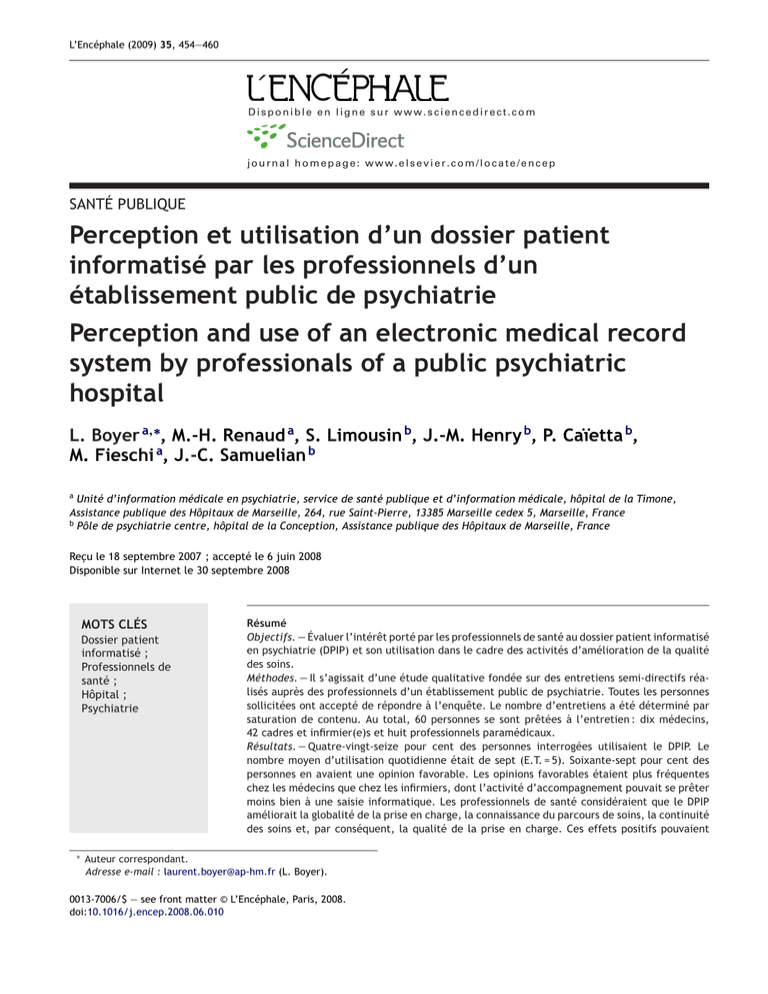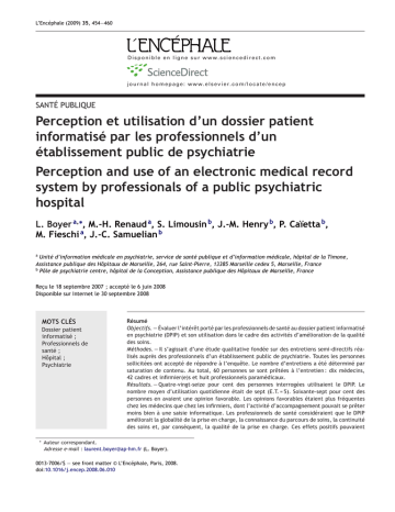 L’Encéphale (2009) 35, 454—460 Disponible en ligne sur www.sciencedirect.com journal homepage: www.elsevier.com/locate/encep SANTÉ PUBLIQUE Perception et utilisation d’un dossier patient informatisé par les professionnels d’un établissement public de psychiatrie Perception and use of an electronic medical record system by professionals of a public psychiatric hospital L. Boyer a,∗, M.-H. Renaud a, S. Limousin b, J.-M. Henry b, P. Caïetta b, M. Fieschi a, J.-C. Samuelian b a Unité d’information médicale en psychiatrie, service de santé publique et d’information médicale, hôpital de la Timone, Assistance publique des Hôpitaux de Marseille, 264, rue Saint-Pierre, 13385 Marseille cedex 5, Marseille, France b Pôle de psychiatrie centre, hôpital de la Conception, Assistance publique des Hôpitaux de Marseille, France Reçu le 18 septembre 2007 ; accepté le 6 juin 2008 Disponible sur Internet le 30 septembre 2008 MOTS CLÉS Dossier patient informatisé ; Professionnels de santé ; Hôpital ; Psychiatrie ∗ Résumé Objectifs. — Évaluer l’intérêt porté par les professionnels de santé au dossier patient informatisé en psychiatrie (DPIP) et son utilisation dans le cadre des activités d’amélioration de la qualité des soins. Méthodes. — Il s’agissait d’une étude qualitative fondée sur des entretiens semi-directifs réalisés auprès des professionnels d’un établissement public de psychiatrie. Toutes les personnes sollicitées ont accepté de répondre à l’enquête. Le nombre d’entretiens a été déterminé par saturation de contenu. Au total, 60 personnes se sont prêtées à l’entretien : dix médecins, 42 cadres et infirmier(e)s et huit professionnels paramédicaux. Résultats. — Quatre-vingt-seize pour cent des personnes interrogées utilisaient le DPIP. Le nombre moyen d’utilisation quotidienne était de sept (E.T. = 5). Soixante-sept pour cent des personnes en avaient une opinion favorable. Les opinions favorables étaient plus fréquentes chez les médecins que chez les infirmiers, dont l’activité d’accompagnement pouvait se prêter moins bien à une saisie informatique. Les professionnels de santé considéraient que le DPIP améliorait la globalité de la prise en charge, la connaissance du parcours de soins, la continuité des soins et, par conséquent, la qualité de la prise en charge. Ces effets positifs pouvaient Auteur correspondant. Adresse e-mail : [email protected] (L. Boyer). 0013-7006/$ — see front matter © L’Encéphale, Paris, 2008. doi:10.1016/j.encep.2008.06.010 Perception et utilisation d’un dossier patient informatisé par les professionnels 455 être remis en cause par une surcharge de travail liée au remplissage du DPIP (manque de connaissance technique et manque de matériel informatique, impossibilité de saisir en temps réel les données au lit du patient) et par certains dysfonctionnements du système informatique. Les deux conséquences principales pouvaient être le remplissage incomplet du DPIP et une réduction du temps consacré aux soins. Conclusion. — Ce travail propose des pistes d’amélioration dans l’utilisation du DPIP. Malgré cela, une véritable réflexion doit être initiée sur ces nouveaux systèmes d’information en psychiatrie, dont les objectifs réels peuvent être perçus comme ambigus par les utilisateurs, afin de mettre en place des programmes de clarification, d’éducation et de réassurance. © L’Encéphale, Paris, 2008. KEYWORDS Electronic medical files; Quality in health care; Care providers; Hospital; Psychiatry Summary Objectives. — The aim of this study was to evaluate the interest taken by the health care providers in the electronic medical file and its use within the quality improvement process. Setting. — Our institution is a 204-bed psychiatric hospital, employing 328 professionals and comprising three sectors: six units of complete hospitalisation (102 beds), one unit of week hospitalisation (15 beds), one unit of emergency (7 beds) and one unit of night hospitalisation (15 beds). Three extrahospital structures include the day hospitalisation (65 places), the medicopsychological centers (CMP) and the part-time therapeutic reception centers (CATTP) of the three sectors. Methods. — We conducted face-to-face, semi-structured interviews with health care providers of a public psychiatric hospital. All the solicited people agreed to answer the investigation. The interviews were conducted until no new ideas emerged in the content analysis performed in real time, comprising 60 care providers: 10 psychiatrists, 42 nurses and eight paramedical professionals. Content analysis was performed by two members of the steering committee who were skilled in textual analysis. A descriptive analysis was also performed. The variables were described by proportions and means. The proportions were compared using the Chi-squared test or Fisher exact test where appropriate. A two-tailed P-value of greater than 0.05 was considered to indicate statistical significance. Statistical analyses were carried out using SPSS version 13.0. Results. — Ninety-six percent of the interviewed subjects used the electronic medical file. The average number of daily use was seven (S.D. = 5). Sixty-seven percent had a favorable opinion of the electronic medical file. Physicians had more frequent favorable opinions than nurses who considered that electronic medical files cannot capture real nursing activity. Health care providers considered that electronic medical file could be associated with improved quality of care, but two points should be taken into account: the increased documentation time (slow system response, multiple screens, the lack of computer knowledge, the absence of bedside documentation technology. . .) and dysfunctions in the information processing system. This could have an impact on documentation completeness, and quality and could also lead to a reduction of time