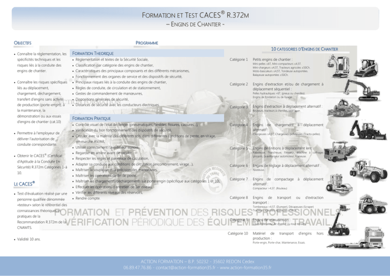 FORMATION ET TEST CACES® R.372M – ENGINS DE CHANTIER - OBJECTIFS PROGRAMME 10 CATEGORIES D’ENGINS DE CHANTIER Connaître la réglementation, les FORMATION THEORIQUE spécificités techniques et les Réglementation et textes de la Sécurité Sociale, risques liés à la conduite des Classification par catégorie des engins de chantier, engins de chantier. Caractéristiques des principaux composants et des différents mécanismes, Fonctionnement des organes de service et des dispositifs de sécurité, Connaître les risques spécifiques Principaux risques liés à la conduite des engins de chantier, liés au déplacement, Règles de conduite, de circulation et de stationnement, chargement, déchargement, Gestes de commandement de manœuvres, transfert d’engins sans activité Dispositions générales de sécurité, de production (porte-engin), à Distances de sécurité avec les conducteurs électriques. la maintenance, la démonstration ou aux essais d’engins de chantier (cat.10) Contrôle visuel de l’état de l’engin (pneumatiques, flexibles, fissures, cassures…), Vérification du bon fonctionnement des dispositifs de sécurité, Circuler avec la maîtrise des différents sols, dans différentes conditions de pente, en virage, Utiliser correctement l’avertisseur sonore, Regarder en arrière avant de reculer, Respecter les règles et panneaux de circulation, Adapter sa conduite aux conditions de circulation (encombrement, virage…), Maîtriser la souplesse et la précision des manœuvres, Maîtriser les opérations de fin de poste, Maîtriser les chargements/déchargements sur porte-engin (spécifique aux catégories 1 et 10), Effectuer les opérations d’entretien de 1er niveau, Test d’évaluation réalisé par une Vérifier les différents niveaux des réservoirs, personne qualifiée dénommée Rendre compte. délivrer l’autorisation de conduite correspondante. ® Obtenir le CACES (Certificat d’Aptitude à la Conduite En Sécurité) R.372m Catégories 1-à 10. ® LE CACES® Mini-pelles ≤6T, Mini-compacteurs ≤4,5T. Mini-chargeurs ≤4,5T, Tracteurs agricoles ≤50Ch. Moto-basculeurs ≤4,5T, Tondeuse autoportées. Balayeuse autoportées ≤50Ch. Catégorie 2 Catégorie 3 Engins d’extraction à déplacement alternatif : Catégorie 4 Engins de alternatif : Catégorie 5 à déplacement Engins de finitions à déplacement lent : Raboteuse, Trancheuse, Finisseur, Machine à coffrages glissants, Gravillonneur automoteur, Fraiseuse. Catégorie 6 Engins de réglage à déplacement alternatif : Niveleuse. Catégorie 7 Engins de alternatif : compactage à déplacement ou d’extraction Compacteur >4,5T. (Rouleau) Catégorie 8 Engins de transport : transport Tombereaux >4,5T. (Dumper), Décapeuses (Scraper) Tracteurs agricoles, épareuses >50Ch. Catégorie 9 Engins de manutention : Chariot élévateur de chantier ou tout-terrains. Catégorie 10 Validité 10 ans. chargement en marche AV/AR, CNAMTS. Bouteurs, tracteurs à chenilles, pipe layer. Chargeuses ≥4,5T, Chargeuses-pelleteuses (Tracto-pelles). connaissances théoriques et Recommandation R.372m de la Engins d’extraction et/ou de chargement à déplacement séquentiel : Pelles hydrauliques >6T. (pneus ou chenilles). Engins de fondation ou de forage. «testeur» selon le référentiel des pratiques de la Petits engins de chantier : FORMATION PRATIQUE Permettre à l’employeur de Catégorie 1 Matériel de production : transport d’engins Porte-engin, Porte-char, Maintenance, Essais. ACTION FORMATION – B.P. 50232 - 35602 REDON Cedex 06.89.47.76.86 - [email protected] - www.action-formation35.fr hors