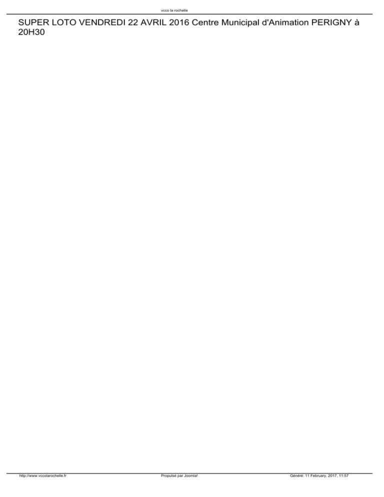 vcco la rochelle SUPER LOTO VENDREDI 22 AVRIL 2016 Centre Municipal d'Animation PERIGNY à 20H30 http://www.vccolarochelle.fr Propulsé par Joomla! Généré: 11 February, 2017, 11:57