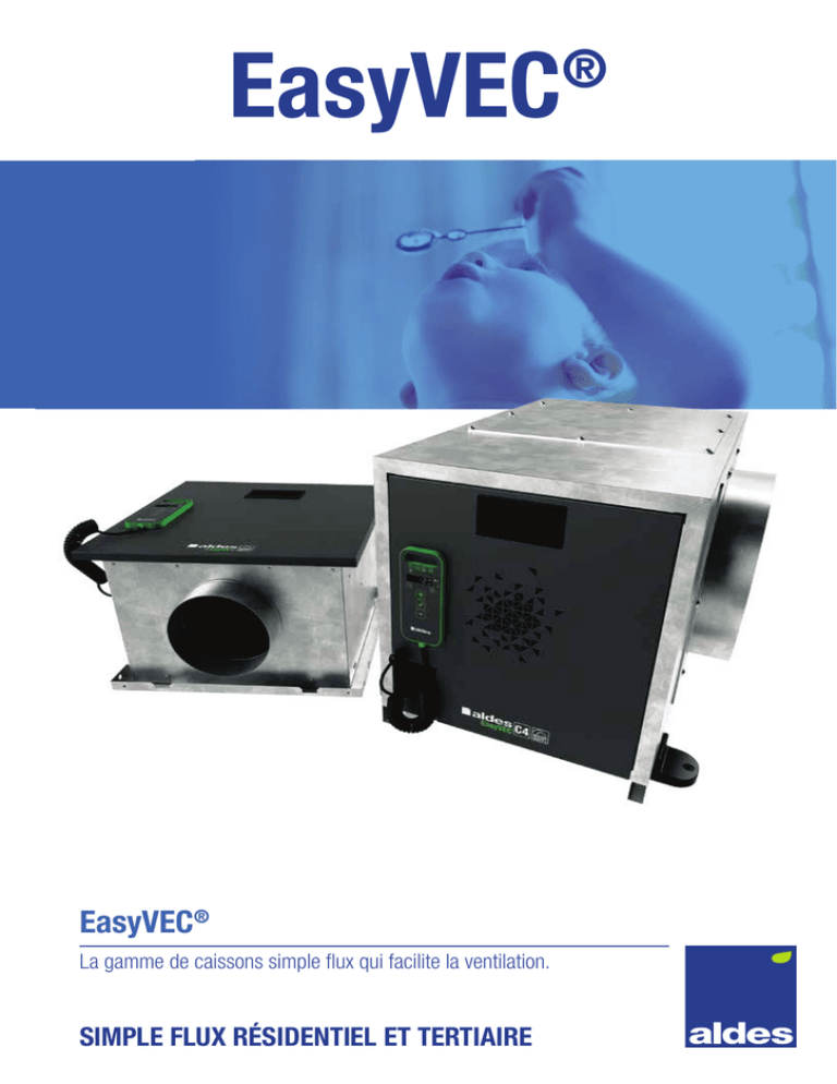 ® EasyVEC EasyVEC® La gamme de caissons simple flux qui facilite la ventilation. SIMPLE FLUX RÉSIDENTIEL ET TERTIAIRE 2 SOMMAIRE Présentation . . . . . . . . . . . . . . Gamme . . . . . . . . . . . . . . . Caractéristiques générales . . . . . Options . . . . . . . . . . . . . . . . Accessoires . . . . . . . . . . . . . . Principe technique . . . . . . . . . . . Aide à la sélection . . . . . . . . . . . . Caractéristiques électriques . . . . . . . . Caractéristiques aérauliques et consommation . Caractéristiques techniques . . . . . . . . Caractéristiques techniques des options . . . Caractéristiques techniques des accessoires . . Caractéristiques d'emplacement . . . . . . Installation du produit . . . . . . . . . . Utilisation du produit . . . . . . . . . . . Durée de vie et maintenance . . . . . . . . Pièces de rechange . . . . . . . . . . . * Conforme au règlement d’éco conception 1253/2014. . . . . . . . . . . . . . . . . . . . . . . . . . . . . . . . . . . . . . . . . . . . . . . . . . . . . . . . . . . . . . . . . . . . . . . . . . . . . . . . . . . . . . . . . . . . . . . . . . . . . . . . . . . . . . . . . . . . . . . . . . . . . . . . . . . . . . . . . . . . . . . . . . . . . . . . . . . . . . . . . . . . . . . . . . . . . . . . . . . . . . . . . . . . . . . . . . . . . . . . . . . . . . . . . . . . . . . . . . . . . . . . . . . . . . . . . . . . . . . . . . . . . . . . . . . . . . . . . . . . . . . . . . . . . . . . . . . . . . . . . . . . P4 P6 P8 P8 P9 P10 P11 P12 P13 P18 P20 P21 P23 P24 P25 P26 P27 GAMME EasyVEC® VENTILER EST DÉSORMAIS UN JEU D’ENFANT 3 EasyVEC® est le nouveau caisson de VMC d’Aldes produit en France. Il est équipé d’une roue à réaction à entraînement direct pour optimiser le rendement et minimiser l'encombrement. En tôle d’acier galvanisé, il permet de réaliser sur site 11 configurations différentes de piquage (sauf modèles Compact et EasyVEC® C4 300). Avec ce nouveau caisson, ventiler n’a jamais été aussi simple : Facile à sélectionner Une gamme complète et unique, et des logiciels métiers experts (poWair®, Conceptor Ventilation, Selector) pour vous aider à concevoir et choisir simplement. Facile à installer Des systèmes d’accrochage et de pose malins et une configuration des piquages adaptable sur site en fonction du chantier. Facile à paramétrer Un paramétrage plus intuitif, simple et précis, avec la télécommande EasyVEC®. Facile à entretenir Plus de raisons de se tromper. L’accès se fait par la face avant pour une installation et une maintenance intuitives et simplifiées. Facile à intégrer Avec les composants des solutions Aldes : entrées d’air, bouches, grilles, diffuseurs, conduits et accessoires de réseaux aérauliques, etc. ECO Isolation acoustique (en option) ENERGY 80%* * jusqu’à 80% d’économies d’énergie entre la gamme standard et micro-watt + 4 SIMPLE FLUX RÉSIDENTIEL ET TERTIAIRE PRÉSENTATION EasyVEC® et EasyVEC® C4 EasyVEC® Compact EasyVEC® micro-watt et micro-watt + EasyVEC® C4 micro-watt et micro-watt + EasyVEC® Compact micro-watt et micro-watt + NORMES ET RÉGLEMENTATIONS AVANTAGES FACILE À SÉLECTIONNER • Recyclabilité électrique DEEE ECO-REPONSES • Avis technique ventilation hygroréglable "Bahia" n°14/13-1909 Eligible au CEE* RT 2012 • RT 2012 FACILE À INSTALLER FACILE À PARAMÉTRER FACILE À ENTRETENIR FACILE À INTÉGRER *Certificat d'Économies d'Énergie • Eligible aux CEE : BAR-TH127 et BAT-TH125 (modèles C4 uniquement) EasyVEC® C4 micro-watt et EasyVEC® C4 micro-watt + : PV n° EFR-15-003031 * Conforme au règlement d’éco conception 1253/2014. CARACTÉRISTIQUES TECHNIQUES DESCRIPTION 5 DOMAINE D'APPLICATION • Interrupteur de proximité de série (sauf EasyVEC® Compact : en option). • Caisson en tôle d’acier galvanisé. • Modularité des piquages sur site pour s’adapter à toutes les configurations : 1 à 3 aspirations, refoulement vertical, horizontal ou en ligne (sauf EasyVEC® C4 300, EasyVEC® C4 300 micro-watt et EasyVEC® C4 300 micro-watt +, disponibles uniquement avec une aspiration et un refoulement coudé vertical ou horizontal et EasyVEC® Compact non modulaire). • Un grand choix d’options et d’accessoires pour répondre à tous les besoins : isolation acoustique double peau avec 25 mm de laine minérale, pieds antivibratiles, pressostat, protection Epoxy, etc. • Roue à réaction à entraînement direct pour optimiser le rendement et minimiser l'encombrement. EasyVEC® C4 : • Variation de vitesse de série pour un réglage au plus près du besoin énergétique. • Deux références spécifiques en modèle 300 et 700 m3/h pour les applications mono-débit de type sanitaire tertiaire. EasyVEC® C4 micro-watt et EasyVEC® C4 micro-watt + : • Moteur EC très basse consommation (50/60Hz). • Télécommande simple et intuitive toujours à portée de main grâce à son câble et sa fixation magnétique. • Option supplémentaire : connexion Modbus. • EasyVEC® C4 micro-watt : 2 modes de pilotage possible : pression constante pour minimiser la consommation ou par sonde externe 0-10 V. • EasyVEC® C4 micro-watt + : 4 modes de pilotage possible : pression régulée pour une consommation au juste besoin de l'installation, pression constante, débit constant ou par sonde externe 0-10 V. EasyVEC® C4 micro-watt en situation sur un immeuble d’habitation collective. EasyVEC® et EasyVEC® Compact : • Variation de vitesse de série pour un réglage au plus près du besoin énergétique. • 4 modèles Compact pour montage en faux-plafond. • Moteur AC (50/60 Hz sur Compact). • Options et accessoires supplémentaires : interrupteur de proximité (modèles Compact), filtres G4 et F7, indicateur de remplacement de filtres, etc. EasyVEC® micro-watt, EasyVEC® Compact micro-watt , EasyVEC® micro-watt + et EasyVEC® Compact micro-watt + : • Moteur EC très basse consommation (50/60 Hz). 