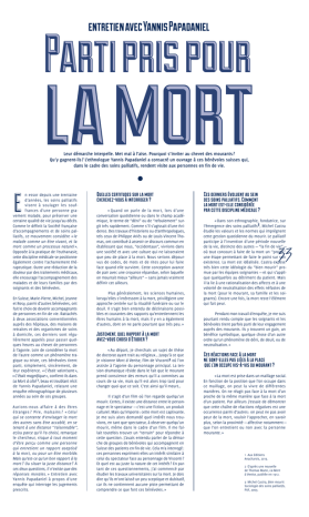 entretien avec Yannis Papadaniel Parti pris pour la mort Leur démarche interpelle. Met mal à l’aise. Pourquoi s’inviter au chevet des mourants ? Qu’y gagnent-ils ? L’ethnologue Yannis Papadaniel a consacré un ouvrage à ces bénévoles suisses qui, dans le cadre des soins palliatifs, rendent visite aux personnes en fin de vie. E n essor depuis une trentaine d’années, les soins palliatifs visent à soulager les souffrances d’une personne gravement malade, pour préserver une certaine qualité de vie jusqu’au décès. Comme le définit la Société française d’accompagnements et de soins palliatifs, ce mouvement considère « le malade comme un être vivant, et la mort comme un processus naturel ». Opposée à la pratique de l’euthanasie, cette discipline médicale se positionne également contre l’acharnement thérapeutique. Outre une réduction de la douleur par des traitements médicaux, elle encourage l’accompagnement des malades et de leurs familles par des soignants et des bénévoles. En Suisse, Marie-Pierre, Michel, Jeanne et Rosy, parmi d’autres bénévoles, ont fait le choix de devenir accompagnants de personnes en fin de vie. Rattachés à deux associations conventionnées auprès des hôpitaux, des maisons de retraites et des organismes de soins à domicile, ces derniers sont régulièrement appelés pour passer quelques heures au chevet de personnes à l’agonie. Loin de considérer la mort de l’autre comme un phénomène tragique ou triste, ces bénévoles tirent parti, simplement, sincèrement, de leur expérience. « C’était valorisant », « C’était magnifique », confient-ils dans La Mort à côté 1, beau et troublant récit de Yannis Papadaniel, relatant une enquête ethnographique de plusieurs années au sein de ces groupes. Aurions-nous affaire à des êtres étranges ? Pire, malsains ? « Celui qui se contente d’envisager la mort des autres sans être accablé, en se tenant à une distance ’’raisonnable’’, et/ou parce qu’il l’a choisi, remarque le chercheur, risque à tout moment d’être perçu comme une personne qui entretient un rapport aseptisé à la mort, ou pour un être morbide. Mais qu’est-ce qu’un bon rapport à la mort ? Ou situer la juste distance ? À ces deux questions, il n’existe que des réponses morales. » Entretien avec Yannis Papadaniel à propos d’une enquête qui interroge les jugements prescrits. Quelles certitudes sur la mort cherchez-vous à interroger ? « Quand on parle de la mort, lors d’une conversation quotidienne ou dans le champ académique, le terme de “déni” ou de “refoulement” surgit très rapidement. Comme s’il s’agissait d’une évidence. Des travaux d’historiens ou d’anthropologues, tels ceux de Philippe Ariès ou de Louis-Vincent Thomas, ont contribué à asseoir ce discours commun en établissant que nous, “occidentaux”, vivrions dans une société et avec une culture qui ne laisseraient que peu de place à la mort. Nous serions dépourvus de codes, de mots et de rites pour lui faire face quand elle survient. Cette conception avance de pair avec une croyance répandue, selon laquelle on mourrait mieux “ailleurs” — sans jamais vraiment définir cet ailleurs. Plus généralement, les sciences humaines, lorsqu’elles s’intéressent à la mort, privilégient une approche centrée sur la ritualité funéraire ou sur le deuil. Il s’agit bien entendu de déclinaisons possibles et courantes des rapports qu’entretiennent les êtres humains à la mort, mais il y en a également d’autres, dont on ne parle pourtant que très peu. » Justement, quel rapport à la mort avez-vous choisi d’étudier ? « Au départ, je cherchais un sujet de thèse de doctorat ayant trait au religieux… Jusqu’à ce que je visionne Mort à Venise, film de Visconti2 où l’on assiste à l’agonie du personnage principal. La tension dramatique réside dans le fait que le mourant prend conscience des erreurs qu’il a commises au cours de sa vie, mais qu’il est alors trop tard pour changer quoi que ce soit. C’est ainsi qu’il meurt… Il s’agit d’un film où l’on regarde quelqu’un mourir. Certes, il existe une distance entre le personnage et le spectateur — c’est une fiction, un produit culturel. Mais qu’importe : cette mort est captivante. Je me suis alors demandé quel intérêt nous trouvions, en tant que spectateur, à observer quelqu’un mourir, même dans le cadre d’un film. Il me fallait toutefois trouver un “terrain” pour répondre à cette question. J’avais entendu parler de la démarche de groupes de bénévoles qui accompagnent en Suisse des patients en fin de vie. Cela m’a interrogé : ces personnes expriment-elles un intérêt similaire à celui du spectateur face au personnage de Visconti ? Et quel est au juste la nature de cet intérêt ? En partant de ces questionnements, j’ai commencé par étudier les travaux universitaires sur la mort. Je dois dire qu’ils m’ont laissé un peu sceptique et dubitatif, car ils ne contiennent aucune piste permettant de comprendre ce que font ces bénévoles. » Ces derniers évoluent au sein des soins palliatifs. Comment la mort est-elle considérée par cette discipline médicale ? « Dans son ethnographie, fondatrice, sur l’émergence des soins palliatifs3, Michel Castra étudie les valeurs et les normes qui imprègnent cette gestion quotidienne du mourir. Le palliatif participe à l’invention d’une période nouvelle de la vie, distincte des autres — “la fin de vie” — où tout concourt à faire de la mort un ’’projet’’, une étape permettant de faire le point sur son existence. La mort est idéalisée. Castra expose très bien cette idéologie du “bien mourir” promue par les équipes soignantes — et qui s’applique quelquefois au détriment du patient. Mais il la lie à une rationalisation des affects et à une volonté de neutralisation des eff