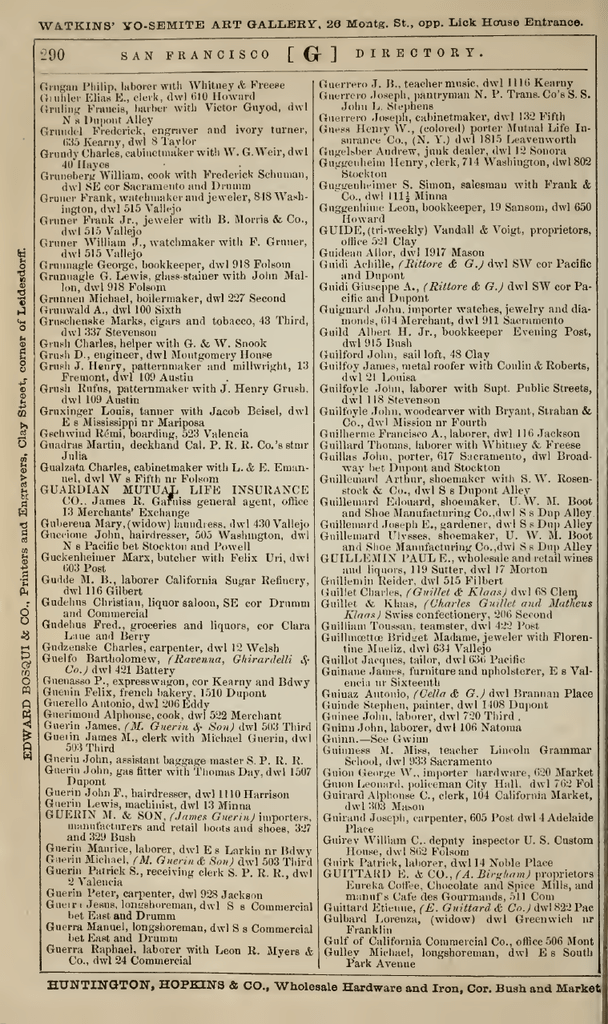 WA.TKINS' YO-SEMITE ART GALLERY, 28 Moatg. Philip, laborer with Whitney 4 Freese Gruhler Elias K., clerk, dwl 610 Howard Grating Francis, burlier with Victor Guyod, dwl N s Dupont Alley Grande] Frederick, engraver nud ivory turner, 635 Kearny, dwl 8 Taylor Grimily Charles, cabinetmaker with W. G.Weir, dwl Gragan 40 Hayes GruneberK William, cook with Frederick Scbnman, dwl SE cor Sacramento and Drumm Graner Frank, watchmaker and jeweler, 818 Washington, dwl 515 Vallejo Graner Frank Jr., jeweler with B. Morris & Co., dwl 515 Vallejo Graner William J., watchmaker with F. Gruner, dwl 515 Vallejo Grunnagle George, bookkeeper, dwl 918 Folsom Grunnagle G. Lewis, glass-stainer with John MaiIon, dwl 918 Folsom Grnnnen Michael, boilermaker, dwl 227 Second Grunwald A., dwl 100 Sixth Gruschenske Marks, cigars and tobacco, 43 Third, dwl 337 Stevenson Groafa Charles, helper with G. &, W. Snook Crush D., engineer, dwl Montgomery House Grush J. Henry, patternmaker and millwright, 13 Fremont, dwl 109 Austin Grush Rufus, patternmaker with J. Henrv Grush, dwl 109 Austin Grnxinger Louis, tanner with Jacob Beisel, dwl E s Mississippi nr Mariposa Gschwind Remi, boarding, 523 Valencia Guadras Martin, deckhand Cal. P. R. R. Co.'sstmr Julia Gualzata Charles, cabinetmaker with L. uel, dwl s Fifth nr Folsom W & E. Eman- GUARDIAN MUTUAL LIFE INSURANCE CO.. James R. Garniss general agent, office 13 Merchants' Exchange Guberena Mary, (widow) laundress, dwl 430 Vallejo Guccione John, hairdresser, 505 Washington, dwl N s Pacific bet Stockton and Powell Guckenheimer Marx, butcher with Felix Uri, dwl 603 Post Gud.le M. B., laborer California Sugar Refinery, dwl 116 Gilbert Gudehus Christian, liquor saloon, SE cor Drumm and Commercial 503 Third Gnerin John, assistant baggage master S. P. R. R. Guerin John, gas fitter with Thomas Day, dwl 1507 Dupont Gnerin John F., hairdresser, dwl 1110 Harrison Guerin Lewis, machinist, dwl 13 Minna GUERIN M. & SON, (James Guerin) importers. manufacturers and retail boots and shoes, 327 and 329 Bush Gnerin Maurice, laborer, dwl E s Larkin nr Bdwy Guerin Michael, ( M. Guerin & Son) dwl 503 Third Guerin Patrick S., receiving clerk S. P. R. R., dwl 2 Valencia Guerin Peter, carpenter, dwl 928 Jackson Gueir Jesus, longshoreman, dwl S s Commercial bet East and Drumm Guerra Manuel, longshoreman, dwl S s Commercial bet East and Drumm Guerra Raphael, laborer with Leon R. Myers & Co., dwl 24 Commercial HUNTINGTON, HOPKINS & House Entrance. Guerrero J. B., teacher music, dwl 1116 Kearny Guerrero Joseph, pantryman N. P. Trans. Co's S. S. John L. Stephens Guerrero Joseph, cabinetmaker, dwl 132 Fifth Guess Henry W., (colored) porter Mutual Life Insurance "Co., (N. Y.) dwl 1815 Leavenworth Gugelsber Andrew, junk dealer, dwl 12 Sonora Guggenheim Henry, clerk, 714 Washington, dwl 802 Stockton Guggenheimer S. Simon, salesman wT ith Frank & Co., dwl 111^ Minna Guggenhime Leon, bookkeeper, 19 Sansom, dwl 650 Howard GUIDE, (tri-weekly) office 521 Vandall & Voigt, proprietors, Clay Guideau Allor, dwl 1917 Mason Gnidi Achille, (Rittore & G.J dwl SW cor Pacific and Dupont Guidi Giuseppe A., (Rittore & G.) dwl SW cor Pacific and Dupont Guignard John, importer watches, jewelry and diamonds, (ill Merchant, dwl 911 Sacramento Guild Albert H. Jr., bookkeeper Evening Post, dwl 915 Bush Guilford John, sail loft, 48 Clay Guilfoy James, metal roofer with Conliu & Roberts, dwl 21 Louisa Guilfoyle John, laborer with Supt. Public Streets, dwl 118 Stevenson Guilfoyle John, woodcarver with Bryant, Strahan Co., dwl Mission nr Fourth Guilherme Francisco A., laborer, dwl 1 16 Jackson Guillard Thomas, laborer with Whitney <fc Freese Guillas John, porter, 617 Sacramento, dwl Broadway bet Dupont and Stockton Guillemaril Arthur, shoemaker with S. W. Rosenstock Co., dwl S s Dupont Alley Guillemaril Edouard, shoemaker, U. W. M. Boot and Shoe Manufacturing Co., dwl S s Dnp Alley Guillemard Joseph E., gardener, dwl SsDnp Alley Guilleinard Ulysses, shoemaker, U. W. M. Boot & & and Shoe Manufacturing Co., dwl S Dun Alley s GUILLEMIN PAUL E., wholesale and retail wine's and liquors, 119 Sutter, dwl 17 Morton Guillemin Reider, dwl 515 Filbert & Guillet Charles, (Guillet Klaas) dwl 68 Clenj Guillet <fc Klaas, (Charles Guillet and Matheus Klaas) Swiss confectionery, 206 Second Gudehus Fred., groceries and liquors, cor Clara Lane and Berry Gudzenske Charles, carpenter, dwl 12 Welsh Guelfo Bartholomew, (Ravenna, Ghirardelli Sf Co.) dwl 421 Battery Guenasso P., expresswagon, cor Kearny and Bdwy Guenin Felix, french bakery, 1510 Dupont Guerello Antonio, dwl 206 Eddy Guerimond Alphonse, cook, dwl 522 Merchant Guerin James, (31. Guerin <%• Son) dwl 5(13 Third Gueiin James M., clerk with Michael Guerin, dwl i opp. Lick [G] DIRECTORY SAN FRANCISCO '190 St., Guilliam Toussan, teamster, dwl 422 Post Gnillincettce Bridget Madame, jeweler with Florentine Mueliz, dwl 631 Vallejo Gnillot Jacques, tailor, dwl 636 Pacific Guinane James, furniture and upholsterer, E s Valencia nr Sixteenth Guinaz Antonio, (Cella & G.J dwl Brannan Place Guinde Stephen, painter, dwl 1408 Dupont Gninee John, laborer, dwl 720 Third Guinn John, laborer, dwl 106 Natoma Gninn. See Gwinn Guinness M. Miss, teacher Lincoln Grammar School, dwl 933 Sacramento Guion George W., importer hardware, 620 Market Guion Leonard, policeman City Hall, dwl 762 Fol , — Gairard Alphonse C, clerk, 104 California Market, dwl 303 Mason Guiraud Joseph, carpenter, 605 Post dwl 4 Adelaide Place Guirey William deputy inspector U. S. Custom House, dwl 862 Folsom Guirk Patrick, laborer, dwl 14 Noble Place GUITTARD E. & CO. (A. Birgham) proprietor a Eureka Coffee, Chocolate and Spice Mills, and manuf s Cafe des Gourmands, 511 Com Guittard Etieune, (E. Guillard & Co.) dwl 822 Pac Gulbard Loreuza, (widow) dwl Greenwich nr Franklin Gulf of California Commercial Co., office 506 Mont Gulley Michael, longshoreman, dwl E s South C , Park Avenue CO., Wholesale Hardware and Iron, Cor. Bush and Market