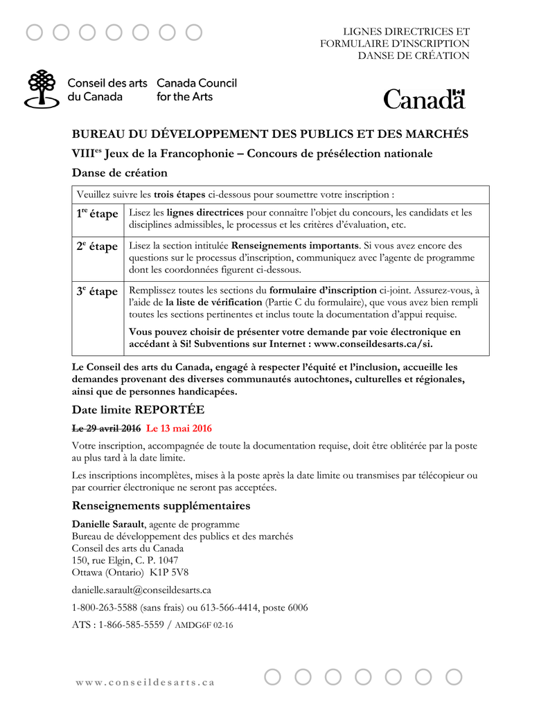 LIGNES DIRECTRICES ET FORMULAIRE D’INSCRIPTION DANSE DE CRÉATION BUREAU DU DÉVELOPPEMENT DES PUBLICS ET DES MARCHÉS VIIIes Jeux de la Francophonie – Concours de présélection nationale Danse de création Veuillez suivre les trois étapes ci-dessous pour soumettre votre inscription : 1re étape Lisez les lignes directrices pour connaître l’objet du concours, les candidats et les disciplines admissibles, le processus et les critères d’évaluation, etc. 2e étape Lisez la section intitulée Renseignements importants. Si vous avez encore des questions sur le processus d’inscription, communiquez avec l’agente de programme dont les coordonnées figurent ci-dessous. 3e étape Remplissez toutes les sections du formulaire d’inscription ci-joint. Assurez-vous, à l’aide de la liste de vérification (Partie C du formulaire), que vous avez bien rempli toutes les sections pertinentes et inclus toute la documentation d’appui requise. Vous pouvez choisir de présenter votre demande par voie électronique en accédant à Si! Subventions sur Internet : www.conseildesarts.ca/si. Le Conseil des arts du Canada, engagé à respecter l’équité et l’inclusion, accueille les demandes provenant des diverses communautés autochtones, culturelles et régionales, ainsi que de personnes handicapées. Date limite REPORTÉE Le 29 avril 2016 Le 13 mai 2016 Votre inscription, accompagnée de toute la documentation requise, doit être oblitérée par la poste au plus tard à la date limite. Les inscriptions incomplètes, mises à la poste après la date limite ou transmises par télécopieur ou par courrier électronique ne seront pas acceptées. Renseignements supplémentaires Danielle Sarault, agente de programme Bureau de développement des publics et des marchés Conseil des arts du Canada 150, rue Elgin, C. P. 1047 Ottawa (Ontario) K1P 5V8 [email protected] 1-800-263-5588 (sans frais) ou 613-566-4414, poste 6006 ATS : 1-866-585-5559 / AMDG6F 02-16 www.conseildesarts.ca LIGNES DIRECTRICES Description du contexte et des concours Les Concours des Jeux de la Francophonie permettront de présélectionner les artistes qui pourraient former l’Équipe Canada lors des VIIIes Jeux de la Francophonie qui se dérouleront en Côte d’Ivoire, à Abidjan du 21 au 30 juillet 2017. Les Jeux, qui surviennent tous les quatre ans, se sont auparavant déroulés au Maroc, en France (Paris et Nice), au Madagascar, au Canada, au Niger, et au Liban. Il s’agit des seuls jeux internationaux d’envergure à jumeler des compétitions sportives et des concours culturels, l’ensemble étant une grande célébration de la jeunesse et de la Francophonie internationale. Comme chez les athlètes, des médailles d’or, d’argent et de bronze récompenseront les trois lauréats de chaque concours culturels. Puisque le Canada et les gouvernements du Québec et du Nouveau-Brunswick sont tous trois membres de l’Organisation internationale de la Francophonie, la délégation canadienne aux Jeux de la Francophonie est constituée de trois équipes : le Canada, le Canada-Québec et le Canada-Nouveau-Brunswick. Le ministère du Patrimoine canadien est responsable de la préparation de l’Équipe Canada pour sa participation aux VIIIes Jeux de la Francophonie et il a chargé le Conseil des arts du Canada d’administrer les concours de présélection nationale pour le volet culturel. Pour de plus amples informations, consultez : Canada.ca/jeux-francophonie. Le volet culturel des Jeux met en scène 12 disciplines : Danse de création Chanson Peinture Sculpture-installation Photographie Littérature (nouvelle) Conte Hip-hop (danse) Marionnette(s) géante(s) Jonglerie avec ballon (« Freestyle Ball ») Création de développement durable Création numérique (vidéo-jockey) VIIIes Jeux de la Francophonie – Concours de présélection nationale – Danse de création /2 Admissibilité Admissibilité générale Chaque membre du groupe : est un citoyen canadien (qui n’habite pas nécessairement au Canada au moment de son inscription); a entre 18 et 35 ans, et donc est né entre le 1er janvier 1982 et le 1er janvier 1999 inclusivement (s’applique uniquement aux danseurs; les chorégraphes, musiciens accompagnateurs et techniciens peuvent être âgés de plus de 35 ans); répond à la définition que donne le Conseil des arts du Canada d’un artiste professionnel, c’est-à-dire qui : a reçu une formation spécialisée dans sa discipline artistique (pas nécessairement dans un établissement d’enseignement) est reconnu comme un professionnel par ses pairs (des artistes du même milieu artistique) a déjà présenté des œuvres en public ou a publié des textes. Admissibilité spécifique à la danse de création Le groupe : est composé de 2 à 7 personnes, y compris le technicien s’est produit en public dans un contexte professionnel au moins une fois avant la date limite du concours. Prestation proposée Le groupe doit proposer pour les Jeux une prestation : d’une durée de 15 minutes avec des décors ou éléments scéniques respectant un poids maximum de 300 kg pouvant être contenus dans un caisson n’excédant pas 15 m3. Si la prestation proposée est déjà créée, elle doit avoir été conçue après le 20 juillet 2015. Le groupe a aussi le choix de plutôt proposer une nouvelle prestation à être conçue plus tard. Processus d’évaluation L’évaluation par les pairs est un principe fondamental du processus décisionnel du Conseil des arts du Canada. Les dossiers d’inscription seront évalués par un comité formé d’artistes professionnels et de professionnels du milieu des arts chevronnés et reconnus par leurs pairs. La sélection finale sera assurée par un jury international qui arrêtera son choix sur les artistes appelés à participer aux Jeux à Abidjan. VIIIes Jeux de la Francophonie – Concours de présélection nationale – Danse de création /3 Processus d’évaluation (suite) P
