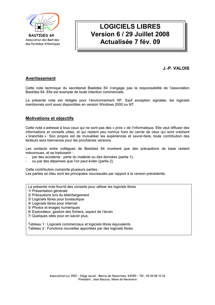 BASTIDES 64 Association des Bastides des Pyrénées-Atlantiques LOGICIELS LIBRES Version 6 / 29 Juillet 2008 Actualisée 7 fév. 09 J.-P. VALOIS Avertissement Cette note technique du secrétariat Bastides 64 n’engage pas la responsabilité de l’association Bastides 64. Elle est exempte de toute intention commerciale. La présente note est rédigée pour l’environnement XP. Sauf exception signalée, les logiciels mentionnés sont aussi disponibles en version Windows 2000 ou NT. Motivations et objectifs Cette note s’adresse à tous ceux qui ne sont pas des « pros » de l’informatique. Elle veut diffuser des informations et conseils utiles, et qui restent peu connus hors du cercle de ceux qui sont vraiment « branchés ». Son propos est de mutualiser les expériences et savoir-faire, toute contribution des lecteurs sera bienvenue pour les prochaines versions. Les contacts entre collègues de Bastides 64 montrent que des précautions de base restent méconnues, et se traduisent : - par des accidents : perte du matériel ou des données (partie 1), - ou par des dépenses que l’on peut éviter (partie 2). Cette contribution comporte plusieurs parties : Les parties en bleu sont les principales nouveautés par rapport à la version précédente. La présente note fournit des conseils pour utiliser les logiciels libres 1/ Présentation générale 2/ Précautions lors du téléchargement 3/ Logiciels libres pour bureautique 4/ Logiciels libres pour Internet 5/ Photos et images numériques 6/ Explorateur, gestion des fichiers, aspect de l’écran 7/ Quelques sites pour en savoir plus. Tableau 1 : Logiciels commerciaux et logiciels libres équivalents Tableau 2 : Fonctions nouvelles apportées par des logiciels libres. Association Loi 1901 – Siège social : Mairie de Navarrenx, 64190 – Tél : 05 59 66 10 22 Président : Jean Baucou, Maire de Navarrenx BASTIDES 64, Association des Bastides des Pyrénées-Atlantiques 2 1/ Présentation générale Qu’est ce qu’un logiciel libre ? C’est un logiciel qui n’est pas acheté chez les revendeurs comme nous faisons habituellement pour les produits Microsoft, Adobe, etc. Un logiciel libre est réalisé par un programmeur ou un groupe de programmeurs indépendants qui mettent leur production à disposition de tous. Voir « précautions » ci-après. Quels avantages présentent les logiciels libres ? Ils sont gratuits. On peut les installer sur plusieurs machines sans se soucier des droits de licence. Il arrive aussi qu’ils soient mieux faits et présentent moins de bugs que les logiciels commerciaux, ou qu’ils comblent des lacunes des logiciels commerciaux. Les mises à jour sont gratuites et peuvent être fréquentes dans le cas d’un logiciel soutenu par une communauté de développeur active (exemple : Mozilla Firefox). Comment se procurer un logiciel libre ? Solution conseillée téléchargement via Internet : vous êtes ainsi sûrs d’avoir la dernière version. Plusieurs solutions sont possibles : • Rechercher par Google en donnant le nom exact du logiciel. Vous êtes sûr d’avoir la toute dernière version ; mais vous aurez souvent un site un anglais. • Aller sur un site de diffusion, voir liste en fin de document Cette solution indirecte vous garantit en principe une version récente, elle présente des avantages importants qui seront détaillés plus loin. Se procurer une revue qui sélectionne des logiciels et les propose sur CD joint, par ex : « Logiciels PC », Hebdo micro, Télécharger.com, avantage : panorama commenté de logiciels recommandés dans un ou plusieurs domaines, sélection par la revue de logiciels en principe testés. Mais un tel pannel peut comporter aussi quelques versions anciennes, et le CD fourni sur lequel est basé la promotion de logiciels « gratuits » comporte souvent des versions de démonstration d’usage limité qui permettent à la revue un effet d’affichage. Ces logiciels étant conçus pour une large diffusion, les procédures d’installation sont vraiment très simples. Les logiciels libres sont-ils répandus ? Le mouvement se répand car de plus en plus nombreux sont les utilisateurs qui trouvent excessifs les prix de vente actuels des logiciels commerciaux compte tenu des millions d’exemplaires diffusés. Certaines entreprises ou collectivités font le choix délibéré de logiciels libres pour deux raisons : économie ou meilleure qualité (moins de bugs, meilleure stabilité). Ainsi par exemple la Communauté Urbaine de Brest. Une enquête réalisée fin 2006 (revue 01 Informatique) montre la percée dans les entreprises, avec pour motivation le moindre coût, la qualité, et l’indépendance par rapport aux éditeurs traditionnels. Détails de l’enquête sur le site : Le Centre National de Documentation Pédagogique via l’Académie de Versailles s’est inscrit dans ce mouvement et favorise également la promotion de logiciels libres (voir ci-après). Un article de la revue « Dynamiques » (Chambre de Commerce et de l’Industrie 64) a incité à l’utilisation de logiciels libres. Plusieurs nos spéciaux de revues grand-public ont paru cet hiver : L’ordinateur individuel en nov-déc 08, et Question micro, n°13, jan-fév 09. Voir également la revue Freelog. Association Loi 1901 – Siège social : Mairie de Navarrenx, 64190 BASTIDES 64, Association des Bastides des Pyrénées-Atlantiques 3 2/ Précautions et modalités de téléchargement Droits de licence Des sites tel que telecharger.com ou clubic.com proposent des logiciels que l’on peut télécharger gracieusement. En fait, ils contiennent différentes sortes de propositions qu’il convient de distinguer soigneusement : - Freeware (‘gratuitiel’): ce sont des logiciels vraiment gratuits, c’est marqué en clair et c’est alors sans surprise, sauf erreur de classement. Open source : le logiciel est gratuit, il existe un « droit de licence » (par exemple la licence dite GNU que vous pouvez acc