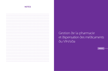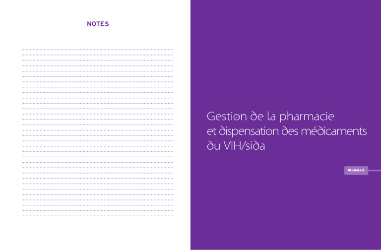 Notes ............................................................................................................. ............................................................................................................. ............................................................................................................. ............................................................................................................. ............................................................................................................. ............................................................................................................. ............................................................................................................. ............................................................................................................. ............................................................................................................. ............................................................................................................. ............................................................................................................. ............................................................................................................. ............................................................................................................. ............................................................................................................. ............................................................................................................. ............................................................................................................. ............................................................................................................. ............................................................................................................. ............................................................................................................. ............................................................................................................. Gestion de la pharmacie et dispensation des médicaments du VIH/sida ............................................................................................................. ............................................................................................................. ............................................................................................................. ............................................................................................................. ............................................................................................................. ............................................................................................................. ............................................................................................................. ............................................................................................................. ............................................................................................................. ............................................................................................................. ............................................................................................................. ............................................................................................................. Module 6 Contexte L’avènement du traitement ARV a permis de diminuer considérablement la morbidité et la mortalité de l’infection à VIH et a fait du VIH/sida une maladie chronique compatible avec une vie normale. Parallèlement, les IO pouvant compliquer l’infection bénéficient de traitements curatifs spécifiques (traitement antituberculose par exemple) et, pour certaines d’entre elles, d’une chimioprophylaxie primaire faisant appel au cotrimoxazole. Le succès des ARV et des traitements des IO dépend non seulement de l’observance des patients, mais également de la continuité de leur approvisionnement en médicaments et de la qualité de l’éducation thérapeutique qui leur est donnée au moment de la délivrance des ordonnances. Il est donc fondamental de gérer la pharmacie selon des règles rigoureuses permettant de fournir aux patients des médicaments de qualité, de façon parfaitement régulière et en accompagnant la dispensation des conseils et du soutien assurant une prise effective des traitements. L’ e s s e n t i e l à r e t e n i r • Lors du rangement des médicaments dans la pharmacie, la place attribuée à chaque médicament doit être indiquée par une étiquette précisant le nom de la molécule (DCI du produit), sa forme et son dosage. • Dans les étagères de la pharmacie, les produits qui se périment le plus rapidement sont à ranger devant ceux qui ont le délai de péremption le plus long (règle du « premier entré, premier sorti »). • Chaque médicament de la pharmacie doit être accompagné d’une fiche de stock précisant le nom du médicament, sa forme, son dosage, son conditionnement, la quantité de produit dans le conditionnement, le seuil de commande et les informations relatives aux mouvements du produit. • Avant de délivrer une ordonnance, il faut vérifier que la prescription est adaptée au patient (forme, dosage, posologie) et que les médicaments qui vont lui être remis ne présentent aucun signe de détérioration (aspect ou odeur anormal). • Lors de la dispensation, il faut compter les unités de médicaments en les manipulant avec une spatule pour éviter tout risque de contamination. • Lors de la dispensation, il est important de vérifier auprès du patient, même brièvement, que toutes les conditions sont réunies pour une prise effective du traitement. Obj ectifs du modul