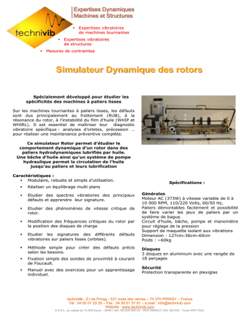 Expertises vibratoires de machines tournantes Expertises vibratoires de structures Mesures de contraintes Simulateur Dynamique des rotors Spécialement développé pour étudier les spécificités des machines à paliers lisses Sur les machines tournantes à paliers lisses, les défauts sont dus principalement au frottement (RUB), à la résonance du rotor, à l’instabilité du film d’huile (WHIP et WHIRL). Il est essentiel de maîtriser leur diagnostic vibratoire spécifique : analyses d’orbites, précession … pour réaliser une maintenance préventive complète. Ce simulateur Rotor permet d’étudier le comportement dynamique d’un rotor dans des paliers hydrodynamiques lubrifiés par huile. Une bâche d’huile ainsi qu’un système de pompe hydraulique permet la circulation de l’huile jusqu’au paliers et leurs lubrification Caractéristiques : Modulaire, robuste et simple d’utilisation. Spécifications : Réaliser un équilibrage multi plans Etudier des spectres vibratoires des principaux défauts et apprendre leur signature. Etudier des phénomènes de vitesse critique de rotor. Modification des fréquences critiques du rotor par la position des disques de charge Etudier les signatures des différents vibratoires sur paliers lisses (orbites). Méthode simple pour créer des défauts précis selon les besoins. Fixation simple des sondes de proximité à courant de Foucault. Manuel avec des exercices pour un apprentissage individuel. défauts Générales Moteur AC (373W) à vitesse variable de 0 à 10 000 RPM, 110/220 Volts, 60/50 Hz, Paliers démontables facilement et possibilité de faire varier les jeux de paliers par un système de bague. Circuit d’huile, bâche, pompe et manomètre pour réglage de la pression Support de maquette isolant aux vibrations Dimension : 127cm×36cm×60cm Poids : ~60kg Disques 3 disques en aluminium avec une rangée de 18 perçages Sécurité Protection transparente en plexiglas technivib - Z.I de Pringy - 531 route des vernes – 74 370 PRINGY – France Tél : 04 50 01 23 20 – Fax : 04 50 01 57 81 – e.mail : [email protected] Website : www.technivib.com S.A.R.L. au capital de 15 000 Euros – SIRET 453 180 630 000 23 – RCS ANNECY 453 180 630 – Code APE 742C. Kits d’options pour le Simulateur Rotor Le Simulateur Dynamique des rotors est simple d’utilisation pour l’apprentissage des signatures vibratoires des différents défauts de fonctionnement d’une machine et pour réaliser des études approfondies de dynamique de rotor, grâce aux kits d’options qui permettent de multiples configurations correspondant à différentes applications. Tous les kits d'options disponibles avec ce simulateur sont décrits ci-dessous. Kit de Rub : • Ce kit permet de mesurer le phénomène de RUB (frottement) associé à différents matériaux et sous différent angle, charge et conditions de lubrification. • Les différents matériaux qui vont générer le frottement sont faciles à mettre en place. • Ces expériences peuvent être réalisées sur le rotor ou sur les disques. Ce kit se compose d’un bras ajustable sur lequel viennent s’adapter les différents matériaux. Ce bras est ajustable dans différentes positions. Kit d’étude d’huile WHIRL/WHIP : • Apprendre les effets d’une instabilité de palier. • Reconnaître la signature du WHIRL et du WHIP. • Développer des techniques de reconnaissances de ces défauts. Ce kit est composé de 6 coussinets (3 paires de bagues) pour faire varier les jeux de palier. Deux coussinets spécifiques ayant une forme légèrement elliptique génère des instabilités de WHIP et de WHIRL. Kit de résonance : • Le diamètre de rotor est adapté pour faciliter les résonances. • Etudier l’influence de la vitesse critique du rotor sur l’instabilité de palier. Ce kit est composé d’un rotor de 12,8 mm et de 2 coussinets adaptés ainsi que 3 disques de charge. technivib - Z.I de Pringy - 531 route des vernes – 74 370 PRINGY – France Tél : 04 50 01 23 20 – Fax : 04 50 01 57 81 – e.mail : [email protected] Website : www.technivib.com S.A.R.L. au capital de 15 000 Euros – SIRET 453 180 630 000 23 – RCS ANNECY 453 180 630 – Code APE 742C Kit d’étude WHIRL/WHIP pour rotor 16,9mm: • Apprendre les effets d’une instabilité de palier. • Reconnaître la signature du WHIRL et du WHIP. • Développer des techniques de reconnaissances de ces défauts. Ce kit est composé de 6 coussinets (3 paires de bagues) pour faire varier les jeux de palier. Deux coussinets spécifiques ayant une forme légèrement elliptique génère des instabilités de WHIP et de WHIRL. Kit de conversion des paliers lisses en paliers à roulements Ce kit inclut deux paliers avec des logements pour l’installation des roulements (∅ de rotor 12.7mm ou 16.9mm), un arbre de ∅16.7mm, deux disques en alu, un accouplement et un disque de charge. Kit de roulements: • Roulements dégradés pour apprendre l’analyse temporelle et spectrale des roulements avec des défauts classiques. • Apprendre l’analyse du signal : comme les moyennes et l’influence de la résolution spectrale pour déterminer les défauts de roulements. • Tester l’effet d’un défaut plus important sur un roulement. • Déterminer pourquoi une bonne résolution est nécessaire pour diagnostiquer un défaut de roulement lorsque la fréquence de défaut est proche d’une fréquence multiple de la fréquence de rotation. • Apprendre comment un signal chargé peut masquer d’autres signaux de plus faibles amplitudes. Ce kit contient : 4 roulements avec chacun un défaut différent : un défaut de bague intérieure, défaut de bague extérieure, un défaut d’éléments roulants, et une combinaison de défauts. Les fréquences de défauts sont très proches des multiples de la vitesse de rotation. Ce kit contient également 2 supports paliers pour fixer les roulements à la place des paliers lisses. technivi