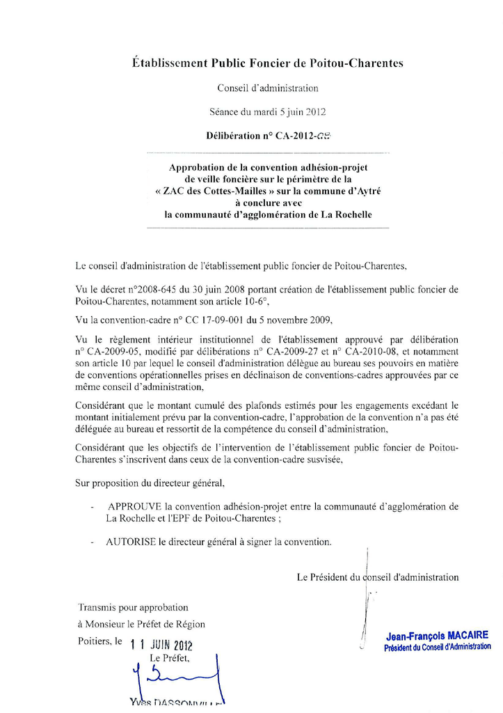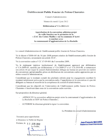 PROGRAMME PLURIANNUEL D'INTERVENTION 2009-2013 CONVENTION ADHÉSION PROJET DE VEILLE FONCIÈRE DU SECTEUR ZAC DES COTTES MAILLES COMMUNE D’AYTRÉ (CHARENTE-MARITIME) EN APPLICATION DE LA CONVENTION-CADRE RELATIVE À LA POLITIQUE DE L’HABITAT CC 17-09-001 ENTRE LA COMMUNAUTÉ D’AGGLOMÉRATION DE LA ROCHELLE ET L’ÉTABLISSEMENT PUBLIC FONCIER DE POITOU-CHARENTES Entre La Communauté d’Agglomération de la Rochelle, dont le siège est situé - 6 rue Saint-Michel - 17086 LA ROCHELLE Cedex 02 - représentée par son Président, Monsieur Maxime BONO, autorisé à l'effet des présentes par une délibération du Conseil Communautaire en date du ……………………….., Ci-après dénommée « la CdA de La Rochelle » ; d'une part, et L'Établissement Public Foncier de Poitou-Charentes, établissement public de l'État à caractère industriel et commercial, dont le siège est à – Immeuble le Connétable, 18-22 Boulevard Jeanne d'Arc, 86000 POITIERS – représenté par Monsieur Alain TOUBOL, son directeur général, nommé par arrêté ministériel du 22 septembre 2008 et agissant en vertu de la délibération du conseil d’administration n° CA-2012-….. en date du …… ………………, Ci-après dénommé « EPF PC » ; d'autre part Convention Projet CdA La Rochelle – EPF PC (Aytré) V def PRÉAMBULE Suite à l'adoption de son Programme Local de l’Habitat (PLH) le 19 décembre 2008, la Communauté d'Agglomération de La Rochelle a conclu avec l'EPF de Poitou-Charentes une convention-cadre afin de conduire, sur le long terme et au bénéfice du développement durable du territoire communautaire, une politique foncière active en faveur du logement, notamment du logement social. Le PLH de la Communauté d'Agglomération de La Rochelle qui s’organise autour d’objectifs, tant quantitatifs que qualitatifs, visant au maintien et au renforcement de la solidarité au sein de l'agglomération, tout en apportant des réponses diversifiées pour les besoins spécifiques, a identifié six axes d’intervention prioritaire : une plus grande maîtrise foncière ; la mixité sociale dans les documents d'urbanisme ; la réponse aux besoins en logements aidés, en partenariat avec les organismes HLM ; la poursuite de la rénovation urbaine là où elle s’impose ; une intervention volontariste sur le parc ancien privé et public ; une concertation renforcée avec les promoteurs privés. Pour répondre aux besoins d’une population de 170 000 habitants en 2020, le PLH s'est fixé comme objectif la production de 1 200 nouveaux logements annuellement sur le territoire de la CdA de La Rochelle. Ce faisant, le PLH a déterminé, commune par commune, des proportions obligatoires de réalisation de logements sociaux par opération, selon des critères particuliers, de façon à ce que : celles soumises aux lois SRU et DALO atteignent 20 % de logements sociaux en 2020 ; les autres disposent au minimum de 10 % environ de logements sociaux sur leur territoire. Ainsi, l’objectif de production annuelle de logements sociaux au sens de la loi SRU s’établit à environ 420 unités, soit : 330 logements PLUS (y compris PLUS CD) et PLAI ; 90 logements locatifs PLS. Ce PLH, ayant fait depuis l’objet d’adaptations par délibération du Conseil Communautaire du 27 janvier 2011, succède à celui adopté le 20 décembre 2002. Par ailleurs, la mise en révision du Schéma Directeur a conduit à l’élaboration du Schéma de COhérence Territoriale (SCOT) approuvé le 28 avril 2011. Le niveau de densité minimale des projets des communes de l’unité urbaine centrale, dont Aytré fait partie, est d’au moins 30 logements / ha. Dans le Plan Local d’Urbanisme (PLU) de la commune d’Aytré approuvé par la CDA lors du Conseil Communautaire du 17 novembre 2011, un secteur à vocation d’habitat a été inscrit en zone AU en limite urbaine nord, accompagné d’une orientation particulière d’aménagement. Ce secteur d’une surface de 10 ha environ est relié à l’échangeur des Cottes Mailles sur la RN 134 prolongeant l’extension de l’urbanisation existante entre la rue des Cottes Mailles et le projet de boulevard des Cottes Mailles. Le projet s’inscrit dans le cadre du projet de développement de l’agglomération de La Rochelle et de la ville d’Aytré qui est de poursuivre l’accueil de nouveaux habitants avec la volonté affirmée de mettre en œuvre des programmes de logements qui permettront d’organiser une mixité sociale équilibrée et de garantir une qualité environnementale et paysagère à l’échelle de la ville et du quartier. À ce titre, par délibération du 2 juin 2006, la CDA a engagé sur ce secteur des études préalables à la mise en œuvre d’une Zone d’Aménagement Concerté (ZAC) dont le dossier de création a été approuvé lors du Conseil Communautaire du 23 février 2012. Convention Projet CdA La Rochelle – EPF PC (Aytré) V def Le programme global prévisionnel des constructions doit permettre la réalisation d’un projet à dominante d’habitat pour une Surface de Plancher (SP) globale de 45 500 m² dont : 41 000 m² consacrés au logement, soit 450 à 510 logements dont 33% en habitat social : - des îlots de logements collectifs pour un programme d’environ 375 à 420 logements - des îlots de logements intermédiaires et/ou de maisons de ville pour 45 à 60 logements - un îlot de logements individuels, maisons groupées pour environ 30 logements 1 500 m² pour des locaux de commerces et de services 2 500 m² pour la mise en œuvre d’un programme d’hôtellerie ou de parahôtellerie dans l’opération de logements 500 m² pour un macro-lot réservé à la réalisation d’un équipement public de quartier Sur la base du dossier de création approuvé, une consultation sera lancée par la CDA en vue de choisir un aménageur concessionnaire de la ZAC. Cette opération entre dans le champ des actions prévues par la conventi