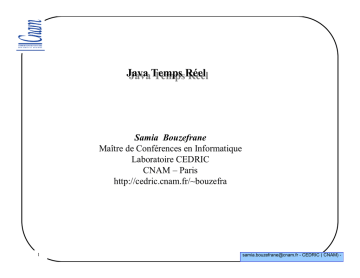 Java JavaTemps TempsRéel Réel Samia Bouzefrane Maître de Conférences en Informatique Laboratoire CEDRIC CNAM – Paris http://cedric.cnam.fr/~bouzefra 1 [email protected] - CEDRIC ( CNAM) - Sommaire Sommaire 1. Caractéristiques de Java standard 2 2. RTSJ : Real-Time Specification for Java 3. Implémentation 4. Références [email protected] - CEDRIC ( CNAM) - Présentation Présentation 3 [email protected] - CEDRIC ( CNAM) - Java Java::quelques quelquesavantages avantages SDK gratuit Java est orienté objet Java est portable Java est une librairie riche La JVM possède un ramasse-miettes automatique Moins sujet à erreur (pas de pointeur comme en C) Java devient de plus en plus performant et fiable grâce à la JVM HotSpot et à l’intégration d’un compilateur JIT (Just in Time) (JIT est un interpréteur basé sur la JVM qui, sous certaines conditions (exécution d’une portion de code plusieurs fois) décide de compiler une partie de l’application) 4 [email protected] - CEDRIC ( CNAM) - Mécanismes Mécanismesde deprogrammation programmationofferts offertspar parJava Java Java possède des: Threads Moniteurs Timers 5 [email protected] - CEDRIC ( CNAM) - Threads ThreadsJava Java/2 /2 Les Threads démons (daemon) Groupe de Threads possèdent des méthodes : interrupt(), yield(), sleep(), join(). Une Thread peut envoyer une interruption à une autre Thread en exécutant la méthode interrupt() Une interruption n’est prise en compte par une thread que si celle-ci exécute l’une des méthodes suivantes : wait(), sleep(), join(), isInterrupted() 6 [email protected] - CEDRIC ( CNAM) - Démarrer Démarrerune unethread thread/1 /1 public class MaThread extends Thread { public void run() { System.out.println("Ma nouvelle thread") ; } public static void main(String arg[]) { MaThread tt= new MaThread() ; tt.start() ; System.out.println("La thread mère") ; tt.join(); } } 7 [email protected] - CEDRIC ( CNAM) - Démarrer Démarrerune unethread thread/2 /2 public class AutreThread extends Object { public static void main(String arg[]) { Runnable objA = new Runnable() { public void run() { System.out.println("Ma nouvelle thread") ; } // fin de run() } ; // fin de objA Thread ta= new Thread(objA) ; ta.start() ; System.out.println("La thread mère") ; ta.join(); } // fin du main } // fin de la classe 8 [email protected] - CEDRIC ( CNAM) - Groupe Groupede dethreads threads public class AutreThread extends Object { public static void main(String arg[]) { Runnable objA = new Runnable() { public void run() { System.out.println("Ma nouvelle thread") ; } // fin de run() } ; // fin de objA ThreadGroup pere = new ThreadGroup ("Pere") ; Thread ta= new Thread(pere, objA, "ThreadA") ; ta.start() ; System.out.println("La thread mère") ; ta.join(); } // fin du main } // fin de la classe 9 [email protected] - CEDRIC ( CNAM) - Interrompre Interrompreune unethread/1 thread/1 public class Interrompre extends Object { public static void main(String arg[]) { Runnable objA = new Runnable() { public void run() { System.out.println("ThreadA commence son exécution"); try { Thread.sleep(1000) ; System.out.println ("ThreadA se réveille apres 1s"); } catch (InterruptedException x) { System.out.println("ThreadA a été interrompue pendant son sommeil!"); return ;} System.out.println("ThreadA se termine normalement"); } // fin de run() } ; // fin de objA 10 [email protected] - CEDRIC ( CNAM) - Interrompre Interrompreune unethread/2 thread/2 Thread ta = new Thread(objA, "ThreadA") ; ta.start() ; System.out.println("Thread main envoie une IT a "+ ta.getName()); ta.interrupt() ; } // fin du main } // fin de la classe 11 [email protected] - CEDRIC ( CNAM) - Associer Associerune unepriorité prioritéààune unethread/1 thread/1 public class Priorite extends Object { public static void main(String arg[]) { Runnable objA = new Runnable() { public void run() { System.out.println (“ La Thread ” + Thread.currentThread().getName()+ commence a s’executer , sa priorite initiale est : ” + Thread.currentThread().getPriority()) ; try { Thread.sleep(100) ; System.out.println (“ La Thread ” + Thread.currentThread().getName()+ “ se réveille apres 100ms”); } catch (InterruptedException x) { } 12 [email protected] - CEDRIC ( CNAM) - Associer Associerune unepriorité prioritéààune unethread/2 thread/2 Thread.currentThread().setPriority(7) ; System.out.println (“ La nouvelle priorite de la thread ” + Thread.currentThread().getName() + “ apres modification par un setPriority est : “ + t.getPriority()) ; } // fin de run() } ; // fin de objA Thread ta= new Thread(objA, “ ThreadA ”) ; ta.start() ; } // fin du main } fin de la classe 13 [email protected] - CEDRIC ( CNAM) - Les Lesmoniteurs moniteursJava Java(version (version1.4) 1.4) un moniteur est un objet qui contient des méthodes accessibles en exclusion mutuelle (synchronized) Dans un moniteur, on utilise - wait() pour se bloquer si une condition n’est pas vérifiée et - notify() ou notifyAll() pour réveiller une thread bloquée lorsque la condition devient vraie. (Voir aussi les moniteurs avec les variables condition en Java 1.5 => cours sur la Synchronisation) 14 [email protected] - CEDRIC ( CNAM) - Inconvénients Inconvénientsdes desmoniteurs moniteursJava Javapour pourleletemps tempsréel réel L’entrée dans un moniteur n’est pas basée sur la priorité Un wait(x) peut provoquer une attente qui dépasse le temps spécifié Choisir une thread à notifier n’est pas basé sur la priorité : - pas de file d’attente triée par rapport à la priorité Pas de protocole évitant l’inversion de priorités 15 [email protected] - CEDRIC ( CNAM) - La Laclasse classejava.util.Timer java.util.Timer -L’objet Timer est un mécanisme offert pour exécuter plusieurs tâches planifiées par une thread exécutée en arrière plan. -Les tâches peuvent être planifiées pour s’exécuter une seule fois ou plusieurs fois à des instants réguliers. -P