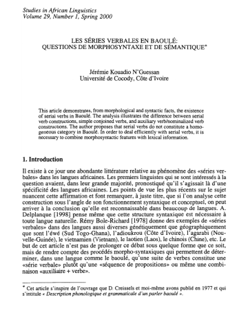 Studies in African Linguistics Volume 29, Number 1, Spring 2000 LES SERIES VERB ALES EN BAOULE: QUESTIONS DE MORPHOSYNT AXE ET DE SEMANTIQUE* Jeremie Kouadio N'Guessan Universite de Cocody, Cote d'Ivoire This article demonstrates, from morphological and syntactic facts, the existence of serial verbs in Baoule. The analysis illustrates the difference between serial verb constructions, simple conjoined verbs, and auxiliary verb/nominalized verb constructions. The author proposes that serial verbs do not constitute a homogeneous category in Baoule. In order to deal efficiently with serial verbs, it is necessary to combine morphosyntactic features with lexical information. 1. Introduction II existe ace jour une abondante litterature relative au phenomene des «series verbales» dans les langues africaines. Les premiers linguistes qui se sont interesses a la question avaient, dans leur grande majorite, pronostique qu'il s' agissait la d'une specificite des langues africaines. Les points de vue les plus recents sur Ie sujet nuancent cette affirmation et font remarquer, a juste titre, que si l' on analyse cette construction sous I' angle de son fonctionnement syntaxique et conceptuel, on peut arriver a la conclusion qu'elle est reconnaissable dans beaucoup de langues. A. Delplanque [1998] pense meme que cette structure syntaxique est necessaire a toute langue naturelle. Remy Bole-Richard [1978] donne des exemples de «series verbales» dans des langues aussi diverses genetiquement que geographiquement que sont l'ewe (Sud Togo-Ghana), l'adioukrou (Cote d'Ivoire), l'agarabi (Nouvelle-Guinee), Ie vietnarnien (Vietnam), Ie laotien (Laos), Ie chinois (Chine), etc. Le but de cet article n'est pas de prolonger ce debat sous quelque forme que ce soit, mais de rendre compte des procedes morpho-syntaxiques qui permettent de determiner, dans une langue comme Ie baoule, qu'une suite de verbes constitue une «serie verbale» plutot qu'une «sequence de propositions» ou meme une combinaison «auxiliaire + verbe». * Cet article s'inspire de l'ouvrage que D. Creissels et moi-meme avons publie en 1977 et qui s'intitule « Description phonologique et grammaticale d'un parler baoule ». 76 Studies in African Linguistics 29(1), 2000 2. Serie verbale: essais de definition La definition de la «serie verbale» varie selon les langues, mais egalement seIon Ie point de vue tMorique ado pte par Ie descripteur. D'une maniere generale, on designe de ce terme une succession de radicaux verbaux ayant un sujet commun, seulle premier terme de la serie etant affecte des marques de modaIites verbaIes, les termes suivants ne retenant de leur nature verbale que la faculte d' etre suivis d'une expansion. C'est par exemple Ie point de vue adopte par Ie linguiste M. Houis [1977] qui considere les «series verbales» comme «des faits de composition au niveau du predicat. Elles sont ainsi caracterisees: Ie predicat est assume par une serie comportant un verbe affecte de son predicatif et suivi d'une serie de lexemes a valence verbo-nominale. Le predicatif n' est pas repete. Le verbe initial et les lexemes peuvent recevoir des expansions primaires.» [Houis 1977: 55]. Cette definition semble etablir une «hierarchie» entre les verbes composant la serie puisqu'il y est mentionne que seulle premier verbe est affecte d'une modalite verbale (aspect, temps, mode, negation). Vne telle definition ne saurait convenir au cas du baoule ou, au contraire, les verbes de la serie sont affectes «a egalite»1 de la meme modalite verbale. La meme idee est reprise par Delplanque [1986:35] qui parle, lui, de «syntagme verbal» qu'il definit comme «une structure assumant une fonction predicative unique et constituee d'au moins deux constituants» entre lesquels on distingue «clairement un noyau et une expansion». En effet, fait remarquer par ailleurs cet auteur, «Ie second verbe du syntagme porte une conjugaison moins riche que Ie premier, comme si toutes les sequences etaient de structure: noyau VI + expansion V2» [Delplanque 1998:232]. Ce que dit Delplanque du dagara (langue gur du Burkina Faso) ne peut pas, encore une fois, etre retenu pour les faits du baoule. Dans cette demiere langue, Ie comportement tonal de la forme verbale permet d'affirmer sans hesitation aucune que la deuxieme partie d'une serie verb ale n'est pas l'expansion du premier terme de la serie. Cette loi tonale est la suivante: dans un enonce, Ie radical verbal est - a ton 2 fondamental haut (pour les monosyllabes: ev) et bas suivi de haut (pour les dissyllabes: evev) s'i/ n 'est pas suivi d'expansion ni de circonstant; - aton bas (a la fois pour les monosyllabes: ev, et les dissyllabes: evev) s 'it est suivi d'une expansion ou d'un circonstant. Prenons comme exemple Ie verbe w~di (ton fondamentaI bas-haut) «courir», «fuir quelqu'un/quelque chose» lorsqu'il apparait seul dans une structure «V + Expansion» (<<fuir quelqu'un/quelque chose») ou dans une serie verbale w?di ... M /courir ... venir/ «venir en courant»: 1 Sauf lorsque Ie premier verbe est au progrssif; dans ce cas, Ie deuxieme verbe est au mode intentionnel comme dans l'enonce (3). 2 Le baoule est une langue aton. Dans cette langue, des lois tonales (que nous n'exposerons pas ici, faute de place) transforment constamment la mel odie globale des enonces. Les series verbales en baoule (1) construction V + Expansion 3 Enonce de base: /~ su W~cfI kofI/ --7 il PROG fuir 77 Enonce realise: [~ su w~di kofi] «ll fuit Koffi.» Enonce realise: [~ su W~cfI ba] «11 vient en courant.» Koffi (2) construction a serie verb ale Enonce de base: /~ su w~dI bat --7 il PROG courir venir Sans chercher a etre exhaustif, on peut retenir qu' en surface, Ia realisation tonale du verbe w~di est differente d'un enonce a l'autre: Ie ton de ce verbe est phonologiquement bas-bas dans l'enonce (1) et bas-haut dans l'enonce (2). La raison est qu'en (1), Ie verbe est sui vi de l'expansion kafi, alors qu'en (2), Ie verbe V2 ba ne fonc
