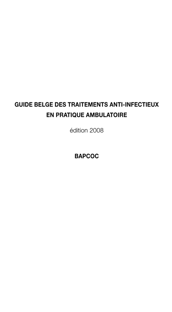 GUIDE BELGE DES TRAITEMENTS ANTI-INFECTIEUX EN PRATIQUE AMBULATOIRE édition 2008 BAPCOC 2 contenu Contenu Introduction : L’usage adéquat des antibiotiques Méthodologie 8 12 INFECTIONS RESPIRATOIRES Mal de gorge aigu Otite moyenne aiguë Rhinosinusite aiguë Epiglottite aiguë Laryngite striduleuse Infections aiguës des voies respiratoires inférieures chez l’enfant Bronchiolite Infections aiguës des voies respiratoires inférieures chez l’adulte Exacerbation aiguë de bronchopneumopathie chronique obstructive (BPCO) Influenza (grippe saisonnière) Refroidissement Pertussis (coqueluche) 15 17 19 22 23 24 26 27 29 31 33 34 INFECTIONS DE LA PEAU ET DES TISSUS MOUS Acné Impétigo Cellulite et érysipèle Morsures Herpès labial Varicelle et herpes zoster (zona) Maladie de Lyme (erythema chronicum migrans) Candidoses et mycoses Scabies (gale) 35 37 39 40 42 43 45 46 48 INFECTIONS GENITO-URINAIRES Cystite (non compliquée) Pyélonephrite (non compliquée) Prostatite Orchi-épididymite Pelvic inflammatory disease (PID) Vulvovaginite Urétrite Syphilis Herpès génital 49 52 53 55 57 59 61 63 65 contenu 3 INFECTIONS GASTRO-INTESTINALES Gastro-entérite résidentielle Diverticulite Abcès peri-anal Eradication d’Helicobacter pylori 66 67 68 69 INFECTIONS STOMATOLOGIQUES Abcès dentaire 71 INFECTIONS OPHTALMOLOGIQUES Conjonctivite bactérienne 72 PROPHYLAXIE Prévention de la méningite bactérienne Prévention de l’endocardite bactérienne 73 75 POLITIQUE DE PRESCRIPTION DES ANTIBIOTIQUES EN MAISON DE REPOS (ET DE SOINS) 78 MRSA EN PRATIQUE AMBULATOIRE 81 INFORMATIONS UTILES Avis pour les voyageurs Tuberculose 84 84 4 preface PREFACE En réponse à des observations interpellantes concernant la croissance de la résistance bactérienne et une consommation trop importante d’antibiotiques en Belgique, la BAPCOC a pris différentes initiatives. Près de dix ans plus tard, ces initiatives peuvent être qualifiées, sans aucune exagération, de bénéfiques : le nombre de prescriptions d’antibiotiques a diminué de 32% par rapport à l’année 2000, l’amoxicilline est plus fréquemment choisie qu’elle ne l’était par rapport à l’amoxicilline-clavulanate et la résistance du Streptococcus pneumoniae est à la baisse. En 2006 paraissait la première édition du «Guide belge des traitements anti-infectieux en pratique ambulatoire» surnommé le Guide Antibiotiques. Cet opuscule se voulait une réponse au paradoxe suivant : une prescription de 80% des antibiotiques en pratique ambulatoire, sans directives précises, pour 20% en milieu hospitalier sous les auspices de formulaires avec des choix justifiés pour les antibiotiques. La rédaction d’un formulaire pour les antibiotiques en pratique ambulatoire – élaboré par des auteurs et des experts indépendants – était nécessaire et urgente. Ce guide devait constituer une annexe utile et valide au Répertoire Commenté des Médicaments et adopter son format de poche. Leur complémentarité est manifeste : le répertoire livre des directives pour un usage rationnel des antibiotiques issus de différentes classes thérapeutiques ; le Guide Antibiotiques se base sur les plaintes ou sur les entités pathologiques. En étroite collaboration avec le CBIP, le contenu des deux documents est mis en concordance. Les nombreuses réactions positives manifestées lors de la première édition de ce guide nous ont convaincu de la nécessité de poursuivre cette initiative. Le Guide Antibiotiques rassemble des synthèses de Recommandations de Bonne Pratique, consultables lors d’un contact avec un patient : suivant une plainte ou une entité pathologique, l’indication ou non d’un antibiotique est mentionnée, et, dans le cas où il est indiqué, le meilleur choix, la dose adéquate ainsi que l’intervalle d’administration sont colligés. Tous ces éléments sont issus de sources indépendantes et scientifiquement fondées. Egalement pour cette nouvelle édition, une recherche systématique dans la littérature récente a été effectuée sous la coordination du Dr Pierre Chevalier. Cette nouvelle édition voit le jour grâce au soutien financier des autorités et au dévouement important des collaborateurs de la BAPCOC, des membres du comité d’accompagnement et d’experts externes. Nous leur en sommes fort redevables. Je voudrais particulièrement remercier le Professeur émérite Marc De Meyere qui, en tant que président du Groupe de Travail Pratique Ambulatoire à l’époque, fut le guide de la première édition. Nous espérons que tous les médecins concernés par la pratique ambulatoire continueront à utiliser cet outil pratique. D’avance, nous vous remercions de collaborer à nos objectifs : contribuer à protéger la santé publique en jugulant l’augmentation de la résistance microbienne grâce à une amélioration de l’usage des antibiotiques. Prof. Dr. An De Sutter Présidente du Groupe de Travail Médecine Ambulatoire BAPCOC collaborateurs (edition 2006) 5 COLLABORATEURS (EDITION 2006) Coordination générale Dr Pierre Chevalier, Centre Académique de Médecine Générale UCL Prof Emérite Dr Marc De Meyere, Vakgroep Huisartsgeneeskunde en Eerstelijnsgezondheidszorg UGent Groupe des auteurs Dr Pierre Chevalier, Centre Académique de Médecine Générale UCL Prof Dr An De Sutter, Vakgroep Huisartsgeneeskunde en Eerstelijnsgezondheidszorg UGent Dr Aurelia Meyer, médecin généraliste Dr Françoise Pineux, médecin généraliste Comité d’accompagnement Dr Michiel Costers, coordinateur BAPCOC Dr Geert De Loof, médecin généraliste (représentant la WVVH) Dr Robert Gérard, médecin généraliste (représentant la SSMG) Prof Dr Herman Goossens, biologie clinique - microbiologue Prof Dr Jack Lévy, pédiatre Dr Petra Schelstraete, pédiatre Dr Yves Van Laethem, médecin-interniste – infectiologue Dr Stefaan Van Lierde, pédiatre Prof Dr Jan Verhaegen, biologie clinique – microbiologue Dr Anne-Marie 