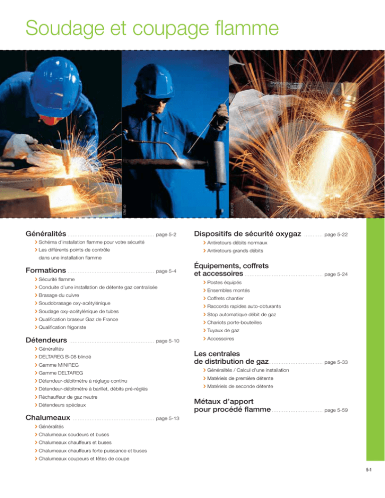 2003-313 1786-40 1786-39 Soudage et coupage flamme Généralités . . . . . . . . . . . . . . . . . . . . . . . . . . . . . . . . . . . . . . . . . . . . . . . . . . . page 5-2 Dispositifs de sécurité oxygaz Schéma d’installation flamme pour votre sécurité Antiretours débits normaux Les différents points de contrôle Antiretours grands débits ........... page 5-22 dans une installation flamme Formations . . . . . . . . . . . . . . . . . . . . . . . . . . . . . . . . . . . . . . . . . . . . . . . . . . . page 5-4 Sécurité flamme Conduite d’une installation de détente gaz centralisée Brasage du cuivre Stop automatique débit de gaz Qualification braseur Gaz de France Chariots porte-bouteilles Qualification frigoriste Tuyaux de gaz page 5-10 Généralités Gamme MINIREG Généralités / Calcul d’une installation Gamme DELTAREG Matériels de première détente Détendeur-débitmètre à réglage continu Matériels de seconde détente Détendeur-débitmètre à barillet, débits pré-réglés Réchauffeur de gaz neutre Métaux d’apport pour procédé flamme . . . . . . . . . . . . . . . . . . . . . . . . . . . . . . page 5-59 Détendeurs spéciaux ................................................ Accessoires Les centrales de distribution de gaz. . . . . . . . . . . . . . . . . . . . . . . . . . . . . . . . page 5-33 DELTAREG B-08 blindé Chalumeaux Ensembles montés Raccords rapides auto-obturants Soudage oxy-acétylénique de tubes .................................................. Postes équipés Coffrets chantier Soudobrasage oxy-acétylénique Détendeurs Équipements, coffrets et accessoires . . . . . . . . . . . . . . . . . . . . . . . . . . . . . . . . . . . . . . . . . . . . . . page 5-24 page 5-13 Généralités Chalumeaux soudeurs et buses Chalumeaux chauffeurs et buses Chalumeaux chauffeurs forte puissance et buses Chalumeaux coupeurs et têtes de coupe 5-1 Soudage et coupage flamme 0111-38 Généralités Schéma d’installation flamme pour votre sécurité DÉTENDEURS Norme EN ISO 2503 • Ne jamais graisser. • Vérifier les filetages et leur étanchéité. • Contrôler les manomètres. • Desserrer la vis de détente après usage. TUYAUX Norme EN 559 • Contrôler l’état général sur toute la longueur en les cintrant : absence de fissures, craquelures et gonflements. Nota : la date indiquée sur le tuyau est la date de fabrication. ANTIRETOURS PARE-FLAMME Norme EN 730-1 Ils constituent un élément de sécurité incontournable car ils empêchent les remontées de flamme et les mélanges de gaz en cas de dysfonctionnement du chalumeau. Ils se montent au plus près ou sont intégrés dans le manche. CHALUMEAUX Norme EN ISO 5172 • Vérifier les raccords d’entrée. • Contrôler les robinets et leur étanchéité. • Vérifier l’état de la buse ou de la tête de coupe et les fuites éventuelles. RACCORDS RAPIDES QUICKMATIC Norme EN 561 • Vérifier le bon verrouillage. • Contrôler l’étanchéité en utilisation à la pression de service, raccord verrouillé et désaccouplé. • Remplacement systématique en cas d’incendie (écrasement, détérioration) ou dysfonctionnement (fuite, perte de charge). Recommandations complémentaires • Fixer les bouteilles de gaz avant toute utilisation soit sur une rampe ou à l’aide d’un chariot porte-bouteilles adapté. • Utiliser des équipements de protection appropriés : lunettes, gants, tablier… 5-2 • Ne pas transporter de bouteilles de gaz dans un véhicule non aménagé (véhicule ventilé, bouteilles arrimées, vérification de la fermeture des robinets.) Généralités Les différents points de contrôle dans une installation flamme 20 ACETYLENE 10 1 1,5 ACETYLENE 30 bar 0 0,5 2 1 bar 40 0 2,5 Recommandations complémentaires : 10 20 ACETYLENE 30 1 1,5 ACETYLENE 0,5 • Fixer les bouteilles de gaz avant toute utilisation soit sur une rampe ou à l’aide d’un chariot porte-bouteilles adapté. • Utiliser des équipements de protection appropriés : lunettes, gants, tablier. 2 bar bar 0 40 0 2,5 2 5 PYROSAF 400 4 3 1 - Les détendeurs Entretien A - Vérifier les filetages et leur étanchéité*. B - Contrôler les manomètres. C - Manoeuvrer la vis de détente après ouverture du gaz et constater que la pression monte progressivement. Ils constituent un élément de sécurité incontournable car ils empêchent les remontées de flamme et les mélanges de gaz en cas de dysfonctionnement du chalumeau. Ils se montent au plus près du chalumeau ou sont intégrés dans le manche. A C Entretien Contrôler l’état général sur toute la longueur en les cintrant : absence de fissures, craquelures et gonflements. Note : la date indiquée sur le tuyau est la date de fabrication. 2004-821 Règles d’or Le SYMOP** préconise le remplacement des tuyaux au plus tard au bout de trois ans en cas d’utilisation intensive, ou, le cas échéant, dans les cinq ans. 1 - EN FONCTIONNEMENT NORMAL Le flux gazeux ouvre le clapet Le flux gazeux traverse le fritté Ressort Clapet ouvert Côté chalumeau Côté détendeur Sens d’écoulement normal du flux gazeux 2 - FACE A UN RETOUR DE FLAMME L’onde de choc ferme le clapet Le fritlé arrête la flamme Fritté (fonction pare-flamme) Ressort Clapet fermé (fonction anti-retour) Soudage et coupage flamme A 2 - Les tuyaux Règles d’or Côté Côté chalumeau détendeur • Remplacement systématique en cas de Sens d’écoulement normal du flux gazeux retour de flamme ou de détérioration. • Le SYMOP** préconise le remplacement des ARPF au plus tard tous les trois ans après leur mise en service même en l’absence d’incident. H 5 - Le chalumeau D E Règles d’or Remplacement systématique en cas d’incident (écrasement, détérioration) ou dysfonctionnement (fuite, perte de charge). Entretien F - Vérifier les raccords d’entrée. G - Contrôler les robinets et leur étanchéité*. H - Vérifier l’état de la buse ou de la tête de coupe