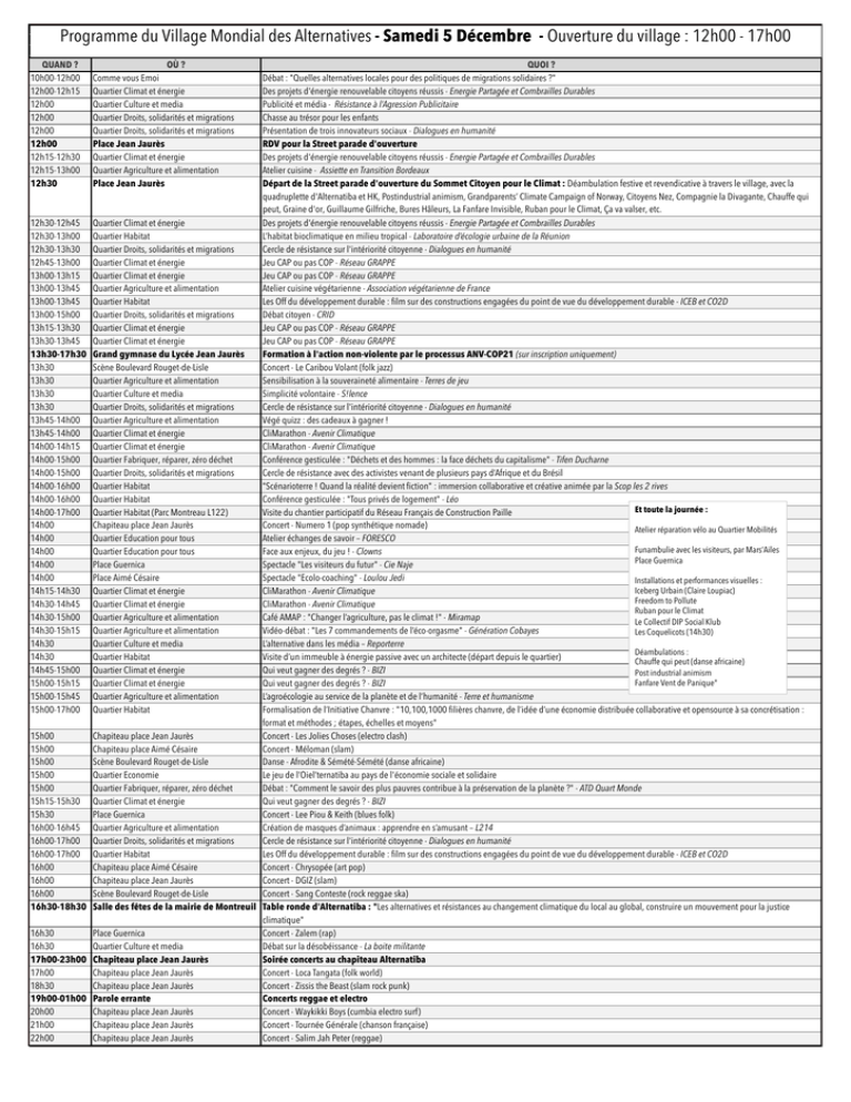 Programme du Village Mondial des Alternatives - Samedi 5 Décembre - Ouverture du village : 12h00 - 17h00 QUAND ? 10h00-12h00 12h00-12h15 12h00 12h00 12h00 12h00 12h15-12h30 12h15-13h00 12h30 12h30-12h45 12h30-13h00 12h30-13h30 12h45-13h00 13h00-13h15 13h00-13h45 13h00-13h45 13h00-15h00 13h15-13h30 13h30-13h45 13h30-17h30 13h30 13h30 13h30 13h30 13h45-14h00 13h45-14h00 14h00-14h15 14h00-15h00 14h00-15h00 14h00-16h00 14h00-16h00 14h00-17h00 14h00 14h00 14h00 14h00 14h00 14h15-14h30 14h30-14h45 14h30-15h00 14h30-15h15 14h30 14h30 14h45-15h00 15h00-15h15 15h00-15h45 15h00-17h00 15h00 15h00 15h00 15h00 15h00 15h15-15h30 15h30 16h00-16h45 16h00-17h00 16h00-17h00 16h00 16h00 16h00 16h30-18h30 16h30 16h30 17h00-23h00 17h00 18h30 19h00-01h00 20h00 21h00 22h00 OÙ ? Comme vous Emoi Quartier Climat et énergie Quartier Culture et media Quartier Droits, solidarités et migrations Quartier Droits, solidarités et migrations Place Jean Jaurès Quartier Climat et énergie Quartier Agriculture et alimentation Place Jean Jaurès QUOI ? Débat : "Quelles alternatives locales pour des politiques de migrations solidaires ?" Des projets d'énergie renouvelable citoyens réussis - Energie Partagée et Combrailles Durables Publicité et média - Résistance à l’Agression Publicitaire Chasse au trésor pour les enfants Présentation de trois innovateurs sociaux - Dialogues en humanité RDV pour la Street parade d'ouverture Des projets d'énergie renouvelable citoyens réussis - Energie Partagée et Combrailles Durables Atelier cuisine - Assiette en Transition Bordeaux Départ de la Street parade d'ouverture du Sommet Citoyen pour le Climat : Déambulation festive et revendicative à travers le village, avec la quadruplette d'Alternatiba et HK, Postindustrial animism, Grandparents’ Climate Campaign of Norway, Citoyens Nez, Compagnie la Divagante, Chauffe qui peut, Graine d'or, Guillaume Gilfriche, Bures Hâleurs, La Fanfare Invisible, Ruban pour le Climat, Ça va valser, etc. Quartier Climat et énergie Des projets d'énergie renouvelable citoyens réussis - Energie Partagée et Combrailles Durables Quartier Habitat L’habitat bioclimatique en milieu tropical - Laboratoire d’écologie urbaine de la Réunion Quartier Droits, solidarités et migrations Cercle de résistance sur l'intériorité citoyenne - Dialogues en humanité Quartier Climat et énergie Jeu CAP ou pas COP - Réseau GRAPPE Quartier Climat et énergie Jeu CAP ou pas COP - Réseau GRAPPE Quartier Agriculture et alimentation Atelier cuisine végétarienne - Association végétarienne de France Quartier Habitat Les Off du développement durable : film sur des constructions engagées du point de vue du développement durable - ICEB et CO2D Quartier Droits, solidarités et migrations Débat citoyen - CRID Quartier Climat et énergie Jeu CAP ou pas COP - Réseau GRAPPE Quartier Climat et énergie Jeu CAP ou pas COP - Réseau GRAPPE Grand gymnase du Lycée Jean Jaurès Formation à l'action non-violente par le processus ANV-COP21 (sur inscription uniquement) Scène Boulevard Rouget-de-Lisle Concert - Le Caribou Volant (folk jazz) Quartier Agriculture et alimentation Sensibilisation à la souveraineté alimentaire - Terres de jeu Quartier Culture et media Simplicité volontaire - S!lence Quartier Droits, solidarités et migrations Cercle de résistance sur l'intériorité citoyenne - Dialogues en humanité Quartier Agriculture et alimentation Végé quizz : des cadeaux à gagner ! Quartier Climat et énergie CliMarathon - Avenir Climatique Quartier Climat et énergie CliMarathon - Avenir Climatique Quartier Fabriquer, réparer, zéro déchet Conférence gesticulée : "Déchets et des hommes : la face déchets du capitalisme" - Tifen Ducharne Quartier Droits, solidarités et migrations Cercle de résistance avec des activistes venant de plusieurs pays d’Afrique et du Brésil Quartier Habitat "Scénarioterre ! Quand la réalité devient fiction" : immersion collaborative et créative animée par la Scop les 2 rives Quartier Habitat Conférence gesticulée : "Tous privés de logement" - Léo Et toute la journée : Quartier Habitat (Parc Montreau L122) Visite du chantier participatif du Réseau Français de Construction Paille Chapiteau place Jean Jaurès Concert - Numero 1 (pop synthétique nomade) Atelier réparation vélo au Quartier Mobilités Quartier Education pour tous Atelier échanges de savoir – FORESCO Funambulie avec les visiteurs, par Mars’Ailes Quartier Education pour tous Face aux enjeux, du jeu ! - Clowns Place Guernica Place Guernica Spectacle "Les visiteurs du futur" - Cie Naje Place Aimé Césaire Spectacle "Ecolo-coaching" - Loulou Jedi Installations et performances visuelles : Iceberg Urbain (Claire Loupiac) Quartier Climat et énergie CliMarathon - Avenir Climatique Freedom to Pollute Quartier Climat et énergie CliMarathon - Avenir Climatique Ruban pour le Climat Quartier Agriculture et alimentation Café AMAP : "Changer l’agriculture, pas le climat !" - Miramap Le Collectif DIP Social Klub Quartier Agriculture et alimentation Vidéo-débat : "Les 7 commandements de l’éco-orgasme" - Génération Cobayes Les Coquelicots (14h30) Quartier Culture et media L’alternative dans les média – Reporterre Déambulations : Quartier Habitat Visite d’un immeuble à énergie passive avec un architecte (départ depuis le quartier) Chauffe qui peut (danse africaine) Quartier Climat et énergie Qui veut gagner des degrés ? - BIZI Post industrial animism Fanfare Vent de Panique" Quartier Climat et énergie Qui veut gagner des degrés ? - BIZI Quartier Agriculture et alimentation L’agroécologie au service de la planète et de l’humanité - Terre et humanisme Quartier Habitat Formalisation de l’Initiative Chanvre : "10,100,1000 filières chanvre, de l’idée d’une économie distribuée collaborative et opensource à sa concrétisation : format et méthodes ; étapes, échelles et moyens" Chapiteau place Jean Jaurès Conc