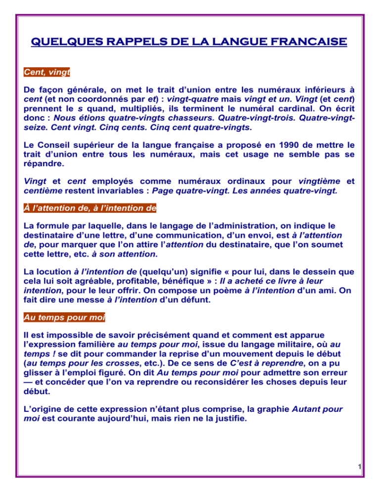 QUELQUES RAPPELS DE LA LANGUE FRANCAISE Cent, vingt De façon générale, on met le trait d’union entre les numéraux inférieurs à cent (et non coordonnés par et) : vingt-quatre mais vingt et un. Vingt (et cent) prennent le s quand, multipliés, ils terminent le numéral cardinal. On écrit donc : Nous étions quatre-vingts chasseurs. Quatre-vingt-trois. Quatre-vingtseize. Cent vingt. Cinq cents. Cinq cent quatre-vingts. Le Conseil supérieur de la langue française a proposé en 1990 de mettre le trait d’union entre tous les numéraux, mais cet usage ne semble pas se répandre. Vingt et cent employés comme numéraux ordinaux pour vingtième et centième restent invariables : Page quatre-vingt. Les années quatre-vingt. À l’attention de, à l’intention de La formule par laquelle, dans le langage de l’administration, on indique le destinataire d’une lettre, d’une communication, d’un envoi, est à l’attention de, pour marquer que l’on attire l’attention du destinataire, que l’on soumet cette lettre, etc. à son attention. La locution à l’intention de (quelqu’un) signifie « pour lui, dans le dessein que cela lui soit agréable, profitable, bénéfique » : Il a acheté ce livre à leur intention, pour le leur offrir. On compose un poème à l’intention d’un ami. On fait dire une messe à l’intention d’un défunt. Au temps pour moi Il est impossible de savoir précisément quand et comment est apparue l’expression familière au temps pour moi, issue du langage militaire, où au temps ! se dit pour commander la reprise d’un mouvement depuis le début (au temps pour les crosses, etc.). De ce sens de C’est à reprendre, on a pu glisser à l’emploi figuré. On dit Au temps pour moi pour admettre son erreur — et concéder que l’on va reprendre ou reconsidérer les choses depuis leur début. L’origine de cette expression n’étant plus comprise, la graphie Autant pour moi est courante aujourd’hui, mais rien ne la justifie. 1 Ci-annexé, ci-inclus, ci-joint 1. L’accord se fait normalement : a) lorsque ces locutions adjectives, avec la fonction d’épithète, suivent immédiatement le nom auquel elles se rapportent : La lettre ci-annexée. La note ci-incluse apporte les précisions nécessaires. Veuillez remplir la déclaration ci-jointe. Ne communiquez à personne les pièces ci-jointes. b) lorsqu’elles sont attributs du sujet : Votre lettre est ci-jointe. 2. Inversement, elles demeurent invariables lorsqu’elles ont une valeur nettement adverbiale (elles sont alors traitées sur le modèle des locutions adverbiales ci-après ou ci-contre), ce qui est le cas notamment lorsqu’elles sont placées : a) en tête d’une phrase sans verbe, devant un groupe nominal (avec ou sans déterminant) : Ci-annexé la copie des pièces demandées. Ci-inclus les photocopies du document. Ci-joint l’expédition du jugement. Ci-joint les deux quittances exigées. Ou encore : Ci-joint copie du rapport. On écrira cependant : Ci-incluses, ces pièces vous sont communiquées pour information (tour rare, il est vrai), la locution étant ici en apposition. b) à l’intérieur d’une phrase, avec un nom sans déterminant (qu’elles précèdent ordinairement) : Je vous adresse ci-inclus quittance de votre versement. Vous trouverez ci-joint copie du contrat. La circulaire dont vous trouverez copie ci-inclus. 3. Dans les autres cas, lorsque ces locutions sont employées, dans le corps de la phrase, avec un substantif accompagné d’un déterminant, l’usage n’est pas fixé. Selon qu’on leur accorde une valeur adjective ou adverbiale — sans qu’il soit jamais possible de trancher—, on fait ou non l’accord. La huitième édition de l’Académie (1935) ne manquait pas de rendre compte d’une telle latitude : vous trouverez ci-incluse la copie que vous m’avez demandée (article CI). Vous trouverez ci-inclus une lettre de votre père (article INCLUS). On écrira donc : Je vous fais parvenir ci-joint, ou ci-joints plusieurs exemplaires de mon mémoire. Il en va de même lorsque CI-ANNEXÉ, CIINCLUS ou CI-JOINT peuvent être considérés comme l’attribut d’un pronom antéposé : Retournez-moi les formulaires que vous trouverez ci-joints. La lettre que vous trouverez ci-incluse. Mais l’invariabilité —Retournez-moi les formulaires que vous trouverez ci-joint. La lettre que vous trouverez ci-inclus — apparaissant aussi pleinement justifiée, aucune des deux graphies ne saurait être tenue pour fautive. 2 L’incertitude observée dans l’usage, qui ne doit rien, on le voit, à l’hésitation ou à l’arbitraire, peut cependant être levée en fonction de connotations diverses tenant au contexte, ou parfois même à la recherche de tel ou tel effet stylistique. Si Bernanos écrit à l’un de ses correspondants : « Vous trouverez ci-joint les pages dactylographiées de mon roman », Hugo préfère : « Je vous envoie ci-incluses des paroles prononcées ici par moi au moment de la proscription ». on se plaît à relever chez Musset (Nouvelles, « Margot », I) l’exemple suivant : « Je prends la liberté de vous envoyer ci-jointes des rillettes ». Euro, cent L’Académie française rappelle que le mot euro prend la marque du pluriel : on écrit un euro, des euros (Cf Journal officiel du 2 décembre 1997). La centième partie de l’euro doit se dire et s’écrire centime (Communiqué de presse du 13 décembre 2001). La marque du pluriel n’étant pas la même selon que l’on utilise telle ou telle langue de l’Union européenne, c’est la forme euro qui figure sur les billets et sur les pièces. Elle peut être considérée comme un symbole et non comme l’indication de n unités monétaires. (Cf site de la Banque de France). Son abréviation est, selon la norme ISO, EUR. Féminisation (Déclaration de l’Académie française, 14 juin 1984) L’Académie a appris par la presse l’existence d’une Commission de terminologi