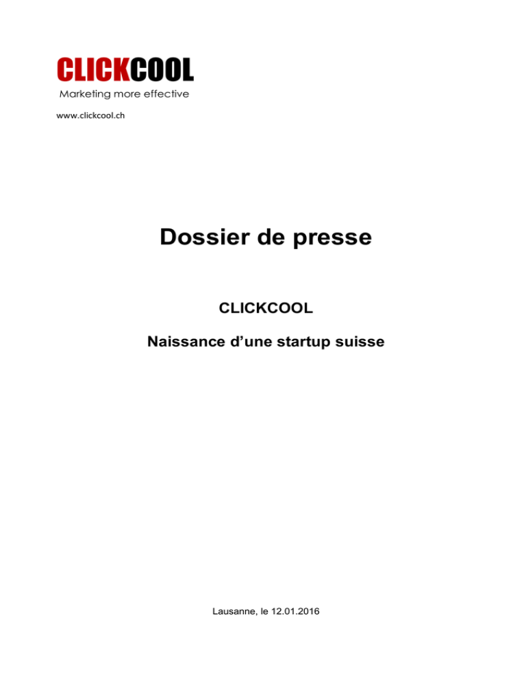 CLICKCOOL Marketing more effective www.clickcool.ch Dossier de presse CLICKCOOL Naissance d’une startup suisse Lausanne, le 12.01.2016 CLICKCOOL Dossier de presse 12.01.2016 Marketing more effective Table des Matières FICHE D’IDENTITÉ ..................................................................................................................................................... 3 PRÉSENTATION ........................................................................................................................................................ 4 …EN UNE PHRASE ............................................................................................................................................................ 4 …EN UN PARAGRAPHE ...................................................................................................................................................... 4 LES 3 VALEURS................................................................................................................................................................. 4 LES OBJECTIFS .................................................................................................................................................................. 4 HISTORIQUE .................................................................................................................................................................... 4 LES SERVICES............................................................................................................................................................ 5 VITRINE VIRTUELLE........................................................................................................................................................... 5 PAGE CORPORATE ............................................................................................................................................................ 5 GÉOLOCALISATION DE PROXIMITÉ ....................................................................................................................................... 5 RÉFÉRENCEMENT SEO ...................................................................................................................................................... 5 ANNONCES ..................................................................................................................................................................... 5 BANNIÈRES PUBLICITAIRES................................................................................................................................................. 5 E-COMMERCE .................................................................................................................................................................. 5 LES ATOUTS ............................................................................................................................................................. 6 L’ÉQUIPE .................................................................................................................................................................. 6 LES DIRIGEANTS ............................................................................................................................................................... 6 LES COLLABORATEURS ....................................................................................................................................................... 6 LE BUSINESS MODEL ................................................................................................................................................ 7 LES CLIENTS CIBLÉS ........................................................................................................................................................... 7 COMPOSITION DU CHIFFRE D’AFFAIRES ................................................................................................................................ 7 OUVERTURE DU CAPITAL ................................................................................................................................................... 7 LE MOT DU CEO ....................................................................................................................................................... 7 CONTACT PRESSE ..................................................................................................................................................... 7 2 CLICKCOOL Dossier de presse 12.01.2016 Marketing more effective Fiche d’identité Nom Commercial ClickCool Forme et capital SA au capital de 100'000 CHF Domaine d’activité Digital Marketing Date de Création Lancement de la plateforme : 20 Juillet 2015 Début de la commercialisation : 01 Août 2015 Clients 400 clients en 2015, et 2’000 attendus en 2016 Implantation Suisse Romande Suisse Alémanique planifiée en 2016 Suisse Italienne planifiée en 2016 Chiffre d’affaires (prévision 2016) 2'000'000 CHF Equipe de direction Mme Nadia Araba, CEO de ClickCool M. Steven Hori, CTO de ClickCool Effectif ClickCool compte 11 collaborateurs Plusieurs consultants externes selon le besoin Siège Social Rue Mauborget 12 1003 Lausanne Site web www.clickcool.ch 3 CLICKCOOL Dossier de presse 12.01.2016 Marketing more effective Présentation …En une phrase ClickCool est une startup suisse qui propose aux entreprises une plateforme Web hybride, pour présenter leurs services et disposer facilement d’une vitrine virtuelle. …En un paragraphe ClickCool a pour mission de donner de la visibilité aux entreprises suisses grâce à son concept novateur. Les entreprises peuvent créer des vitrines virtuelles via une plateforme en ligne, incluant des services annexes, pour se faire connaître. ClickCool rassemble en une seule interface tout ce qui est existant dans le domaine des annuaires, du e-commerce et des petites annonces, mais nettem