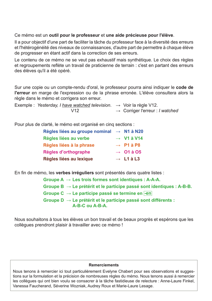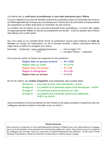 Ce mémo est un outil pour le professeur et une aide précieuse pour l'élève. Il a pour objectif d'une part de faciliter la tâche du professeur face à la diversité des erreurs et l'hétérogénéité des niveaux de connaissances, d'autre part de permettre à chaque élève de progresser en étant actif dans la correction de ses erreurs. Le contenu de ce mémo ne se veut pas exhaustif mais synthétique. Le choix des règles HWUHJURXSHPHQWVUHÀqWHXQWUDYDLOGHSUDWLFLHQQHGHWHUUDLQF HVWHQSDUWDQWGHVHUUHXUV des élèves qu'il a été opéré. Sur une copie ou un compte-rendu d'oral, le professeur pourra ainsi indiquer le code de l'erreur en marge de l'expression ou de la phrase erronée. L'élève consultera alors la règle dans le mémo et corrigera son erreur. ([HPSOHYesterday, I have watched television ĺ 9RLUODUqJOH9 9 ĺ &RUULJHUO HUUHXUI watched 3RXUSOXVGHFODUWpOHPpPRHVWRUJDQLVpHQFLQTVHFWLRQV Règles liées au groupe nominal ĺN1 à N20 Règles liées au verbe ĺV1 à V14 Règles liées à la phrase ĺ P1 à P8 Règles d’orthographe ĺ O1 à O5 Règles liées au lexique ĺ L1 à L3 (Q¿QGHPpPROHVverbes irréguliers VRQWSUpVHQWpVGDQVTXDWUHOLVWHV Groupe A ĺ Les trois formes sont identiques : A-A-A. Groupe B ĺ Le prétérit et le participe passé sont identiques : A-B-B. *URXSH&ĺ/HSDUWLFLSHSDVVpVHWHUPLQHHQ -en *URXSH'ĺ/HSUpWpULWHWOHSDUWLFLSHSDVVpVRQWGLIIpUHQWV A-B-C ou A-B-A. Nous souhaitons à tous les élèves un bon travail et de beaux progrès et espérons que les collègues prendront plaisir à travailler avec ce mémo ! Remerciements Nous tenons à remercier ici tout particulièrement Evelyne Chabert pour ses observations et suggestions sur la formulation et la précision de nombreuses règles du mémo. Nous tenons aussi à remercier OHVFROOqJXHVTXLRQWELHQYRXOXVHFRQVDFUHUjODWkFKHIDVWLGLHXVHGHUHOHFWXUH$QQH/DXUH)LQNHO 9DQHVVD)DXFKHUDQG6pYHULQH:R]QLDN$XGUH\5RX[HW0DULH/DXUH/HVDJH INDEX N1 0DMXVFXOHV V1 )RUPHVGXYHUEHYRL[DFWLYH N2 A / An V2 )RUPHVGXYHUEHYRL[SDVVLYH N3 3OXULHOGHVQRPV V3 3eSHUVRQQHGXSUpVHQWVLPSOH N4 3OXULHOVLUUpJXOLHUV V4 3ODFHGHODQpJDWLRQ N5 1RPVLQGpQRPEUDEOHV V5 $X[LOLDLUHV'R'LG N6 )pPLQLQPDVFXOLQQHXWUH V6 ,PSpUDWLI N7 1RPVGHSD\VFRQWLQHQWVHWODQJXHV V7 $X[LOLDLUHVPRGDX[ N8 Pas de -s DX[DGMHFWLIV V8 $X[LOLDLUHV 's N9 $GMHFWLIVGHYDQWOHQRP V9 $X[LOLDLUHV 'd N10 &RPSDUDWLIHWVXSHUODWLI V10 ,O\DAgoSUpWpULW N11 The rich / The poorHWF V11 ,O\DThere is / There are N12 Every / Each + singulier V12 3UpWpULWDYHFOHVGDWHVHWAgo N13 Pluriel de This / That V13 Verbes suivis de To + V N14 &RQVWUXLUHXQJpQLWLI V14 9HUEHDYHFGHX[FRPSOpPHQWV N15 So / Such N16 3UpSRVLWLRQGHYDQWXQHGDWH N17 His / Her N18 3URQRPVHWGpWHUPLQDQWVSHUVRQQHOV N19 1H[WZHHN/DVWZHHNHWF N20 /HVDFWLYLWpVVZLPPLQJER[LQJHWF A N N E X E 3ULQFLSDX[YHUEHVLUUpJXOLHUV *URXSH$ĺ$$$ *URXSH%ĺ$%% *URXSH&ĺ3DUWLFLSHSDVVpHQ -en *URXSH'ĺ$%&RX$%$ P1 2UGUHGHVPRWVGDQVOHVTXHVWLRQV O1 7UDQVIRUPHUOHVWHUPLQDLVRQVHQ -y P2 4XHVWLRQVDYHF+RZDGYHUEHDGMHFWLI O2 Construire des adverbes en -ly P3 7KHUHWKH\ UHWKHLU,WVLW V O3 7R7RR7ZR P4 Too / Also O4 Mots en wh- P5 Who / Which O5 MustĺMustn't P6 3DVGHGRXEOHQpJDWLRQHQDQJODLV P7 1HSOXV P8 Enough L1 $QJODLVEULWDQQLTXH$QJODLVDPpULFDLQ L2 Agree / Don't agree L3 ([FLWLQJ([FLWHG N4 Pluriels irréguliers Certains noms ont un pluriel irrégulier. En voici quelques-uns à retenir : DSHUVRQĺpeople űQuand on dit two peoplesFHODVLJQL¿Hdeux peuples. a maQĺPen a womaQĺZRPen a louseĺOice a mouseĺPice a fooWĺIeet a gooVHĺJeese a tooWKĺWeeth DFKLOGĺFKLOGUen DTXL]ĺTXL]zes N5 Noms indénombrables Beaucoup de noms sont indénombrables (entités qu'on ne peut pas compter). Ils sont toujours au singulier. Certains sont évidents : courage, milk, sand, etc. D’autres sont à apprendre par cœur : advice, equipment, furniture, garbage, hair, homework, information, lightning, luggage, rubbish, software, travel, weather, work. Harry’s main quality is courage. I have some homework to do. What terrible weather! His hair looks really great. I need some advice. N6 Féminin, masculin, neutre Les noms sont neutres en anglais. Le genre (féminin ou masculin) est réservé aux noms pour lesquels il y a une distinction physique, My consoleIHOORQWKHÀRRUit is PkOH RX IHPHOOH QDWXUHOOH HW LGHQWL¿DEOH 2Q broken now. emploie donc le pronom IT si on ne sait pas : un tout Look at his tiny cat; it looks so cute. petit bébé, un poisson, etc.). űNe pas transposer le français ! En anglais : - une entreprise, une console de jeux ne sont pas féminins, - un roman, un poème ne sont pas masculins. N7 Noms de pays, continents et langues • Les noms de pays et continents s’emploient sans article à l’exception de quelques-uns. Voici les principaux à retenir : the USA, the United Kingdom, the Netherlands. Le verbe qui suit un nom de pays est toujours au singulier. • Les noms de langues s'emploient également sans article. N8 Pas de -s aux adjectifs Tous les adjectifs sont invariables. űCette règle est aussi vraie pour les adjectifs de nationalité. űCette règle vaut aussi pour les adjectifs transformés en comparatif ou superlatif. N9 Adjectifs devant le nom Les adjectifs, les adjectifs associés à un adverbe, ou les adjectifs transformés en comparatif ou superlatif se placent devant le nom. • The USA is a huge country. The Netherlands is smaller than France. Wales is in Great Britain. • Chinese is very easy compared to German or Russian. They both looked beautiful on the photo. He loves American cars. He found bigger pumpkins for Halloween. Look at this very big blue box! This is the highest building in the city. V5 Auxiliaires DO / DID Au présent simple et au prétérit, lorsqu’on veut faire des phrases négatives ou des questions, il faut utiliser les auxiliaires : • DO / DOES (présent), • DID (prétérit). Le verbe est alors à la forme base verbale. • Does she speak French? I don’t like¿VK • They didn’t likeP\FKRFRODWHFDNH Did you ¿QG them nice? Didn’t you listen to the teacher? V6 Imp