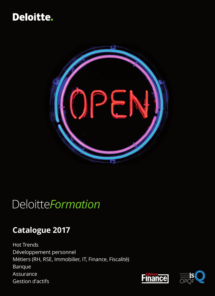 DeloitteFormation Catalogue 2017 Hot Trends Développement personnel Métiers (RH, RSE, Immobilier, IT, Finance, Fiscalité) Banque Assurance Gestion d'actifs DeloitteFormation c’est aussi... DeloitteFormation Créons ensemble vos formations sur mesure ! Vous souhaitez • Proposer à vos équipes une formation intégrant des enjeux spécifiques à votre société et/ou à votre secteur d’activité ? • Partager un même contenu pédagogique en France et/ou à l’international ? • Déployer rapidement une formation auprès d’une large population ? • Construire un parcours présentiel et virtuel ? • Transformer une formation présentielle en formation virtuelle ? Prise de recul Valeur ajoutée Pragmatisme Réactivité Confidentialité • Proposer un coaching métier à un collaborateur en prise de poste ou en mobilité ? Flexibilité • Proposer un parcours apprenant à des équipes en reconversion ? Agilité • Aligner votre plan de formation avec la stratégie de votre société ? Contactez-nous ! Editorial Un grand merci ! En effet, grâce à vos suggestions et aux très nombreuses formations conçues et animées pour répondre à vos demandes, notre catalogue s’est considérablement enrichi avec de nombreuses nouveautés en 2017 dont vous apprécierez la variété : • tendances technologiques, RH et M&A, • coaching individuel, coaching collectif et coaching métiers, • offre très flexible pour perfectionner l’anglais opérationnel, • et bien sûr de nouvelles formations en Management et en IT pour accompagner l’évolution de vos besoins opérationnels. Vous avez apprécié l’engagement pris en 2016 d’assurer 100 % des formations planifiées, nous allons donc continuer en 2017 ! Tous les consultants formateurs de Deloitte, Taj et In Extenso qui animent nos formations sont très motivés par ces succès et enthousiastes pour continuer à partager leurs expertises et les meilleures pratiques au cours de formations de haut niveau, adaptées aux enjeux opérationnels des participants. Nous aurons plaisir à répondre à toutes vos questions et à construire avec vous des parcours spécifiques pour vos équipes, en distanciel et en présentiel, à réaligner vos plans de formation, à créer vos universités ou à externaliser la gestion de vos plans de formations. En un mot, nous sommes « Open » ! A très bientôt, Véronique Staat Associée Organisme de Formation Deloitte Inscriptions Questions pédagogiques, développement de nouveaux programmes et autres services Julie Bodson Eléonore Morin Anne-Claire Freudenreich Agnès Montenvert Tél. : + 33 1 58 37 02 51 [email protected] ou [email protected] Tél. : +33 1 55 61 60 82 Mobile : +33 6 87 89 00 96 [email protected] ou [email protected] Tél. : +33 1 55 61 21 77 Mobile : +33 6 71 53 81 34 [email protected] ou [email protected] Tél. : +33 1 40 88 71 26 Mobile : +33 6 32 88 86 73 [email protected] ou [email protected] Deloitte Formation 185, avenue Charles-de-Gaulle 92524 - Neuilly-sur-Seine cedex Internet : https://formation.deloitte.fr/ Catalogue Deloitte Formation 2017 3 DeloitteFormation c’est aussi... Le saviez-vous ? Nous nous engageons à assurer 100 % des formations planifiées. Retrouvez toutes nos informations sur https://formation.deloitte.fr 4 Inscriptions sur le site internet : https://formation.deloitte.fr Sommaire Hot Trends 27 Tech Trends - Innover à l’ère du digital New 28 HR Trends - Nouvelle organisation : différente par sa structure New 29 M&A Trends - Le M&A au cœur de la stratégie des entreprises New 29 Développement Personnel 33 Efficacité Professionnelle Métiers 61 RH Découverte du métier de Comp & Ben 64 Approfondissement du métier de Comp & Ben 65 Réussir ses négociations sociales 66 Construire et manager le dialogue social au quotidien 66 Piloter une restructuration responsable 67 Animer ses instances représentatives du personnel 67 Maîtriser les obligations sociales de l’entreprise 68 Piloter une réorganisation 68 Manager efficacement 34 Formation de formateurs : Les fondamentaux 69 Accompagner le changement 34 Formation de formateurs : la boîte à outils du digital 70 Gérer son temps et ses priorités 35 La révolution digitale 71 Manager à l’ère du digital 35 Manager à distance 36 Conduire un entretien annuel 36 Animer avec succès une réunion, un atelier, une formation 37 Réaliser une mission de conseil Responsabilité Sociale Entreprise Du reporting RSE au reporting intégré : enjeux, perspectives et pratiques 72 37 Politiques et économie de l’énergie : panorama, techniques, marchés, politiques énergie climat 72 Méthodologie du conseil New 38 Marketing durable 73 Manager Agile 39 Agilité comportementale 40 Changement climatique et stratégie “deux degrés” des entreprises 74 Agilité d’entreprise : enjeux pour une direction générale 40 La biodiversité et les activités de l’entreprise 74 Manager un projet 41 Manager un projet avec la chaîne critique 41 Immobilier Manager une équipe projet 42 Breeam 75 Certification environnementale – Leed V4 75 43 Devenir assesseur BiodiverCity 76 44 Investissement immobilier : une modélisation efficace et fiable 77 Manager une équipe projet en couleurs (Arc-en-Ciel©) New Synergie d’équipe de direction (Arc-en-Ciel©) New Manager efficacement en couleurs (Arc-en-Ciel©) New 45 © IT Coaching Coaching individuel « Soft skills » New 48 Système d’information Coaching collectif « Soft skills » New 49 Les fondamentaux de l’IT expliqués aux financiers 78 Coaching individuel « Métiers » New 50 Appréhender les méthodes de coaching managérial 51 Audit interne informatique : identifier les travaux et élaborer son plan 78 Le contrôle interne informatique – Le chainon indispensable dans la maîtrise du SI 79 Les clés de la gouvernance du SI 79 Anglais opérationnel Préparez vos présentations orales en anglais 3 mois New 52 SAM ACADEMY : SAM Basic New 80 Retrouvez