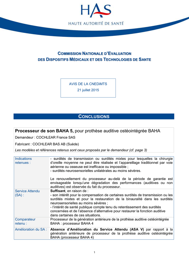 1 COMMISSION NATIONALE D’EVALUATION DES DISPOSITIFS MÉDICAUX ET DES TECHNOLOGIES DE SANTE AVIS DE LA CNEDiMTS 21 juillet 2015 CONCLUSIONS Processeur de son BAHA 5, pour prothèse auditive ostéointégrée BAHA Demandeur : COCHLEAR France SAS Fabricant : COCHLEAR BAS AB (Suède) Les modèles et références retenus sont ceux proposés par le demandeur (cf. page 3) Indications retenues : Service Attendu (SA) : Comparateur retenu : - surdités de transmission ou surdités mixtes pour lesquelles la chirurgie d’oreille moyenne ne peut être réalisée et l’appareillage traditionnel par voie aérienne ou osseuse est inefficace ou impossible ; - surdités neurosensorielles unilatérales au moins sévères. Le renouvellement du processeur au-delà de la période de garantie est envisageable lorsqu’une dégradation des performances (auditives ou non auditives) est observée du fait du processeur. Suffisant, en raison de : - son intérêt pour la compensation de certaines surdités de transmission ou les surdités mixtes et pour la restauration de la binauralité dans les surdités neurosensorielles au moins sévères ; - l’intérêt de santé publique compte tenu du retentissement des surdités concernées et de l’absence d’alternative pour restaurer la fonction auditive dans certaines de ces situations. Processeur de la génération antérieure de la prothèse auditive ostéointégrée BAHA : processeur BAHA 4 Amélioration du SA : Absence d’Amélioration du Service Attendu (ASA V) par rapport à la génération antérieure de processeur de la prothèse auditive ostéointégrée BAHA (processeur BAHA 4) 1 2 Type d’inscription : Nom de marque Durée d’inscription : Jusqu’à la date de fin de prise en charge de la prothèse auditive ostéointégrée BAHA (30 octobre 2017) Données analysées : Aucune donnée clinique spécifique du processeur BAHA 5 n’est disponible. La demande correspond à une évolution de la partie externe (BAHA 4) de la prothèse auditive ostéointégrée BAHA pour laquelle la Commission Nationale d’Evaluation des Dispositifs Médicaux et des Technologies de Santé a émis un avis le 7 octobre 2014. Les évolutions apportées concernent notamment la réduction de la taille du vibrateur et par conséquent du processeur, l’ajout d’une puce permettant une amélioration du traitement du signal et une connectivité sans fil, visant à améliorer les conditions d’écoute. Les conclusions de l’avis de la CNEDIMTS du 7 octobre 2014 concernant la prothèse auditive ostéointégrée BAHA s’appliquent au processeur BAHA 5. Éléments conditionnant le SA : Spécifications techniques : Modalités de prescription et d’utilisation : Conditions du renouvellement : Population cible : Celles définies par l’arrêté du 23 octobre 2009, publié au Journal Officiel du 30 octobre 2009. Celles définies pour la prothèse auditive ostéointégrée BAHA sur la LPPR. Celles définies pour la prothèse auditive ostéointégrée BAHA dans son avis du 7 octobre 2014. Au maximum 2100 mises en place de processeurs par an Avis 1définitif 2 3 ARGUMENTAIRE 01 NATURE DE LA DEMANDE Demande d’inscription sur la liste des produits et prestations mentionnés à l’article L.165-1 du code de la Sécurité Sociale. 01.1. MODÈLES ET RÉFÉRENCES Modèle Processeur BAHA 5 blond doré Processeur BAHA 5 noir Processeur BAHA 5 gris argenté Processeur BAHA 5 châtain Processeur BAHA 5 cuivré Référence 95201 95202 95203 95204 95205 01.2. CONDITIONNEMENT Le conditionnement est unitaire. Le processeur BAHA 5 est conditionné avec les éléments suivants : - un kit de nettoyage pour processeur - un bâtonnet de test - un couvre-pilier - des piles type 312 - un fil de sécurité - 3 couvercles de la fiche de programmation. 01.3. INDICATIONS REVENDIQUÉES Les indications revendiquées sont celles retenues sur la LPPR pour la prothèse auditive ostéointégrée BAHA : - surdités de transmission ou surdités mixtes pour lesquelles la chirurgie d’oreille moyenne ne peut être réalisée et l’appareillage traditionnel par voie aérienne ou osseuse est inefficace ou impossible ; - surdités neurosensorielles unilatérales au moins sévères. 01.4. COMPARATEUR REVENDIQUÉ Processeur de la génération antérieure de la prothèse auditive ostéointégrée BAHA : processeur BAHA 4. 02 HISTORIQUE DU REMBOURSEMENT Première demande d’inscription pour une nouvelle génération de processeur de son. La prothèse BAHA est commercialisée en France depuis 1987. L’implant avec pilier, l’implant et le pilier sont inscrits sur la LPPR au Chapitre 1er du titre III. La prothèse BAHA a d’abord était inscrite sur la LPPR de 1997 à 2009 sous une ligne générique (sans restriction d’indication). 3 4 Suite à l’avis du 24 juin 20081, la partie externe (processeur) et la partie implantable (pilier et implant) ont été inscrites sous nom de marque sur la liste LPPR (arrêté du 23 octobre 2009 publié au JO du 30 octobre 2009). Suite à l’avis de la Commission du 7 octobre 20142, la BAHA a obtenu son renouvellement d’inscription (arrêté du 7 avril 2015 publié au JO du 15 avril 2015). La Commission s’est prononcée sur les évolutions des gammes ultérieures. La LPPR précise les différents modèles d’implants et de piliers admis au remboursement. La nomenclature permet la prise en charge de l’implant et du pilier seul ou en association, et des différents processeurs (INTENSO, DIVINO, CORDELLE II, BP100, BP110 Power, BAHA 4). Les consommables et les réparations sont par ailleurs pris en charge au travers d’un forfait annuel (LPPR 2331043). 03 CARACTÉRISTIQUES DU PRODUIT 03.1. MARQUAGE CE Dispositif médical de classe IIa, notification par Intertek Semko AB (0413), Suède. 03.2. DESCRIPTION Le système implantable BAHA comporte 3 parties : - un implant titane ostéo-intégré placé chirurgicalement dans la corticale de l’os temporopariétal en arrière au-dessus