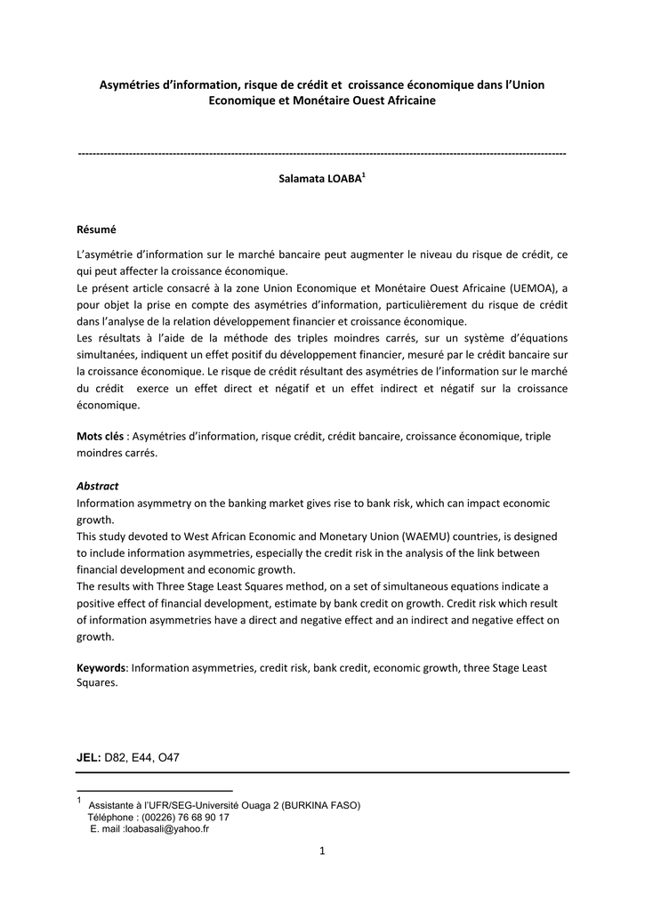 Asymétries d’information, risque de crédit et croissance économique dans l’Union Economique et Monétaire Ouest Africaine -------------------------------------------------------------------------------------------------------------------------------------Salamata LOABA1 Résumé L’asymétrie d’information sur le marché bancaire peut augmenter le niveau du risque de crédit, ce qui peut affecter la croissance économique. Le présent article consacré à la zone Union Economique et Monétaire Ouest Africaine (UEMOA), a pour objet la prise en compte des asymétries d’information, particulièrement du risque de crédit dans l’analyse de la relation développement financier et croissance économique. Les résultats à l’aide de la méthode des triples moindres carrés, sur un système d’équations simultanées, indiquent un effet positif du développement financier, mesuré par le crédit bancaire sur la croissance économique. Le risque de crédit résultant des asymétries de l’information sur le marché du crédit exerce un effet direct et négatif et un effet indirect et négatif sur la croissance économique. Mots clés : Asymétries d’information, risque crédit, crédit bancaire, croissance économique, triple moindres carrés. Abstract Information asymmetry on the banking market gives rise to bank risk, which can impact economic growth. This study devoted to West African Economic and Monetary Union (WAEMU) countries, is designed to include information asymmetries, especially the credit risk in the analysis of the link between financial development and economic growth. The results with Three Stage Least Squares method, on a set of simultaneous equations indicate a positive effect of financial development, estimate by bank credit on growth. Credit risk which result of information asymmetries have a direct and negative effect and an indirect and negative effect on growth. Keywords: Information asymmetries, credit risk, bank credit, economic growth, three Stage Least Squares. JEL: D82, E44, O47 1 Assistante à l’UFR/SEG-Université Ouaga 2 (BURKINA FASO) Téléphone : (00226) 76 68 90 17 E. mail :[email protected] 1 1. Introduction Les récentes crises financières internationales ont relancé le débat sur l’impact des instabilités financières sur la croissance économique. Ces déséquilibres sont la conséquence de l’existence des imperfections de l’information sur les marchés financiers. Pour Akerlof (1970), dans une économie avec information imparfaite, le fonctionnement décentralisé et concurrentiel des marchés ne conduit pas toujours à des résultats efficaces. Les asymétries d’information qui existent en effet entre la banque et l’emprunteur sont une source d’instabilité financière et peuvent avoir des effets négatifs sur la croissance économique. L’asymétrie d’information traduit une situation où lorsque deux agents sont engagés dans une transaction, un agent détient plus d’information que l’autre. Ces problèmes informationnels ont fait l’objet d’analyses théoriques et de vérifications empiriques. Sur le plan théorique, le débat oppose la nouvelle économie classique (NEC) et la nouvelle économie keynésienne (NEK). Pour la NEC, les agents économiques sont rationnels et exploitent au mieux toute l’information dont ils disposent pour établir leurs prévisions. Par conséquent, les agents ne font pas d'erreurs systématiques de prévisions et les équilibres sur les marchés se font par l’ajustement des prix. Par contre, pour la NEK, il existe une imperfection dans l’information mise à la disposition des agents économiques, ce qui conduit à des défaillances sur les marchés et remet en cause l’hypothèse d’ajustements instantanés de prix adoptée par la NEC. Pour la NEK, les phénomènes de sélection adverse et d’aléa moral entraînent des coûts sur les transactions et viennent perturber la détermination des équilibres sur les marchés. Nombreux auteurs (Bencivenga et Smith, 1993 ; Bose et Cothren ,1996 ; Bhattacharya, 1998 et Ho et Wang, 2005) ont mis en évidence l’effet négatif de la sélection adverse sur la croissance économique. Stiglitz et Weiss (1981) montrent que l’information asymétrique, notamment la sélection adverse sur le marché de crédit peut provoquer un rationnement. Dans l’hypothèse que le crédit bancaire est la seule source de financement externe, les activités des agents économiques qui dépendent de celui-ci se retrouvent réduites. Dans le court terme, l’investissement et la consommation sont réduites. Dans le long terme, la baisse de l’investissement entraine une baisse du capital accumulé et de la productivité dans l’économie et donc de la croissance économique. Bencivenga et Smith (1993) utilisent un modèle de croissance néoclassique et montrent que les asymétries d’information, notamment la sélection adverse a pour conséquence un rationnement du crédit, ce qui entraine une baisse du capital accumulé dans l’économie. Cette baisse du capital accumulé peut avoir un impact négatif sur la croissance économique. Bose et Cothren, (1996) et Ho 2 et Wang (2005) examinent l’effet de l’asymétrie d’information ex ante sur la croissance économique. L’asymétrie d’information qui existe entre prêteur et emprunteur, amène la banque soit à rationner certains emprunteurs, soit à instaurer un mécanisme de filtrage ou une combinaison des deux mécanismes. Les auteurs indiquent que ces mécanismes conduisent à un équilibre sur le marché du crédit qui ne maximise pas le taux de croissance économique. Jiarong (1996) explique avec un modèle de croissance néoclassique que l’aléa moral altère la croissance de l’économie. Le prêteur n’ayant pas une meilleure connaissance sur le revenu du projet de l’emprunteur doit engager des coûts de vérification. Pour Bhattacharya (1998), ces coûts rendent le financemen