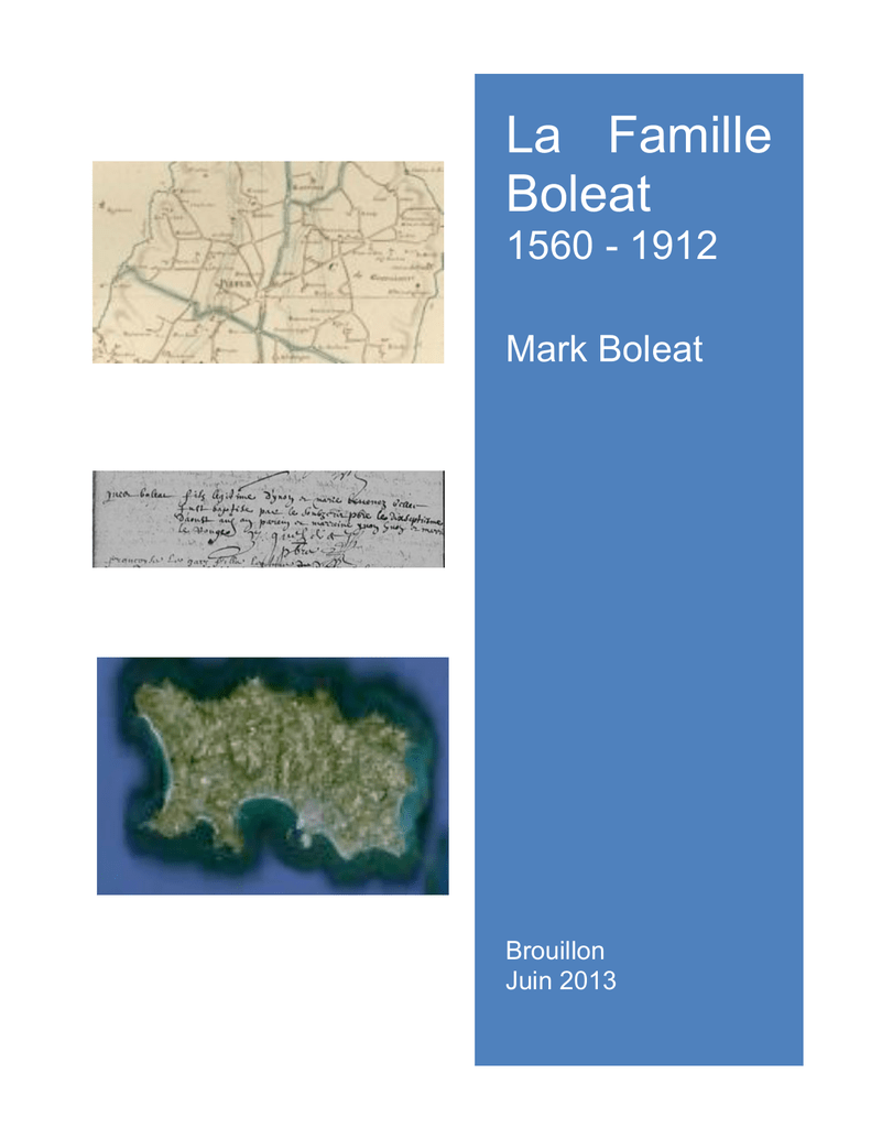 La Famille Boleat 1560 - 1912 Mark Boleat Brouillon Juin 2013 La partie de Bretagne d'où est originaire la famille Boléat. Les trois principaux sites étaient Garlan (au nord-est de Morlaix), Brélévenez (dans les faubourgs sud de Lannion) et Plufur ( à mi-chemin de Morlaix et Lannion). Il y avait également Botsorhel et Le Cloître-St-Thégonnec (au Sud-Est de Morlaix), Ploujean (site de l'actuel aéroport de Morlaix), et les communes à l'est de Plufur, en particulier Plouaret, Lanvellec, Plouzélambre, Tréduder, Ploumilliau, Trégrom, Tonquédec, Pluzunet, et Bégard. Table des Matieres Introduction 4 1. Vue d'ensemble 5 2. Rhône-Alpes 9 3. Garlan 12 4. Brélévenez 14 5. Bretagne, Plufur et Lanvellec 15 6. Plufur, 1560 à 1770 18 7. La Descendance de Allain-Marie Boléat, 1777 – 1853 22 8. La descendance de Jean Boléat, 1774 – 1849 28 9. Jersey 30 10. L'Amérique 33 11. La France, à partir de 1850 34 Arbres généalogiques 37 Liste Chronologique des Boléat nés avant 1914 45 Traduction par Alain Boléat Publié par Mark Boleat Northwood, Middlesex, Angleterre www.boleat.com [email protected] 3 Introduction Aujourd'hui, il y a environ 300 personnes portant le nom de famille Boléat. Plus de la moitié vivent en Bretagne, près de 30% dans le reste de la France, 15% à Jersey et quelques uns au Royaume-Uni, en Australie ou d'autres pays. Très certainement, ils sont tous parents, et trouvent leurs origines dans une petite région du nord de la Bretagne, au sud de Lannion et à l'est de Morlaix. Le présent document résume l'histoire de la famille Boléat. C'est essentiellement l'étude d'un nom, se concentrant sur les personnes nommées Boléat à la naissance, avec quelques rares remontées sur la ligne maternelle. Il s'appuie sur une grande variété de données généalogiques, dont l'accès a été facilité par Internet. Des versions antérieures de ce document ont été publiées en 2003, 2005, 2007, et 2009. Depuis lors, d'autres information sont devenues disponibles, et certaines erreurs relevées dans les premières versions. Deux informations nouvelles sont particulièrement notables. Les premières versions indiquaient que les Boléat d'aujourd'hui descendaient tous de deux frères, François Boléat, né en 1691, et Jean Boléat, né en 1695. En fait, tous les Boléat actuels descendent de François. Précédemment, on pouvait penser qu'un Yves Boléat, né en 1825 et ancêtre direct des Boléat de Jersey était un descendant de Jean. En fait, il se rattachait à Yves Boléat, né en 1818, et descendant de François. C'est son fils, Yves-Marie, né en 1853, qui émigra à Jersey, plutôt que le Yves-Marie né en 1857. Enfin, les précédentes versions ne parvenaient pas à rattacher la population croissante des Boléat de Brest avec le reste de la famille. Le lien a été établi, et François Boléat, né à Brest en 1905, est reconnu comme un descendant en ligne directe de François Boléat né en 1691. Je remercie Alain Boléat, mon cousin au treizième degré, de ses commentaires et additions utiles sur une version antérieure de cette étude, et pour sa traduction, permettant aujourd'hui de présenter une version en Français. Un arbre généalogique complet et d'autres informations sont disponibles sur le site web: www.boleat.com. Mark Boleat Londres, June 2013 Sources d’information En 1539, une ordonnance a imposé l'enregistrement des naissances. En 1579, cette obligation fut étendue aux mariages et aux décès. Il s'ensuit que les premières mentions pour la plupart des familles françaises datent de la seconde moitié du 16° siècle. Jusqu'en 1792, ces informations figuraient dans les registres paroissiaux. A partir de cette date, des détails plus complets étant requis, des actes d'état-civil furent enregistrés, puis regroupés dans des Archives Départementales. Les principales sources d'information pour cette étude ont été: − les archives du Centre Généalogique des Cotes d'Armor (www.genealogie22.com), et du Centre Généalogique du Finistère (www.cgf.asso.fr) − les Archives Départementales des Cotes d'Armor (www.archives.cotesdarmor.fr) − Des éléments obtenus directement des membres de la famille Boléat en France et à Jersey. Notes 1. Les dates retenues pour les naissances, mariages et décès sont autant que possible les dates exactes, mais peuvent être aussi des dates proches, telles que les dates d'enregistrement. 2. Une date complète signifie généralement qu'il existe un acte complet sur l’événement. Lorsqu'une année apparaît seule, elle est calculée à partir d'un âge dûment enregistré, par exemple lors d'un mariage ou d'un décès. Les mentions env (environ) ou ca (circa) sous-entendent une approximation basée sur une autre date connue. Ainsi, une naissance est supposée se situer entre 20 et 30 ans avant le mariage. Par conséquent, ces dates laissent place à une marge d'erreur importante. 3. Les lieux enregistrés dans les archives peuvent être ceux de l'événement, ou ceux de l'enregistrement de l'acte. 1. Vue d'ensemble Le Nom Boleat Le nom Boléat signifie «sonneur de cloches», dérivé du Breton 'Bole' – une cloche. Quelquefois, les archives font mention de 'Le Boléat' plutôt que Boléat, mais c'est le cas fréquemment pour de nombreux autres noms en France. Plus intéressant, la forme Bolléat a été adoptée par une partie de la famille, y compris par quelques-uns vivant de nos jours. Ceci semble résulter d'un certain nombre d'erreurs lors de l'enregistrement de naissances, sous le nom Bolléat au lieu de Boléat, à partir de 1870. En tout cas, jusqu'en 1839, on trouve mention du décès d'un Marc Bolléat, alors que sa naissance un an plus tôt apparaît clairement sous la forme 'Boléat'. De même, en 1840 la naissance d'un enfant fut enregistrée sous Bolléat. Il semble y a voir eu peu de déformations du nom, peut-être parce que la famille est restée longtemps confinée en Br