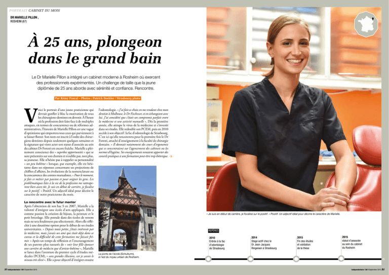 PORTRAIT CABINET DU MOIS CABINET DU MOIS PORTRAIT DR MARIELLE PILLON , ROSHEIM (67) À 25 ans, plongeon dans le grand bain Le Dr Marielle Pillon a intégré un cabinet moderne à Rosheim où exercent des professionnels expérimentés. Un challenge de taille que la jeune diplômée de 25 ans aborde avec sérénité et confiance. Rencontre. Par Rémy Pascal – Photos : Patrick Boehler / Strasbourg photo V oici le portrait d’une jeune praticienne qui devrait gonfler à bloc la motivation de tous les chirurgiens-dentistes en devenir. À l’heure où la profession doit faire face à de multiples attaques, en termes de concurrence ou de réformes administratives, l’histoire de Marielle Pillon est une vague d’optimisme qui emportera tous ceux qui parviennent à se laisser flotter. Son nom est inscrit à l’ordre des chirurgiens-dentistes depuis seulement quelques semaines et la signature qui vient acter son statut d’associée au sein du cabinet Dr Foresti est encore fraîche. Marielle a pleinement conscience des « superbes opportunités » qui se sont présentées sur son chemin et n’oublie pas, non plus, sa jeunesse. Elle n’hésite pas à rappeler sa personnalité « un peu bohème » lorsque, par exemple, elle est hésitante dans ses réponses concernant ses projections de chiffres d’affaires, les évolutions de la nomenclature ou la concurrence des centres mutualistes. « Pour le moment, je fais ce métier par passion et pour soigner les gens. Les problématiques liées à la vie de la profession me rattraperont bien assez tôt. Je suis en début de carrière, je focalise sur le positif. » Positif. Un adjectif idéal pour décrire le caractère de notre praticienne du mois. l’odontologie. « J’ai fait ce choix en me rendant chez mon dentiste à Mulhouse, le Dr Fischesser, et en échangeant avec lui. J’ai considéré que c’était un compromis parfait entre la médecine et une activité manuelle ». Dès la première année, elle attrape le virus de la médecine et s’investit dans ses études. Elle redouble son PCEM, puis en 2010 accède à son objectif : la fac d’odontologie de Strasbourg. C’est ici qu’elle rencontrera pour la première fois le Dr Foresti, attaché d’enseignement à la faculté de chirurgie dentaire. « Il donnait notamment des cours d’ergonomie qui se concentraient sur l’agencement des cabinets ou les normes d’hygiène. Ses enseignements venaient apporter des conseils pratiques à une formation peut-être trop théorique. La rencontre avec le futur mentor Après l’obtention de son bac S en 2007, Marielle a la volonté d’intégrer une école d’arts appliqués. Elle a comme passion la création de bijoux, la peinture et le petit bricolage. Elle postule dans des écoles de renom mais ne sera finalement pas sélectionnée. Alors elle réfléchit à une deuxième option pour le début de ses études universitaires. « Depuis toute petite, j’étais intéressée par la médecine, mais j’avais un ami qui était déjà dans ce cursus et la difficulté de cette formation me faisait frémir. » Après un temps de réflexion et l’encouragement de ses parents plus rassurés de « voir leur fille épouser une carrière de médecin que d’artiste-bohème », Marielle se lance dans l’aventure du premier cycle d’études médicales (PCEM), « sans grandes illusions, car je savais le niveau très élevé ». Elle a pour objectif d’intégrer ensuite 30 indépendentaire 130 l Septembre 2015 « Je suis en début de carrière, je focalise sur le positif. » Positif. Un adjectif idéal pour décrire le caractère de Marielle. REPÈRES 2010 Entrée à la fac d’odontologie de Strasbourg 2014 Stage actif chez le Dr Jean-Jacques Ringeisen à Strasbourg 2015 Fin des études et validation de la thèse 2015 statut d’associée au sein du cabinet du Rosheim La porte de l’école (Schulturm), à l’est du noyau urbain de Rosheim. indépendentaire 130 I Septembre 2015 31 PORTRAIT CABINET DU MOIS Toutes les assistantes sont polyvalentes, elles accompagnent le patient, de son arrivée à son départ. Son exercice libéral nous permettait d’entrevoir une certaine réalité du métier. » Notre praticienne est immédiatement séduite par le caractère très pédagogue de son futur mentor, son énergie et la passion qu’il investit dans son activité. Trois mois au Vietnam « Au plus on travaille, au plus on doit travailler pour couvrir ce que nous coûte notre croissance » Une anecdote vient pimenter sa rencontre avec les fantômes sur lesquels elle s’exerce les premières années. « Je suis gauchère, et tous les mannequins ne sont pas adaptés…, c’est à ce moment, que j’ai pris conscience de la spécificité d’être gauchère lorsque l’on se destine à devenir chirurgien-dentiste. » D’ailleurs, par chance, les salles de soins qu’elle occupe au sein du cabinet à Rosheim possèdent un fauteuil ambidextre et il suffit de déplacer le crachoir pour se positionner au mieux selon ses préférences. « Mais il ne faut pas oublier que cela impose à l’assistante de changer ses habitudes… car elles aussi sont habituées à une certaine gestuelle qu’elles doivent modifier lorsqu’elles travaillent avec moi ! » Les membres du cabinet Tous restent omnipraticiens mais se distinguent par leur orientation. Le Dr Valérie Wach-Wegbecher est spécialisée en endodontie tandis que le Dr Annie Nguyen se concentre sur la parodontologie. Le Dr Christophe Foresti est porté sur la chirurgie et le Dr Marielle Pillon attend quelques années pour choisir une orientation. 32 indépendentaire 130 l Septembre 2015 En quatrième année, en 2012, elle fait ses premiers pas en clinique. Elle découvre alors le contact avec les patients. « Disons-le clairement, on doute. Lorsque les interventions se passent bien, on gagne en confiance, en revanche dès lors qu’une difficulté apparaît, on peut très vite être rattrapé par notre manque de 