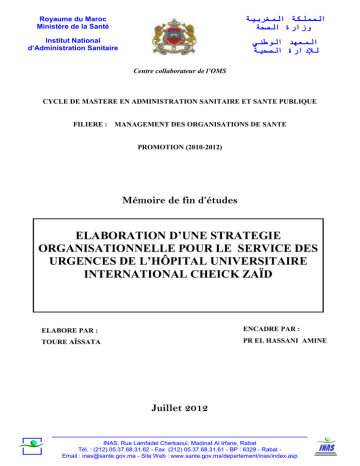 Royaume du Maroc Ministère de la Santé ﺍﻟﻤﻤﻠﻜﺔ ﺍﻟﻤﻐﺭﺒﻴﺔ ﻭﺯﺍﺭﺓ ﺍﻟﺼﺤﺔ Institut National d’Administration Sanitaire ﺍﻟﻤﻌﻬﺩ ﺍﻟﻭﻁﻨﻲ ﻟﻺﺩﺍﺭﺓ ﺍﻟﺼﺤﻴﺔ Centre collaborateur de l’OMS CYCLE DE MASTERE EN ADMINISTRATION SANITAIRE ET SANTE PUBLIQUE FILIERE : MANAGEMENT DES ORGANISATIONS DE SANTE PROMOTION (2010-2012) Mémoire de fin d’études ELABORATION D’UNE STRATEGIE ORGANISATIONNELLE POUR LE SERVICE DES URGENCES DE L’HÔPITAL UNIVERSITAIRE INTERNATIONAL CHEICK ZAÏD ELABORE PAR : ENCADRE PAR : TOURE AÏSSATA PR EL HASSANI AMINE Juillet 2012 INAS, Rue Lamfadel Cherkaoui, Madinat Al Irfane, Rabat Tél. : (212) 05.37.68.31.62 - Fax (212) 05.37.68.31.61 - BP : 6329 - Rabat Email : [email protected] - Site Web : www.sante.gov.ma/departement/inas/index.asp RESUME Introduction Nous avons mené une étude descriptive transversale au sein de l’Hôpital Universitaire International Cheikh Zaïd d’Octobre 2011 à Juin 2012. Elle avait pour objectif d’améliorer la qualité de l’organisation du travail à travers la capacité d’accueil et la prise en charge des patients au niveau du service des urgences. Méthode Cette étude avait pour population cible tous les professionnels exerçant au niveau du service des urgences de l’hôpital, les supérieurs hiérarchiques intervenant dans la prise de décisions et les locaux des services en question. Etaient concernés également les professionnels exerçant dans les services collaborateurs comme la radiologie, le laboratoire et la pharmacie. Elle a porté aussi sur les accompagnants des patients admis. Pour l’échantillonnage la méthode non probabiliste a été retenue avec la technique du choix raisonné pour les professionnels, les locaux et les décideurs et celle du choix accidentel pour les accompagnants. Pour réaliser l’étude trois outils de collecte de données ont été utilisés : • • • L’exploitation des documents des services de la Direction Administrative et Financière, de la Direction Chirurgicale et de la Direction Technique ; L’observation des locaux du service des urgences ainsi que ceux des services de l’admission/facturation, de la radiologie, du laboratoire et de la pharmacie; L’entretien individuel semi-directif avec les responsables de service, les médecins urgentistes, les infirmiers, les aides soignants et les accompagnants. Résultats Les résultats ont montré qu’une partie importante des fonds alloués à la direction chirurgicale étaient absorbée par le service des urgences. Le plateau technique est cité parmi l’un des meilleurs du pays. Pour les locaux il existe des insuffisances pour un service des urgences : un local de consultation unique constitué de quatre box individuel muni de moniteur et séparés par des rideaux pour les adultes, un petit bureau avec une tablette et une balance sert de lieu de consultation pédiatrique. La répartition du travail et l’organisation de l’accueil par le personnel ne répondent pas aux attentes des accompagnants des patients. Pour les services connexes comme la radiologie et le laboratoire des problèmes d’organisation et d’effectifs subsistent, la pharmacie en a moins. La facturation constitue un goulot de retard. Le constat est que le circuit du patient n’est pas facilité avec les dispositions actuelles. Pour les formalités d’admission il faut revenir vers le bureau de facturation admission commun à tout l’hôpital. La radiologie manque de personnel compétent pour une prise en charge rapide des cas chauds. Conclusion Ces résultats permettent de conclure que le système d’organisation actuelle du service des urgences de l’hôpital Cheikh Zaïd n’est pas approprié pour une bonne qualité de capacité d’accueil et de prise en charge des patients. Suite à ces constats, des mesures d’amélioration ont été proposées et avec l’ouverture de l’extension portant le nouveau service des urgences nous pensons que ces insuffisances seront prises en compte et corrigées dans le cadre de l’amélioration de la qualité de la prise en charge. Mots – clé : Amélioration – Organisation – Urgences - Hôpital Cheikh Zaïd 2 INTRODUCTION Il apparaît que le mot urgence n’a pas la même signification pour le public profane que pour le corps médical. Pour les médecins les urgences sont les pathologies qui mettent la vie ou une fonction importante des malades en danger et qui nécessitent des soins immédiats. Elle se définit également comme une obligation d’accueillir 24h/24h toutes personnes se présentant en situation d’urgence, y compris psychiatrique ; de procéder à leur examen clinique ; de les traiter et d’orienter celles qui nécessitent un niveau de recours, vers l’établissement de soins le plus adapté. Pour le public, l’urgence se présente comme une détresse qui requiert l’aide et l’assistance d’un tiers, voire une solution immédiate à une difficulté passagère. Toutes ces définitions montrent un caractère impératif spécifique aux urgences médicales qui a amené les systèmes de soins à s’organiser à travers la mise en place de ces services au niveau des hôpitaux pour s’occuper de cet aspect particulier de la médecine. Les services des urgences occupent une position très particulière dans l'hôpital ; ils constituent l’interface entre le réseau ambulatoire et le réseau hospitalier ; la fonction de « filtre » à l’entrée de l’hôpital leur confère une importance non négligeable dans le contrôle du flux des hospitalisations.il constituent aussi un service recruteur également pour les hôpitaux. Au Maroc, plus de 3 700 000 passages sont enregistrés au niveau des services des urgences, 25% des hospitalisations proviennent des services d’urgences. Elles constituent 11% de la charge de morbidité et 33% des interventions majeures se font en urgence (DHSA). En te