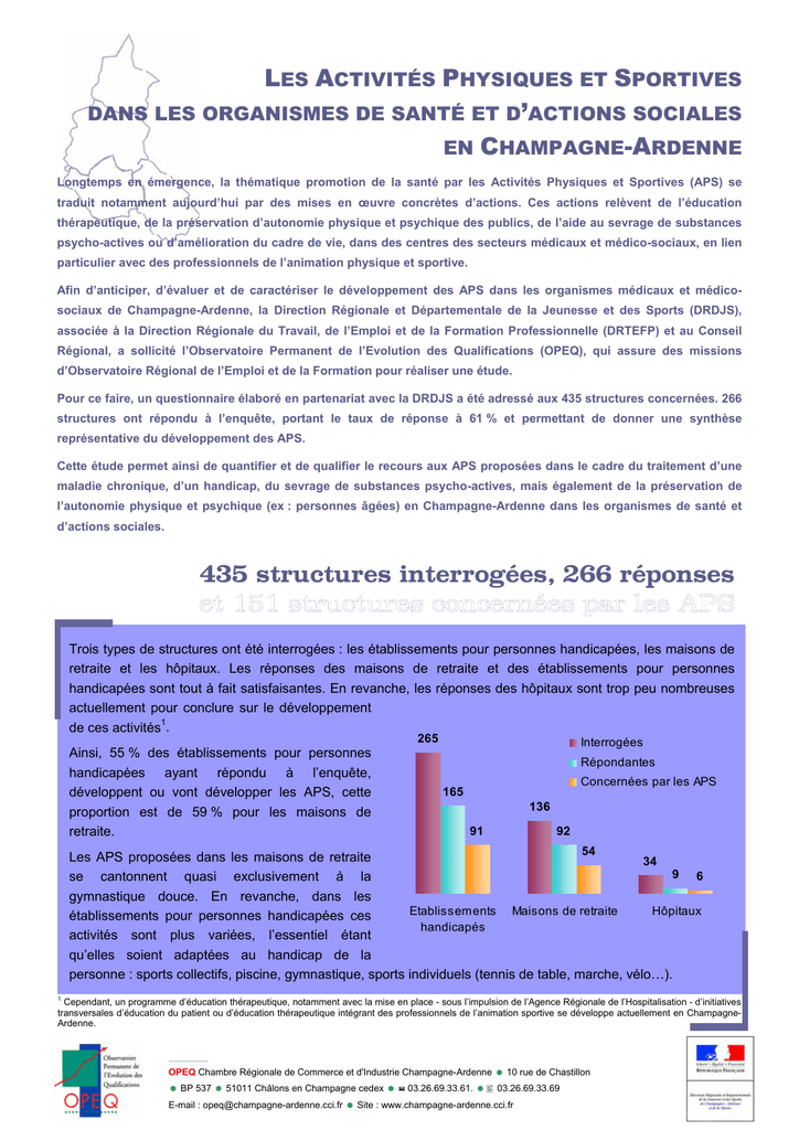 LES ACTIVITÉS PHYSIQUES ET SPORTIVES DANS LES ORGANISMES DE SANTÉ ET D’ACTIONS SOCIALES EN CHAMPAGNE-ARDENNE Longtemps en émergence, la thématique promotion de la santé par les Activités Physiques et Sportives (APS) se traduit notamment aujourd’hui par des mises en œuvre concrètes d’actions. Ces actions relèvent de l’éducation thérapeutique, de la préservation d’autonomie physique et psychique des publics, de l’aide au sevrage de substances psycho-actives ou d’amélioration du cadre de vie, dans des centres des secteurs médicaux et médico-sociaux, en lien particulier avec des professionnels de l’animation physique et sportive. Afin d’anticiper, d’évaluer et de caractériser le développement des APS dans les organismes médicaux et médicosociaux de Champagne-Ardenne, la Direction Régionale et Départementale de la Jeunesse et des Sports (DRDJS), associée à la Direction Régionale du Travail, de l’Emploi et de la Formation Professionnelle (DRTEFP) et au Conseil Régional, a sollicité l’Observatoire Permanent de l’Evolution des Qualifications (OPEQ), qui assure des missions d’Observatoire Régional de l’Emploi et de la Formation pour réaliser une étude. Pour ce faire, un questionnaire élaboré en partenariat avec la DRDJS a été adressé aux 435 structures concernées. 266 structures ont répondu à l’enquête, portant le taux de réponse à 61 % et permettant de donner une synthèse représentative du développement des APS. Cette étude permet ainsi de quantifier et de qualifier le recours aux APS proposées dans le cadre du traitement d’une maladie chronique, d’un handicap, du sevrage de substances psycho-actives, mais également de la préservation de l’autonomie physique et psychique (ex : personnes âgées) en Champagne-Ardenne dans les organismes de santé et d’actions sociales. 435 structures interrogées, 266 réponses Trois types de structures ont été interrogées : les établissements pour personnes handicapées, les maisons de retraite et les hôpitaux. Les réponses des maisons de retraite et des établissements pour personnes handicapées sont tout à fait satisfaisantes. En revanche, les réponses des hôpitaux sont trop peu nombreuses actuellement pour conclure sur le développement de ces activités1. 265 Ainsi, 55 % des établissements pour personnes handicapées ayant répondu à l’enquête, développent ou vont développer les APS, cette proportion est de 59 % pour les maisons de retraite. Interrogées Répondantes Concernées par les APS 165 136 91 92 54 Les APS proposées dans les maisons de retraite 34 9 6 se cantonnent quasi exclusivement à la gymnastique douce. En revanche, dans les Etablissements Maisons de retraite Hôpitaux établissements pour personnes handicapées ces handicapés activités sont plus variées, l’essentiel étant qu’elles soient adaptées au handicap de la personne : sports collectifs, piscine, gymnastique, sports individuels (tennis de table, marche, vélo…). 1 Cependant, un programme d’éducation thérapeutique, notamment avec la mise en place - sous l’impulsion de l’Agence Régionale de l’Hospitalisation - d’initiatives transversales d’éducation du patient ou d’éducation thérapeutique intégrant des professionnels de l’animation sportive se développe actuellement en ChampagneArdenne. OPEQ Chambre Régionale de Commerce et d'Industrie Champagne-Ardenne BP 537 51011 Châlons en Champagne cedex E-mail : [email protected] 03.26.69.33.61. 10 rue de Chastillon 03.26.69.33.69 Site : www.champagne-ardenne.cci.fr Les APS comme élément du Pour 86 % des structures, l’objectif des APS est de participer au bien-être physique et psychologique des patients. Les objectifs plus secondaires sont d’ordre social (notamment dans l’objectif de maintenir l’autonomie de la personne) ou d’éducation thérapeutique. D’autres activités s’inscrivent également dans un objectif de développement harmonieux de la personne ou encore de maintien ou de développement de ses capacités physiques. Les objectifs* principaux des APS 86% Bien être physique Ordre social 35% Education therapeutique 33% Autre 17% Source : enquête sur le développement des APS, OPEQ, 2005 *plusieurs réponses possibles Local où les APS sont pratiquées On relèvera que les objectifs d’ordre social sont un peu plus marqués dans les maisons de retraite, alors que les objectifs d’éducation thérapeutique semblent l’être davantage dans les hôpitaux. Salle multi-activités 36% Local spécifique 24% Salle extérieure 40% Dans 40 % des cas les APS se déroulent dans une salle extérieure à la structure (gymnase ou piscine municipale le plus souvent). Source : enquête sur le développement des APS, OPEQ, 2005 24 % des structures disposent d’une salle spécifique réservée à la pratique des APS. Dans 83 % des cas les structures sont satisfaites du local où ces APS sont pratiquées. Un processus de prescription des APS Il est en fait assez rare que les APS soient prescrites par un professionnel médical ou paramédical. C’est le cas dans seulement environ un tiers des structures. Dans la majorité des cas, c’est le salarié en charge de les animer qui les propose lui-même aux personnes, ou encore elles s’intègrent dans une offre globale de services inscrite dans le projet d’établissement. Le patient peut alors choisir ses activités en concertation avec l’équipe animant les APS. Le choix des APS et les relations entre les professionnels chargés de leur prescription et de leur animation se déroulent le plus souvent lors de bilan de suivis des activités ou encore à l’arrivée de nouveaux patients. Processus de prescription des APS 32% 36% 20% 12% Prescription Médecin prescrit Salarié prescrit d'autres lui-même professionnels Offre de services Source : enquête sur le développement des APS, OPEQ, 2005 300 salariés chargés des APS Environ 300 personnes son