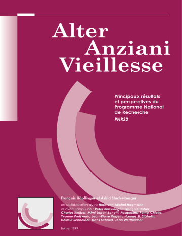 Alter Anziani Vieillesse Principaux résultats et perspectives du Programme National de Recherche PNR32 François Höpflinger et Astrid Stuckelberger en collaboration avec Hermann-Michel Hagmann et avec l’appui de : Peter Binswanger, François Huber, Charles Kleiber, Mimi Lepori Bonetti, Pasqualina Perrig-Chiello, Yvonne Preiswerk, Jean-Pierre Rageth, Hannes B. Stähelin, Helmut Schneider, Hans Schmid, Jean Wertheimer. Berne, 1999 Alter Anziani Vieillesse François Höpflinger et Astrid Stuckelberger En collaboration avec Hermann-Michel Hagmann, président du groupe d’experts du PNR 32 et avec l’appui des membres du groupe d’experts : Peter Binswanger, François Huber, Charles Kleiber, Mimi Lepori Bonetti, Pasqualina Perrig-Chiello, Yvonne Preiswerk, Jean-Pierre Rageth, Hannes B. Stähelin, Helmut Schneider, Hans Schmid, Jean Wertheimer. Langue du texte original : allemand Traductions : version française : A. Stuckelberger version italienne : G. Bernasconi-Romano version anglaise : J. Haller Pratt Avant-propos Quand, au début des années 90, le Conseil fédéral décidait de mandater le Fonds national pour l’élaboration d’un Programme national de recherche (PNR 32) sur le thème de la vieillesse, l’on pouvait affirmer que la place de la recherche gérontologique dans notre pays était alors plutôt marginale. Aujourd’hui, la situation s’est, d’une façon heureuse, profondément modifiée. Grâce à l’activité de qualité d’une trentaine d’équipes scientifiques, soutenues par une direction de programme de haut niveau et accompagnées par un groupe d’experts très impliqué, la recherche sur le vieillissement et les vieillesses en Suisse a pris un essor décisif. La présente synthèse, rédigée par le Prof. François Höpflinger, directeur de programme, avec Mme A. Stuckelberger, adjointe, et le groupe d’experts, nous en fournit une belle illustration. La diversité des thèmes abordés et la richesse des données obtenues sont à la mesure des enjeux de société induits par les grandes évolutions socio-démographiques. Que l’ensemble des chercheur(e)s, la direction de programme et le groupe d’experts en soient ici chaleureusement remerciés. Mais les défis liés au vieillissement démographique et à l’allongement considérable de la durée de vie humaine sont tels qu’ils appellent la continuité, la valorisation et l’approfondissement des recherches entreprises. C’est dans cet esprit que les principaux acteurs du PNR 32 ont décidé, avec l’appui du Fonds national, la création d’un Institut universitaire Ages et Générations (INAG) dont les objectifs sont : - de promouvoir la discussion et la diffusion de travaux interdisciplinaires dans les domaines concernés par les âges de la vie et les relations intergénérationnelles, - de développer l’enseignement et la recherche en gérontologie dans une perspective qui prend en compte l’ensemble du territoire et des cultures de la Suisse, - d’encourager la coordination entre la recherche fondamentale, la recherche appliquée et les champs de la pratique. Au travers d’un réseau flexible de coopérations et de mise en commun des compétences, nous souhaitons une longue vie à cette nouvelle aventure scientifique, à la fois complexe et passionnante. Prof. Hermann-Michel Hagmann Président du Groupe d’experts 3 Table des matières Avant-propos . . . . . . . . . . . . . . . . . . . . . . . .3 Introduction: Les principes de base de la recherche moderne en gérontologie . . . . . . . . . . . . . . . . . . . . .6 A - Situation et activités des personnes âgées dans la société . . . . . . . . . . . . . . .8 1. Représentations de la vieillesse 2. Participation sociale et activités bénévoles pendant la vieillesse 3. Groupes et associations de personnes âgées: les retraités en action! 4. Recherches avec et pour les personnes âgées 5. Principaux résultats et perspectives B - Retraite et passage à la vie post-professionnelle . . . . . . . . . . . . . . . .16 1. Développement sur le marché du travail 2. Politique en faveur des seniors dans les entreprises suisses E - Etat de santé . . . . . . . . . . . . . . . . . . . . . .49 1. Vieillissement démographique et coûts de la santé 2. Etat de santé des âgés et très âgés 3. Problèmes auditifs et restriction de la communication 4. Style de vie et comportements de santé 5. Troubles de santé et besoins non satisfaits 6. Perte des fonctions: le cas de la fracture du col du fémur 7. Principaux résultats et perspectives F - Prise en charge et interventions innovatrices pour personnes âgées . . . . . . . . . . . . . . . . . . . . . . . . . . . . .62 1. Soins apportés par la famille aux malades atteints de démence 2. Soins ambulatoires et nouvelles formes de prise en charge 3. Systèmes d’aides électroniques à disposition des personnes âgées 3. Passage à la retraite 4. Psychothérapie cognitive chez les personnes âgées dépressives 4. Immigration et passage à la vie post-professionnelle 5. Visites gériatriques préventives à domicile 5. Principaux résultats et perspectives 6. Principaux résultats et perspectives C - Condition sociale et économique des personnes vieillissantes . . . . . . . . .24 1. Prévoyance sociale et transitions démographiques récentes 2. Situation économique de la population à la retraite 3. Réseaux et relations sociales 4. Habitat et vieillissement 5. Les âgés dans les institutions d’hébergement 6. Principaux résultats et perspectives D - Personnalité, bien-être et ressources . . . . . . . . . . . . . . . . . . . . . . . . .39 1. Bien-être durant la vieillesse 2. Activités physiques, sport et bien-être 3. Capacité de la mémoire et entraînement de la mémoire 4. Dépression et symptômes dépressifs 5. Démence et altérations cognitives 6. Principaux résultats et perspectives Demain... Regard sur la continuité de la formation et la recherche gérontologique.