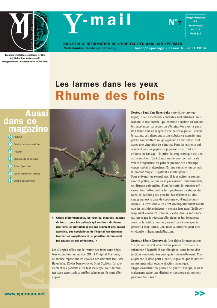 Y -mail België/Belgique N°7 P.B. Antwerpen-X 8/1015 P106214 BULLETIN D’INFORMATION DE L’HÔPITAL RÉGIONAL JAN YPERMAN Nederlandse versie op aanvraag Ieper/Poperinge - année 5 - août 2004 Toelating gesloten verpakking 8/161 Afgiftekantoor Antwerpen-X Terugzendadres: Kuiperskaai 6, 9000 Gent Les larmes dans les yeux Rhume des foins Aussi dans ce magazine 2 Parking 3 Centre de locomotricité 4 Travaux 5 Clinique de la douleur 6 Jehan Yperman 7 Laser contre les varices 8 Centre du sommeil > Crises d’éternuements, les yeux qui pleurent, quintes de toux… pour les patients qui souffrent du rhume des foins, le printemps n’est pas vraiment une saison agréable. Les spécialistes de l’hôpital Jan Yperman Docteur Paul Van Haverbeke (oto-rhino-laryngologue): "Deux méthodes courantes sont utilisées. Tout d’abord le test cutané, qui consiste à mettre en contact les substances suspectes ou allergisantes avec la peau de l’avant-bras au moyen d’une petite aiguille. Lorsque le patient est allergique à une substance donnée, une petite boursouflure rouge apparaît à l’endroit du test après une vingtaine de minutes. Pour les patients qui n’aiment pas les piqûres – je pense ici surtout aux enfants en bas âge – la prise de sang classique est une autre solution. Un échantillon de sang permettra de voir si l’organisme du patient produit des anticorps contre certains allergènes. En une semaine, on connaît le produit auquel le patient est allergique." Pour prévenir les symptômes, il faut éviter le contact avec le pollen, ce qui n’est pas évident. Heureusement, on dispose aujourd’hui d'une batterie de remèdes efficaces. Pour lutter contre les symptômes du rhume des foins, le patient peut prendre des tablettes ou des sprays nasaux à base de cortisone ou d’antihistaminiques. La cortisone a un effet décongestionnant tandis que les antihistaminiques – comme leur nom l’indique – réagissent contre l’histamine, c’est-à-dire la substance qui provoque la réaction allergique et les démangeaisons. Si la médication ne parvient pas à soulager le patient à long terme, une autre alternative peut être envisagée : l’hyposensibilisation. traitent les symptômes et, si possible, déterminent les causes de ces affections. < J YY www.yperman.net Les allergies telles que le rhume des foins sont dépistées et traitées au service ORL. À l’hôpital Yperman, ce service repose sur les épaules des docteurs Paul Van Haverbeke, Edwin Demuynck et Griet Stoffels. Ils soumettent les patients à un test d’allergie pour déterminer avec exactitude à quelles substances ils sont allergiques. Docteur Edwin Demuynck (oto-rhino-laryngologue): "Le patient se voit administrer pendant trois ans la substance à laquelle il est allergique, sous forme d’injections sous-cutanées pratiquées mensuellement. L’on augmente la dose petit à petit jusqu’à ce que le patient ne présente plus aucune réaction allergique. L’hyposensibilisation permet de guérir l’allergie, mais le traitement exige une discipline rigoureuse du patient pendant trois ans." >> 2 Les infirmiers en chef prennent les choses en main Maria Deweirdt (responsable du projet) Nouveaux chefs de service Rafaël Joseph, pharmacien biologiste de formation, a dirigé pendant des années le laboratoire du Mariaziekenhuis de Poperinge. Voici trois ans, il a rejoint le laboratoire fusionné de l'hôpital Jan Yperman où il exerce les fonctions de chef de service depuis juillet 2003. Son souci prioritaire : la qualité. > L’hôpital Jan Yperman participe à un projet pilote en matière de ‘clinical leadership’. Dix infirmiers en chef apprennent tout ce qu’il faut savoir sur les qualités de dirigeant que l’on attend d’eux aujourd’hui. < L’hôpital Jan Yperman participe, depuis le mois dernier, à un projet pilote de ‘clinical leadership’, dans lequel Maria Deweirdt s’est investie avec tout l’enthousiasme qu’on lui connaît. Maria Deweirdt: "L’expression ‘clinical leadership’ vient de Grande-Bretagne. Elle désigne les qualités de dirigeant que doit posséder aujourd’hui l’infirmier en chef qui est devenu le personnage clé du secteur des soins de santé en pleine et rapide mutation. Il doit acquérir, pour pleinement remplir son rôle, des aptitudes telles que le coaching et la formation de groupes. La gestion des conflits et la résolution des problèmes font également partie des tâches qui lui incombent. En définiti- ve, le grand bénéficiaire du clinical leadership, c’est le patient." En 2003, la KU Leuven a organisé une journée d’étude sur ce thème. Tous les hôpitaux belges ont eu la possibilité de poser leur candidature pour participer à un projet pilote pendant un an. Quelque 24 hôpitaux ont été finalement sélectionnés, parmi lesquels l’hôpital Jan Yperman. Maria Deweirdt: "Ce projet consiste à encadrer dix infirmiers en chef afin de leur permettre d’acquérir les aptitudes du ‘clinical leadership’. Outre les tâches normales qui leur incombent à l’hôpital, les participants assistent à des ateliers et à des cours afin d’assimiler les méthodes et techniques nécessaires. Ils doivent aussi beaucoup étudier et accomplir une série de travaux pratiques, ce qui leur permettra d'avoir une meilleure perception de la dispensation des soins et du vécu des patients." Le projet pilote prendra fin en février 2005 et fera ensuite l’objet d’une évaluation. Parking payant > L’offre de soins sur le campus Onze-Lieve-Vrouw est en pleine expansion. L'on s'est bien vite rendu compte que l'offre de parking devait suivre cette évolution, car les places libres aux heures de pointe, pour les visiteurs comme pour les membres du personnel, se faisaient rares. < J YY Le docteur Els Sercu a effectué des stages dans différents hôpitaux de la Flandre Occidentale et même dans un hôpital zaïrois, avant de commencer comme pédiatre à Ypres