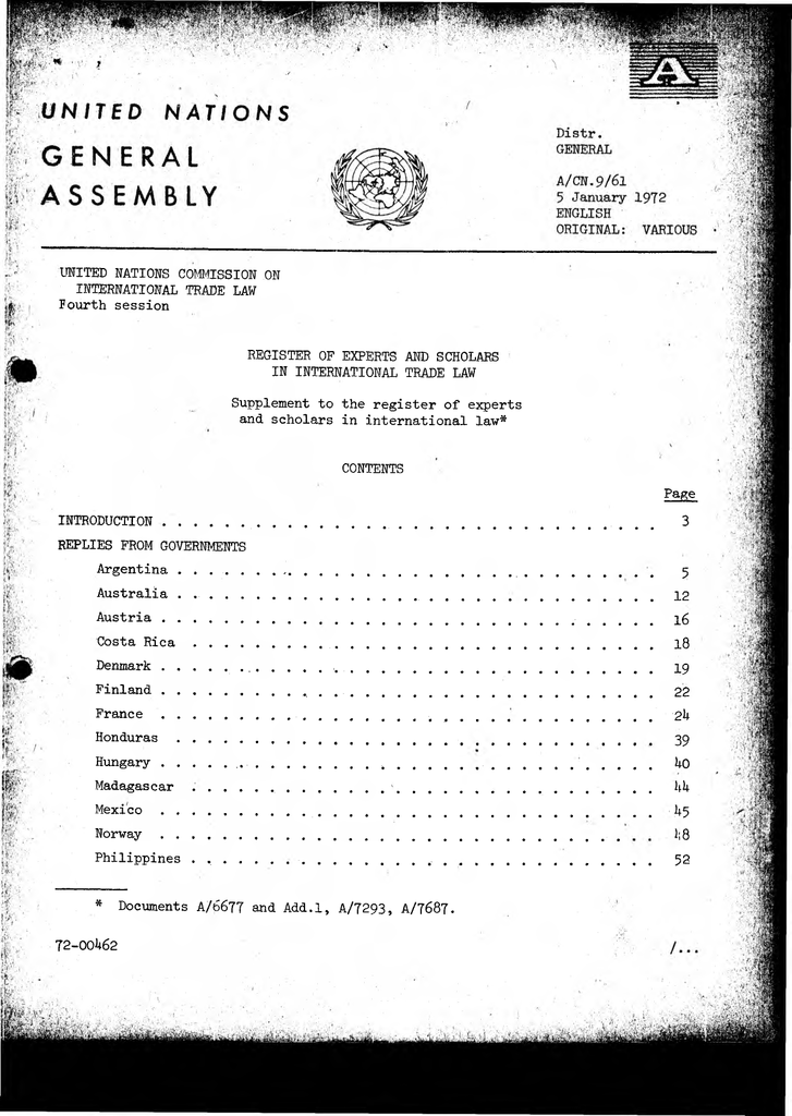 UNITED NATIONS COMMISSION ON INTERNATIONAL TRADE LAW Fourth session REGISTER OF EXPERTS AND SCHOLARS IN INTERNATIONAL TRADE LAW Supplement to the register of experts *and scholars in international law CONTENTS Page INTRODUCTION . .................... REPLIES FROM GOVERNMENTS Argentina . . . .............. Australia . . .................... A u s t r i a ..................................................... .......... 16 Costa R i c a ................. 18 Denmark ........ F i n l a n d .............. F r a n c e ................. ............... ........... ................ 2U, H o n d u r a s ........ , H u n g a r y ...................................... Madagascar ................. '........ M e x i c o ................... .......................................... k5 N o r w a y .............. Philippines .......... * 72 -00*،62 .. Documents A/6677 and Add.l, A/7293, A/7687 . ■.*-٣٠.™^*..,-.,١.؛,..٠ •٢ A/CN.9/61 ') •١ ٠ English CONTENTS (continued) Page ■ P o l a n d ...................... ..................................... ... 53 Portugal.............. ..................... ..................... ' 60 Sweden ........................ ..................... ............. ... 6l Thailand.............. ........................... ............... ... 65 T u r k e y .................................. ........................ ... 66 Uganda .......................... ............................... — Union of Soviet Socialist Republics 72 . , ........................ ..... 73 United Kingdom of Great Britain and Northern Ireland ..................79 Venezuela . ........................ ............................. ... 85 Yugoslavia . . . . ........... ..................................... ... 89 ; A/CN.9/6X English INTRODUCTION 1. In ١an effort to help meet the need for developing local expertise in international trade law, particularly in the developing countries, the United Nations Commission on International Trade Law (UNCITRAL), at its second session held at Geneva in March 1969, decided, among other things, to request the Secretary-General: "to take the necessary steps to add the names and relevant particulars of experts in international trade law for inclusion in a supplement to the Register of Experts and Scholars in International Law as described in paragraph 36 (ii) (a) of the report of the Secretary-General" (A/CN.9/27)• 1/ 2. Pursuant to this decision, the Secretary-General, by a note verbale dated 25 February 1970 ؛requested Governments to submit the names, with particulars, of their nationals deemed to be qualified, by their experience and distinction in the various fields of international trade law, to be placed in the supplement to the register mentioned above.. The Secretary-General explained that account should be taken of the fact that experts whose names were submitted should have expressed willingness to make themselves available for service in developing countries, so that the supplement could be a useful source for selection of experts required by those countries. 3. In response to the Secretary-General's note, 23 Governments have submitted the names and relevant particulars of the experts and scholars included in this supplement. The information is given in the original language except for Russian material, and it has been edited and arranged as far as possible under the following headings: name, present position, educational and professional qualifications, professional experience, fields of special interest, languages and major publications. (With respect to publications, limitations of space have restricted listings to the titles of books.) U. The register will be subject to revision from time to time. 1/ Report of the United Nations Commission on International Trade Law (UNCITRAL) on the work of its second session (1969K Official Records of the General Assembly, Twenty-fourth Session, Supplement No. 18 (A/7618 ), para. l60 (c). REPLIES PROM GOVERNMENTS ARGENTINA Nombre y apellida ALEGRIA, Héctor. Cargos actuales Profesor de Derecho Comercial y Privado de la Universidad Nacional de Buenos Aires ؛Presidente de la Comisión Nacional de Valores. Títulos académicos y profesionales Doctor en Derecho. Experiencia profesional Enseñanza del Derecho Comercial desde 196؛+ en la Universidad Nacional de Buenos Aires, la Universidad del Salvador, la Universidad Argentina de la Empresa, la Universidad Católica de Mar del Plata y la Universidad Católica Santa María de los Buenos Aires ؛Secretario del Juzgado Nacional de Primera Instancia en lo Comercial (1958-1963) ؛Juez Nacional de Primera Instancia en lo Comercial (1963-1969.)• Ha asistido a varios seminarios y conferencias nacionales y regionales sobre diversos aspectos del dereqho comercial. Miembro de varias comisiones gubernamentales para la reforma de las leyes comerciales. Miembro de varias asociaciones de derecho comercial. Arbitro de la Comisión Interamericana de Arbitraje Comercial. Esferas de espec iali zac ión Papeles de comercio, Derecho Mercantil y arbitraje comercial' internacional. Publicaciones principales Sociedades Anónimas, 3a. impresión (1962 ). Varios artículos sobre diversos aspectos del derecho comercial. ****** Nombre y apellido Cargos actuales CAMARA, Héctor Rafael. • Profesor de Derecho Comercial de la Facultad de Derecho \ j Ciencias Sociales de la Universidad Nacional de Córdoba; Director de la Sección de Derecho Comercial del Instituto de Derecho Comercial y de la Navegación de la Facultad de Derecho y Ciencias Sociales de la Universidad Nacional de Córdoba. Títulos académicos y profesionales ١ Abogado )193؛0 ؛Doctor en Derecho y Ciencias Sociales (l9؛+2 ( por la Universidad Nacional de Córdoba. < A/CN.9/61 ARGENTINA (continuación) Experiencia profesional Enseñanza de diversos aspectos del derecho comercial, incluidos los instrumentos negociables, el derecho mercantil y los seguros desde 1 3 او. Miembro de la Academia de Derecho de Córdob
