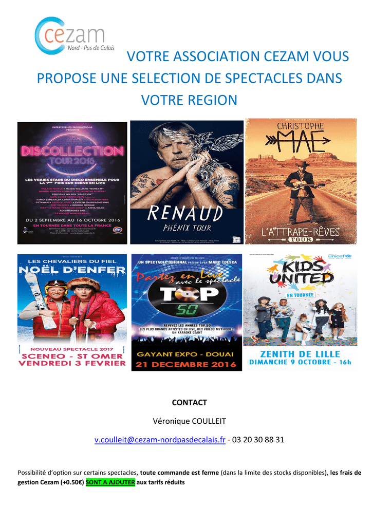 VOTRE ASSOCIATION CEZAM VOUS PROPOSE UNE SELECTION DE SPECTACLES DANS VOTRE REGION CONTACT Véronique COULLEIT [email protected] - 03 20 30 88 31 Possibilité d’option sur certains spectacles, toute commande est ferme (dans la limite des stocks disponibles), les frais de gestion Cezam (+0.50€) SONT A AJOUTER aux tarifs réduits SEPTEMBRE-16 RESISTE ZENITH 23/09/2016 LILLE 20H00 PAS DE TARIF CE CARRE OR :79€ CAT 1 : 69 € Assis – Num CAT 2 : 49 € 24/09/2016 CAT 3 : 35 € 15H00 & 20H00 $ DISCOLLECTION TOUR 2016 ZENITH 25/09/2016 LILLE 17H00 PRESTIGE : 74€ CARRE OR : 65€ CAT 1 : 55 € "LE DISCO FAIT SON SHOW" CARRE OR : 60€ CAT 1 : 50 € Assis – Num CAT 2 : 39 € $ BERNARD LAVILLIERS "POUVOIRS" THEATRE 30/09/2016 CAT 1 : 54 € SEBASTOPOL 20H30 CAT 2 : 47 € PAS DE TARIF CE Assis- Num OCTOBRE-16 NOUVEAU REPRESAILLES LE ZEPHYR 02/10/2016 HEM 18H00 COMPLET SCENEO 05/10/2016 RENAUD LONGUENESSE 20H00 UNIQUE : 49 € CAT 1 : 49 € PAS DE TARIF CE Assis - Num PAS DE TARIF CE Assis – Num CAT 2 : 43 € Assis – Num DEBOUT : 39 € STEEL PANTHER SPLENDID LILLE 08/10/2016 20H00 UNIQUE : 35,60 € Debout PAS DE TARIF CE Debout KIDS UNITED ZENITH 09/10/2016 LILLE 16H00 CARRE OR : 59 € CAT 1 : 46 € PAS DE TARIF CE Assis – Num CAT 1 : 47 € Assis – Num CAT 2 : 39 € IBRAHIM MAALOUF ZENITH 11/10/2016 LILLE 20H00 CARRE OR :59€ CAT 1 : 49 € Assis – Num CAT 2 : 39 € Assis – Num DEBOUT : 29 € THEATRE 15/10/2016 SEBASTOPOL 20H00 COMPLET ZENITH 17/10/2016 LES INSUS LILLE 20H00 ABD AL MALIK Debout UNIQUE : 37 € UNIQUE : 34 € Assis - Libre CARRE OR : 88,40 € CAT 1 : 71,90 € PAS DE TARIF CE Assis – Num CAT 2 : 55,40 € Assis – Num DEBOUT: 38,90 € Assis – Num Debout NOUVEAU CASINO 20/10/2016 VERONIC DICAIRE ARRAS 20H00 CARRE OR : 62 € CAT 1 : 56 € PAS DE TARIF CE Assis – Num CAT 2 : 49 € MESSMER THEATRE 20/10/2016 SEBASTOPOL 21/10/2016 20H00 CARRE OR :59,50€ CAT 1 : 49,50 € CAT 1 : 46,50 € Assis – Num CAT 2 : 44,50 € DANY BOON ZENITH 21/10/2016 LILLE 22/10/2016 20H00 CAT 1 : 58 € CAT 2 : 49 € 23/10/2016 17H30 encore de la dispo uniquement le 22/10 en cat 1 CAT 1 : 55,00 € Assis – Num TROTRO fait son cirque THEATRE 23/10/2016 CAT 1 Adulte : 33 € SEBASTOPOL 14H30 CAT 1 Enfant : 27 € 17H00 Pack Famille : 25 € PAS DE TARIF CE Assis - Num PAS DE TARIF CE Assis – Num CAT 1 : 41 € Assis – Num PAS DE TARIF CE Assis – Num (4 places à 25 euros soit 100 euros) CAT 2 Adulte : 28 € CAT 2 Enfant : 22 € ZENITH GAD & KEV LILLE 28 & 29 & 30 /10/16 CAT 1 : 65 € 20H00 CAT 2 : 57 € encore de la dispo CAT 3 : 46,50 € uniquement le 29/10 en cat 1 FRANK MICHAEL THEATRE 29/10/2016 CAT 1 : 45 € SEBASTOPOL 20H00 CAT 2 : 41 € CAT 3 : 33 € NOVEMBRE-16 RENAUD ZENITH 02/11/2016 CAT 1 : 49 € LILLE Dernières places en Debout CAT 2 : 43 € Assis – Num DEBOUT : 39 € Debout COMPLET 03/11/2016 20H00 COMPLET LE KURSAAL 04/11/2016 CAT 1 : 49 € RENAUD DUNKERQUE 20H00 CAT 2 : 43 € PAS DE TARIF CE Assis – Num DEBOUT : 39 € NOUVEAU ANTHONY KAVANAGH $ LAURENT GERRA $ LAURENT GERRA DELAIN + EVERGREY + KOBRA AND THE LOTUS THEATRE 04/11/2016 SEBASTOPOL 20H00 ZENITH AMIENS 04/11/2016 20H00 CAT 1 : 65 € ZENITH UNIQUE : 39 € Assis – Num Debout UNIQUE : 35 € Assis - Libre CAT 1 : 62 € Assis – Num CAT 2 : 59 € CAT 2 : 56 € Assis – Num 05/11/2016 CAT 1 : 65 € CAT 1 : 62 € Assis – Num LILLE 20H00 CAT 2 : 59 € CAT 2 : 56 € Assis – Num SPLENDID 05/11/2016 UNIQUE : 28 € UNIQUE : 25 € LILLE 20H00 Debout GOSPEL CHURCH GOSPEL CHURCH CATHEDRALE NOTRE DAME DE LA TREILLE 05/11/2016 EGLISE ST NICOLAS EN CITE ARRAS 06/11/2016 20H30 16H00 ZENITH ADULTES : 20€ ADULTES : 18€ Enfants 6-16 ans: 10€ Gratuit – 6 ans Enfants 6-16 ans: 8€ ADULTES : 20€ ADULTES : 18€ Enfants 6-16 ans: 10€ Gratuit – 6 ans Enfants 6-16 ans: 8€ CARRE OR :59€ PAS DE TARIF CE 06/11/2016 $ KIDS UNITED AMIENS 15H00 Placement libre Placement libre Assis – Num CAT 1 : 46 € CAT 2 : 39 € UNIQUE : 24,80 € PAS DE TARIF CE Assis - Libre 09/11/2016 CAT 1 : 46 € CAT 1 : 43 € Assis – Num SEBASTOPOL 20H00 CAT 2 : 43 € COMPLET GAYANT EXPO 10/11/2016 CAT 1 : 49 € PAS DE TARIF CE Assis – Num RENAUD DOUAI 20H00 CAT 2 : 43 € NOUVEAU LE SPLENDID 08/11/2016 BLANCHE GARDIN LILLE 20H00 THEATRE ` ARNO Assis – Num DEBOUT : 39 € Debout UNIQUE : 16 € PAS DE TARIF CE 16/11/2016 20H00 CAT 1 : 44 € CAT 1 : 41 € THEATRE SEBASTOPOL 17/11/2016 20H00 UNIQUE : 36 € UNIQUE : 33 € Assis – Libre VAMP IN THE KITCHEN THEATRE SEBASTOPOL 18/11/2016 20H00 UNIQUE : 36 € UNIQUE : 33 € Assis – Num $ AGE TENDRE ZENITH 18/11/2016 CARRE OR :59€ CARRE OR :54€ Assis – Num "NOUVELLE TOURNEE" AMIENS 15H00 & 20H00 CAT 1 : 49 € CAT 1 : 44 € NOUVEAU LE ZEPHYR 10/11/2016 ORCHESTRE NATIONAL DE LILLE HEM 20H00 LETZ ZEP THEATRE SEBASTOPOL LA TROUPE DU JAMEL COMEDY CLUB Assis - Num Assis – Num CAT 2 : 41 € CAT 2 : 39 € $ AGE TENDRE ZENITH 19/11/2016 "NOUVELLE TOURNEE" LILLE 15H00 & 20H00 CARRE OR :59€ CAT 1 : 49 € CAT 2 : 39 € CARRE OR :54€ CAT 1 : 44 € Assis – Num LE LAC DES CYGNES SUR GLACE LE COLISEE 19/11/2016 ROUBAIX 21h00 CARRE OR :53€ CAT 1 : 47 € CAT 1 : 44 € CAT 2 : 39 € Assis – Num CAT 2 : 42 € 20/11/2016 CAT 3 : 34 € 14h00 $ MICHEL POLNAREFF ROBERT CHARLEBOIS ZENITH 20/11/2016 CAT 1 : 95 € CAT 1 : 90 € Assis – Num LILLE 18H00 CAT 2 : 75 € CAT 2 : 70 € Assis – Num Fosse debout: 52€ Fosse debout: 47€ debout libre CARRE OR :50 € CAT 1 : 42 € Assis – Num CAT 1 : 51 € Assis – Num PAS DE TARIF CE Assis – Num PAS DE TARIF CE Assis – Num THEATRE 22/11/2016 SEBASTOPOL 20H00 CAT 1 : 45 € CAT 2 : 40 € CAT 3 : 35 € THE MUSICAL BOX THEATRE 23/11/2016 SEBASTOPOL 20H00 CARRE OR :64 € CAT 1 : 54 € CAT 2 : 49 € CAT 3 : 44 € $ LES BODIN'S "GRANDEUR NATURE" ZENITH 23/11/2016 CAT 1 : 47,50 € AMIENS 20H00 CAT 2 : 42,50 € 24/11/2016 Enfant - 12 ans : 33,