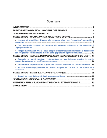 Sommaire INTRODUCTION ........................................................................................................ 2 FRENCH DECONNECTION : AU CŒUR DES TRAFICS ......................................... 4 LA MONDIALISATION CRIMINELLE ........................................................................ 6 TABLE RONDE : MIGRATIONS ET ADDICTIONS EN 2016..................................... 8 Usages et modalités d’usage de drogues chez les “nouvelles” populations migrantes ......................................................................................................................... 8 De l’usage de drogues en contexte de violence collective et de migration à l’époque moderne...........................................................................................................10 Projets LAMBDA et DASS : deux projets d’accompagnement mobile à destination des “migrants” (demandeurs d’asile, sans-papiers) usagers de drogues .................12 TABLE RONDE : ACCUEIL DES POPULATION ISSUES D’EUROPE DE L’EST .. 14 Précarité et santé mentale : intervention du psychologue auprès du public migratoire polonais en souffrance psychique ..............................................................14 Intervention psychosociale auprès des usagers migrants de l’est de l’Europe ...19 10 ans d’accompagnement du public bulgare en CSAPA et en CAARUD à Bordeaux .........................................................................................................................22 TABLE RONDE : ENTRE LA FRANCE ET L’AFRIQUE.......................................... 25 Travail de rue à Dakar, Sénégal (programme Esther) .............................................27 LE CANNABIS : DU RIF À LA CANEBIÈRE ........................................................... 30 NOUVEAUX PUBLICS, NOUVEAUX BESOINS : ET MAINTENANT ? .................. 33 CONCLUSION ......................................................................................................... 39 Addictions ici & ailleurs, Migrations, addictions et accessibilité aux soins – les 07 et 08 juin 2016 INTRODUCTION Anne Borgne, présidente du RESPADD Anne Borgne accueille l’ensemble des participants aux 21es rencontres professionnelles du RESPADD. Elle se propose, en introduction, de rappeler l’histoire du RESPADD. Le Réseau Hôpital sans tabac (une association loi de 1901) a été fondé en 1996 par l’APHP et la MNH. Son objectif était de diffuser dans l’ensemble des établissements de santé des stratégies d’aide à l’arrêt du tabac. En 2007, fort de son expérience sur la problématique du tabac, le réseau a englobé toutes les pratiques addictives et est devenu le RESPADD. Béatrice Stambul, présidente du Bus 31/32 Béatrice Stambul a intitulé sont intervention : « bienvenue à Marseille, son Vieux-Port, sa bouillabaisse ». Si ce colloque c’était tenu à Strasbourg, elle aurait intitulé sin intervention : « bienvenue à Strasbourg, sa cathédrale, sa choucroute, sa salle de consommation ». Mais Marseille n’a pas de salle de consommation… Si Marseille n’a pas de salle de consommation, elle a un port. La ville est cosmopolite. Son urbanisme rend perplexe. Des tours s’érigent au milieu d’un vieux tissu de petits villages. Marseille a surtout une image négative qui lui colle à la peau. Malgré le fait que la ville a été sacrée capitale de la culture en 2013, malgré le MuCem, elle n’a pas réussi à effacer cette image qui reste encore très attachée aux règlements de compte. Bien évidemment, ceux-ci sont liés au trafic de drogue. Chaque événement fait la une du journal télévisé. Comme s’ils n’avaient lieu qu’à Marseille… Comme s’ils avaient une autre qualité que ceux de Grenoble ou Lyon. Concernant la question de la consommation de drogues, celle-ci semble majorée à Marseille par un ensemble de facteurs. Le port, pour commencer, est un haut lieu d’échange et de trafic. La ville est, par ailleurs, pauvre. La consommation de drogues est fortement corrélée à la pauvreté et la précarité. Le brassage des populations constitue un autre facteur. L’histoire de Marseille est liée à l’héroïne. Qui n’a jamais entendu parler de la « French Connection », des filières corses ou siciliennes, de l’assassinat du Juge Michel ? Après avoir tenté de se débarrasser de cette image, la ville tente aujourd’hui de se la réapproprier et de la comprendre. Si la consommation d’héroïne a fortement baissé (elle est aujourd’hui inférieure à la moyenne nationale), on assiste à une explosion de la consommation de cocaïne. Marseille est également devenue la ville des médicaments : d’abord l’Artane®, aujourd’hui, la Ritaline® (la cocaïne du pauvre). La prévalence de la consommation est supérieure à la moyenne nationale, notamment celle de l’injection. L’âge de la primoconsommation a diminué. La ville de Marseille a payé un lourd tribut au sida qui a emporté un grand nombre de jeunes, notamment les deuxièmes générations issues de l’immigration. Béatrice Stambul rend hommage à Mohamed , décédé le 20 mai et 2000, et Mansour, décédé le 19 janvier 2005, deux acteurs incontournables de l’activité du Bus Echange de seringues de Médecins du Monde. Aujourd’hui, c’est l’épidémie de l’hépatite C qui mobilise toutes les forces afin d’éviter de connaître une nouvelle tragédie comme celle du VIH. Marseille bénéficie d’un tissu institutionnel et associatif de professionnels de l’addictologie et de la réduction des risques. Quoique nourri, ce tissu est disparate. Il n’a pas une bonne couverture territoriale et se concentre essentiellement dans le centre-ville, à l’écart des 2/40 Addictions ici & ailleurs, Migrations, addictions et accessibilité aux soins – les 07 et 08 juin 2016 grandes zones de consommation. Force est de constater, par ailleurs, que de nombr