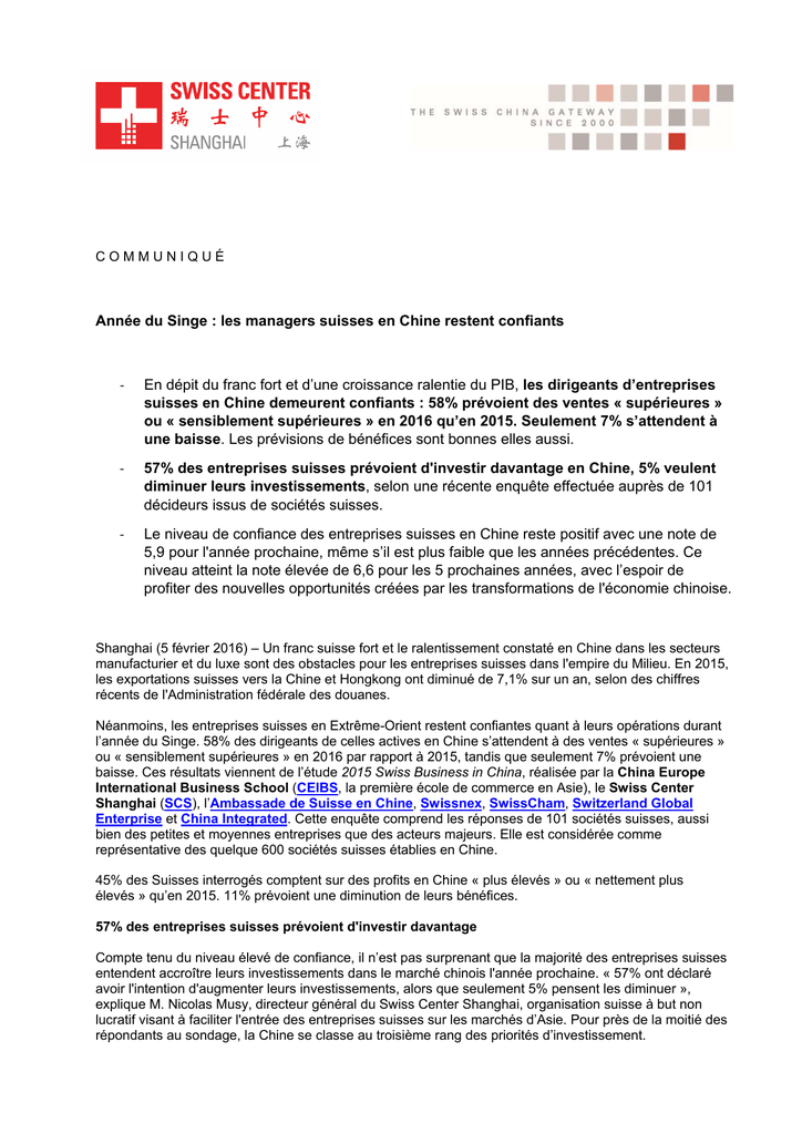 COMMUNIQUÉ Année du Singe : les managers suisses en Chine restent confiants ‐ En dépit du franc fort et d’une croissance ralentie du PIB, les dirigeants d’entreprises suisses en Chine demeurent confiants : 58% prévoient des ventes « supérieures » ou « sensiblement supérieures » en 2016 qu’en 2015. Seulement 7% s’attendent à une baisse. Les prévisions de bénéfices sont bonnes elles aussi. ‐ 57% des entreprises suisses prévoient d'investir davantage en Chine, 5% veulent diminuer leurs investissements, selon une récente enquête effectuée auprès de 101 décideurs issus de sociétés suisses. ‐ Le niveau de confiance des entreprises suisses en Chine reste positif avec une note de 5,9 pour l'année prochaine, même s’il est plus faible que les années précédentes. Ce niveau atteint la note élevée de 6,6 pour les 5 prochaines années, avec l’espoir de profiter des nouvelles opportunités créées par les transformations de l'économie chinoise. Shanghai (5 février 2016) – Un franc suisse fort et le ralentissement constaté en Chine dans les secteurs manufacturier et du luxe sont des obstacles pour les entreprises suisses dans l'empire du Milieu. En 2015, les exportations suisses vers la Chine et Hongkong ont diminué de 7,1% sur un an, selon des chiffres récents de l'Administration fédérale des douanes. Néanmoins, les entreprises suisses en Extrême-Orient restent confiantes quant à leurs opérations durant l’année du Singe. 58% des dirigeants de celles actives en Chine s’attendent à des ventes « supérieures » ou « sensiblement supérieures » en 2016 par rapport à 2015, tandis que seulement 7% prévoient une baisse. Ces résultats viennent de l’étude 2015 Swiss Business in China, réalisée par la China Europe International Business School (CEIBS, la première école de commerce en Asie), le Swiss Center Shanghai (SCS), l’Ambassade de Suisse en Chine, Swissnex, SwissCham, Switzerland Global Enterprise et China Integrated. Cette enquête comprend les réponses de 101 sociétés suisses, aussi bien des petites et moyennes entreprises que des acteurs majeurs. Elle est considérée comme représentative des quelque 600 sociétés suisses établies en Chine. 45% des Suisses interrogés comptent sur des profits en Chine « plus élevés » ou « nettement plus élevés » qu’en 2015. 11% prévoient une diminution de leurs bénéfices. 57% des entreprises suisses prévoient d'investir davantage Compte tenu du niveau élevé de confiance, il n’est pas surprenant que la majorité des entreprises suisses entendent accroître leurs investissements dans le marché chinois l'année prochaine. « 57% ont déclaré avoir l'intention d'augmenter leurs investissements, alors que seulement 5% pensent les diminuer », explique M. Nicolas Musy, directeur général du Swiss Center Shanghai, organisation suisse à but non lucratif visant à faciliter l'entrée des entreprises suisses sur les marchés d’Asie. Pour près de la moitié des répondants au sondage, la Chine se classe au troisième rang des priorités d’investissement. Quels investissements prévoyez-vous de faire en Chine en 2016 ? Principales préoccupations : ralentissement économique, coût du travail et concurrence Interrogés sur les plus grands défis intérieurs, les gestionnaires suisses ont répondu que « recruter et retenir les talents », les « capacités de marketing » et le « soutien du siège social » constituent les plus grands obstacles. Parmi les défis extérieurs, le relatif ralentissement économique en Chine, la hausse des coûts de la main-d'œuvre et la concurrence féroce sont considérés comme les plus préoccupants. Quels sont les plus grands défis intérieurs pour votre entreprise ? Les inquiétudes quant au ralentissement économique vont de pair avec les chiffres récemment publiés par l'Administration fédérale des douanes sur les exportations en 2015. Avec une valeur exportée de 14,7 milliards de francs suisses, la Chine, y compris Hongkong, est le quatrième plus grand marché pour la Suisse, au coude à coude avec la France au troisième rang, derrière l'Allemagne et les États-Unis. Toutefois, les exportations suisses vers la Chine et Hongkong ont diminué de 7,1% sur un an. M. Musy : « Les facteurs les plus importants sont la forte baisse des exportations horlogères (- 12,6%) et un secteur manufacturier au ralenti. En Chine, la campagne anti-corruption et le nouveau concept de « gouvernement frugal » rendent les achats dans le luxe moins à la mode.» Par ailleurs, la réduction de l'activité industrielle signifie moins de besoins d’accroître les capacités de production, de sorte que les exportations de machines suisses vers la Chine et Hongkong ont aussi reculé (- 10,6%). Les chiffres des exportations vers ce pays sont en lien direct avec les tendances mondiales : les exportations suisses vers les principaux marchés en Allemagne (- 5,1%), en France (- 6,8%) et en Italie (- 7,2) ont également diminué, le montant total reculant de 2,6% en 2015. Les États-Unis (+ 6%) et le Royaume-Uni (+ 16,2%) étaient les seuls points réjouissants dans une année difficile pour l'industrie d'exportation. Le niveau de confiance des entreprises suisses en Chine est plus faible que les années précédentes, mais toujours relativement élevé. Interrogé sur l'année à venir, le niveau atteint 5,9 – 0 représentant une confiance nulle et 10 une confiance totale. « En 2012, 2013 et 2014, le niveau de confiance des répondants suisses pour l'année à venir était d'environ 6,5 », précise M. Musy. « Avec une note de de 6,6, l'optimisme pour les cinq prochaines années en Chine demeure encore très fort. Les décideurs suisses reconnaissent les problèmes et les obstacles actuels, mais sont confiants quant aux chances que l'économie chinoise leur offre à long terme ». Êtes-vous confiant quant au succès de vos activités en Chine l