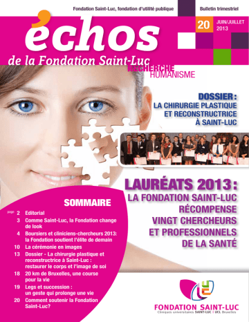 Fondation Saint-Luc, fondation d’utilité publique echos Bulletin trimestriel 20 juin/juillet 2013 de la Fondation Saint-Luc recherche Humanisme Dossier : La chirurgie plastique et reconstructrice à Saint-Luc lauréats 2013 : sommaire page 2Editorial 3Comme Saint-Luc, la Fondation change de look 4Boursiers et cliniciens-chercheurs 2013: la Fondation soutient l’élite de demain 10La cérémonie en images 13Dossier - La chirurgie plastique et reconstructrice à Saint-Luc : restaurer le corps et l’image de soi 1820 km de Bruxelles, une course pour la vie 19 Legs et succession : un geste qui prolonge une vie 20Comment soutenir la Fondation Saint-Luc? la fondation Saint-luc récompense vingt chercheurs et professionnels de la santé éditorial Après l’intense soirée de remise des bourses du 23 mai dernier, c’est un grand plaisir pour moi de vous présenter plus en détails les boursiers lauréats 2013 dans ce numéro des Echos de la Fondation Saint-Luc. Ces jeunes chercheurs et professionnels de la santé constituent l’élite de demain ; c’est grâce à leur engagement sans failles envers leurs patients que naîtront les traitements de demain ; c’est également grâce à leur travail que les patients des Cliniques Saint-Luc verront leur qualité de vie améliorée. Malgré un agenda fort chargé depuis mon accession à de nouvelles fonctions à la RTBF, mon engagement aux côtés de la Fondation demeure intact. J’y tiens énormément car le domaine de la recherche médicale n’est pas suffisamment connu. Il me tient à cœur de le mettre en avant, de faire partager ses victoires sur la maladie. Et je sais indispensable de rappeler sans cesse que, sans le soutien des mécènes, l’excellence et la qualité de la recherche médicale ne seraient que des termes vides de sens. Je ne peux terminer cet édito sans remercier encore une fois les généreux mécènes de la Fondation. Ensemble, nous poursuivrons nos efforts et continuerons à soutenir la Fondation Saint-Luc ! Corinne Boulangier Marraine bénévole de la Fondation Saint-Luc Directrice de La Première (RTBF) www.fondationsaintluc.be Les dons de 40 € et plus sont déductibles fiscalement. Du fond du coeur, un GRAND MERCI ! recherche Humanisme 2 Contact : Fondation Saint-Luc Fondation d’utilité publique Avenue Hippocrate 10/1590 - 1200 Bruxelles [email protected] - +32 2 764 15 23 Les Echos de la Fondation est une publication du Service de communication Réalisation/Rédaction: Géraldine Fontaine Photographies: M arie-Noëlle Cruysmans, CAV Hugues Depasse, Violaine le Hardy de Beaulieu, Shutterstock, Saskia Vanderstichele Graphisme et mise en page: Tilt Factory Editeur responsable: Tessa Schmidburg Actualité de la Fondation Identité visuelle Comme Saint-Luc, la Fondation change de look Après avoir changé la présentation des « Echos », la Fondation poursuit la modernisation de son image et lance son nouveau logo. Tout comme viennent de le faire les Cliniques Saint-Luc. Un grand projet conjoint mené par l’hôpital universitaire et sa fondation « maison ». n Ce n’était plus arrivé depuis leur ouverture en 1976 : les Cliniques universitaires SaintLuc ont changé de logo. Une initiative isolée ? Pas du tout : un nouveau plan stratégique a été lancé cette année ; le relooking a pour but d’en témoigner. Baptisé « SaintLuc2.excellence », ce projet constitue un véritable plan d’avenir pour l’hôpital qui s’accompagne du lancement d’une nouvelle identité visuelle qui se veut elle aussi innovante et contemporaine. « C’est un vent de renouveau qui souffle sur l’hôpital. Nous avons voulu accompagner ce mouvement d’une identité visuelle qui puisse témoigner de cette dynamique », explique Renaud Mazy, Administrateur délégué. Ce vent de renouveau touche bien évidemment les activités qui font battre le cœur de l’hôpital : les soins, la recherche et l’enseignement. Mais pas seulement : la Fondation, porte d’entrée du mécénat à Saint-Luc, participe elle aussi activement à ce renouveau. Son nouveau logo en témoigne. Le changement dans la continuité Saint-Luc a 37 ans, la Fondation en a 27. Une belle histoire, pourtant pas très ancienne. Ils sont nombreux (médecins, soignants, paramédicaux ou personnel administratif) à pouvoir témoigner aujourd’hui encore de la construction puis de l’ouverture de l’hôpital en 1976. Ils sont nos pionniers et ont fait de Saint-Luc, hôpital à la pointe du progrès dès son ouverture, le pôle d’excellence mais aussi d’humanisme qu’il est devenu. « Il était pour nous essentiel de témoigner du respect pour nos fondateurs et pour tous ceux qui ont fait Saint-Luc. Les membres du personnel et de nombreux patients sont à juste titre très attachés au logo historique. C’est pourquoi nous avons voulu bâtir notre identité nouvelle à partir de celui-ci. Le visuel qui nous caractérise depuis 37 ans est à présent décliné en couleurs afin d’illustrer la diversité de nos activités », poursuit l’Administrateur délégué. dation Saint-Luc à l’hôpital qu’elle soutient. A moyen terme, d’autres pôles d’excellence médicale, tels que le Centre du Cancer, par exemple, développeront des logos et des identités visuelles propres, fortement reconnaissables et articulées autour d’une des couleurs du logo. Un logo, trois messages Tant le logo de Saint-Luc que celui de la Fondation Saint-Luc véhiculent un triple message : • Le nom de l’hôpital : Cliniques universitaires Saint-Luc • Le nom de notre université de référence : UCL • Notre « port d’attache » : Bruxelles « La mention de l’UCL et de Bruxelles au cœur même de nos logos sont des éléments essentiels à nos yeux. Nous partageons les missions universitaires de l’UCL et affirmons notre présence, tout comme celle de l’UCL, à Bruxelles. Nous sommes certes un hôpital, mais aussi le principal employeur privé et donc un act