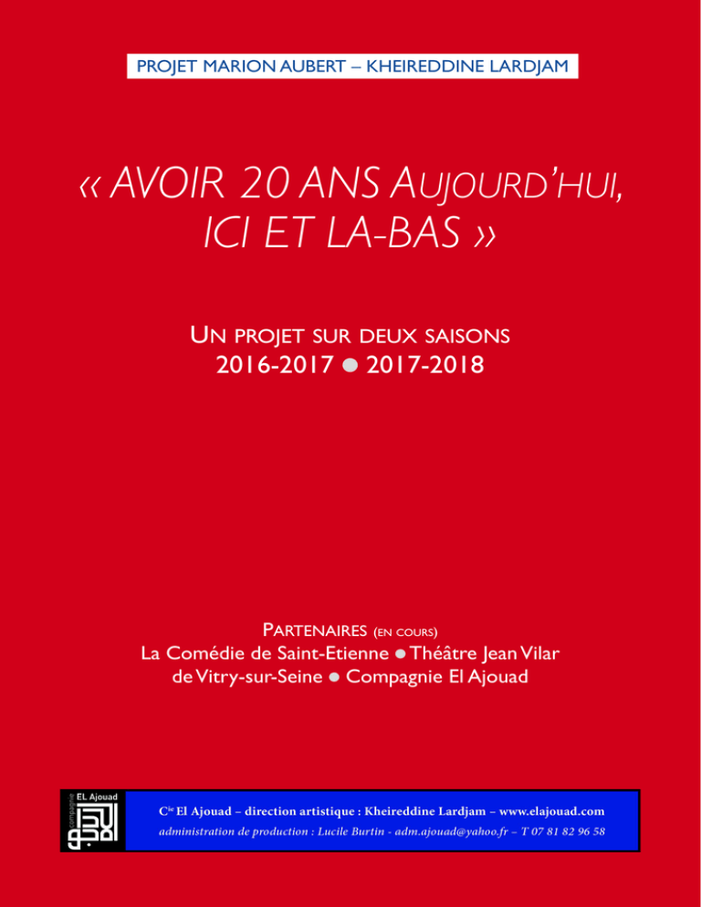 PROJET MARION AUBERT – KHEIREDDINE LARDJAM « AVOIR 20 ANS Aujourd’hui, ICI ET LA-BAS » Un projet sur deux saisons 2016-2017 l 2017-2018 Partenaires (en cours) La Comédie de Saint-Etienne l Théâtre Jean Vilar de Vitry-sur-Seine l Compagnie El Ajouad r u e t u a ’ l e d Note Janvier 2016 J ’ai rencontré Kheireddine Lardjam à la Comédie de Saint-Etienne, à l’occasion de la création de mon dernier texte, Tumultes, (« une pièce française 1 »). La pièce parle, entre autres sujets, de la prise de conscience politique de jeunes gens face à la montée du fascisme dans leur pays. Kheireddine, à l’issue d’une représentation, m’a dit : « J’aimerais que tu continues à travailler cette question de la jeunesse et de l’actualité. » C’était en juin 2015. Aujourd’hui, la jeunesse est devenue, de façon tragique, l’Actualité. Mais c’est qui, la jeunesse ? ça Par Marion Aubert veut dire quoi, avoir 20 ans aujourd’hui en France ? Et en Algérie ? Et en Bourgogne ? Et à Vitry-sur-Seine ? Et lorsqu’on ne partage pas les mêmes convictions ? Et lorsqu’on ne vit pas dans les mêmes conditions ? Et c’est quoi l’espoir ? Y a-t-il un espoir ? Que pouvons-nous construire ensemble aujourd’hui ? Et nous, qui avons deux fois vingt ans aujourd’hui, que lègue-t-on ? Autant de questions brûlantes, sensibles, auxquelles nous tenterons d’apporter d’autres questions, et, peut-être, des bribes de réponses, partielles, tronquées, à côté de la plaque, des réponses venues du réel et trempées dans la fiction, mais destinées à être des pistes pour nos vies actuelles (le terme viendrait d’une expression latine de la seconde moitié du XIV e siècle, cauteres auctuaus ce qui littéralement signifie: « cautère qui agit immédiatement »). Aussi, la perspective de rencontrer des jeunes gens de part et d’autres de frontières, de rencontrer Kheireddine, d’aller, physiquement, aux côtés de ceux-là qui me sont aujourd’hui encore étrangers me semble être un enjeu d’intérêt collectif. n e n è c s n e r u e t t e Note du m C Par Kheireddine Lardjam ’est Alexandre Dumas qui publie en 1850 La Vie à vingt ans – qui suit d’ailleurs de cinq années Vingt ans après. C’est Paul Nizan, revenant, et dans Aden Arabie, et dans La Conspiration, sur ses haïssables vingt ans. C’est René Vautier qui filme en 1972 Avoir vingt ans dans les Aurès. Vingt ans, âge mythique, donc – âge des possibles, âge-seuil, suspendu entre l’enfance heureuse dont il n’y aurait rien à dire, l’adolescence dont l’inquiétude défie la mise en mots, et l’âge adulte, celui des compromissions, forcément regrettable. À y regarder de plus près pourtant, on n’a jamais vraiment vingt ans. Certes, vingt ans, c’est une des marches de la pyramide des âges – mais au même titre que tous les autres. C’est l’âge de la conscription, précisément, un âge idéal, dont la réalité est variable. Un cap mathématique, sans enjeu majeur, entre les 18 ans du baccalauréat et du permis de conduire, et ce qui fut, longtemps, les 21 ans de la majorité et du droit de vote. Il n’est en rien un jubilé dont Octobre 2014 le décompte est fixé à 50. Par ailleurs, « les vingt ans », comme « la vingtaine », désignent souvent la période entre 20 et 29 ans. Comme si ces années formaient un seul bloc. D’ailleurs, les héros de fiction, littéraire ou cinématographique – ce sont souvent les mêmes –, ont rarement « 20 ans » pile. Lamartine écrit Raphaël, pages de la vingtième année, et son héros a 24 ans. Félix de Vandenesse a « vingt ans passés » lorsque Balzac lui fait rencontrer Madame de Mortsauf... Bref, nos héros des romans d’apprentissage ont 20 ans en passant. Nizan ne déroge pas à la règle : ses héros ont entre 20 et 24 ans. « 20 ans » serait donc de l’ordre de la mythologie, de la construction sociale. Pour parler de la jeunesse, on fixe le curseur à 20 ans, arbitrairement. « J’avais 20 ans. Je ne laisserai personne dire que c’est le plus bel âge de la vie » écrivait Paul Nizan en 1931. Qu’en est-il aujourd’hui ? Que signifie avoir entre 20 et 29 ans et devenir adulte en temps de crise ? n Interview Faire ensemble avec Kheireddine Lardjam, metteur en scène Propos recueillis par Mathilde Aubague, janvier 2016. Et la rencontre avec Marion Aubert a été la dernière pièce manquante pour démarrer ce projet. Pourquoi Marion Aubert ? Je suis le travail de cet auteur de loin, depuis plusieurs années. Je pourrais dire que j’ai presque tout lu de ce qu’elle a écrit. J’ai toujours été surpris par sa faculté à transposer le réel en fiction et en fable. J’ai beaucoup lu ses interviews, mais c’est un débat autour des héros au théâtre auquel nous avons participé tous les deux qui va nous faire nous rencontrer. Nos échanges, nos questions autour de la jeunesse, les conversations que nous avons eues ne pouvaient que donner naissance à une collaboration artistique. Avoir vingt ans aujourd’hui, c’est un vaste programme. Comment comptez-vous aborder cela au théâtre ? D’abord, je tiens à rappeler qu’il s’agit là d’un projet de création d’une pièce de théâtre. Tout le travail imaginé a un but artistique qui est celui de faire œuvre théâtrale. Comme les deux précédents projets dont je vous ai parlé, je souhaite travailler au plus près de jeunes qui ont entre 20 et 29 ans. Gilles Deleuze affirme qu’« on enseigne bien ce que l’on cherche, non ce que l’on sait ». Je suis également convaincu de ce principe. Dès lors, l’idée de nous confronter aux publics lors du processus même de création autour du thème des jeunes ayant la vingtaine me paraît indispensable. Je désire convier et intégrer aux différentes étapes de ce travail le public concerné par ce sujet, qui vit concrètement ce thème au quotidien. Pour ce faire, je serai entouré d’une 