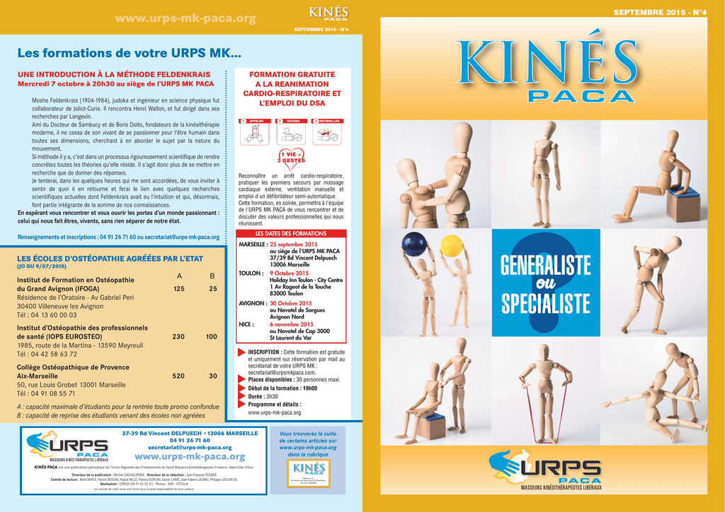 SEPTEMBRE 2015 - N°4 www.urps-mk-paca.org SEPTEMBRE 2015 - N°4 Les formations de votre URPS MK… UNE INTRODUCTION À LA MÉTHODE FELDENKRAIS Mercredi 7 octobre à 20h30 au siège de l’URPS MK PACA Moshe Feldenkrais (1904-1984), judoka et ingénieur en science physique fut collaborateur de Joliot-Curie. Il rencontra Henri Wallon, et fut dirigé dans ses recherches par Langevin. Ami du Docteur de Sambucy et de Boris Dolto, fondateurs de la kinésithérapie moderne, il ne cessa de son vivant de se passionner pour l'être humain dans toutes ses dimensions, cherchant à en aborder le sujet par la nature du mouvement. Si méthode il y a, c'est dans un processus rigoureusement scientifique de rendre concrètes toutes les théories qu'elle réside. Il s'agit donc plus de se mettre en recherche que de donner des réponses. Je tenterai, dans les quelques heures qui me sont accordées, de vous inviter à sentir de quoi il en retourne et ferai le lien avec quelques recherches scientifiques actuelles dont Feldenkrais avait eu l'intuition et qui, désormais, font partie intégrante de la somme de nos connaissances. En espérant vous rencontrer et vous ouvrir les portes d'un monde passionnant : celui qui nous fait êtres, vivants, sans rien séparer de notre état. FORMATION GRATUITE A LA REANIMATION CARDIO-RESPIRATOIRE ET L’EMPLOI DU DSA 1 APPELER (JO DU 9/07/2015) Collège Ostéopathique de Provence Aix-Marseille 50, rue Louis Grobet 13001 Marseille Tél : 04 91 08 55 71 A B 125 25 230 520 3 DEFIBRILLER Reconnaître un arrêt cardio-respiratoire, pratiquer les premiers secours par massage cardiaque externe, ventilation manuelle et emploi d'un défibrilateur semi-automatique. Cette formation, en soirée, permettra à l'équipe de l'URPS MK PACA de vous rencontrer et de discuter des valeurs professionnelles qui nous réunissent. LES DATES DES FORMATIONS MARSEILLE : 25 septembre 2015 au siège de l'URPS MK PACA 37/39 Bd Vincent Delpuech 13006 Marseille LES ÉCOLES D’OSTÉOPATHIE AGRÉÉES PAR L’ETAT Institut d’Ostéopathie des professionnels de santé (IOPS EUROSTEO) 1985, route de la Martina - 13590 Meyreuil Tél : 04 42 58 63 72 MASSER 1 VIE = 3 GESTES Renseignements et inscriptions : 04 91 26 71 60 ou [email protected] Institut de Formation en Ostéopathie du Grand Avignon (IFOGA) Résidence de l’Oratoire - Av Gabriel Peri 30400 Villeneuve les Avignon Tél : 04 13 60 00 03 2 15 100 TOULON : 9 Octobre 2015 Holiday Inn Toulon - City Centre 1 Av Rageot de la Touche 83000 Toulon AVIGNON : 30 Octobre 2015 au Novotel de Sorgues Avignon Nord NICE : 6 novembre 2015 au Novotel de Cap 3000 St Laurent du Var 30 A : capacité maximale d’étudiants pour la rentrée toute promo confondue B : capacité de reprise des étudiants venant des écoles non agréées INSCRIPTION : Cette formation est gratuite et uniquement sur réservation par mail au secrétariat de votre URPS MK : [email protected]. Places disponibles : 30 personnes maxi. Début de la formation : 19h00 Durée : 3h30 Programme et détails : www.urps-mk-paca.org 37-39 Bd Vincent DELPUECH •13006 MARSEILLE 04 91 26 71 60 [email protected] www.urps-mk-paca.org Vous trouverez la suite de certains articles sur www.urps-mk-paca.org dans la rubrique KINÉS PACA est une publication périodique de l’Union Régionale des Professionnels de Santé Masseurs-Kinésithérapeutes Provence- Alpes-Côte d’Azur. Directeur de la publication : Michel CACIAGUERRA - Directeur de la rédaction : Jean-François TESSIER Comité de lecture : René BARTS, Patrick BEGUIN, Pascal BILLO, Patrice DUPLAN, Xavier LAINÉ, Jean-Fabien LAZARO, Philippe LOUCHEUX, Réalisation : CPROD (04 91 55 05 51) - Photos : XDR - FOTOLIA Les articles de cette revue sont écrits sous la seule responsabilité de leurs auteurs. Retrouvez ici les articles de votre journal d’informations dans leur intégralité ? GENERALISTE ou SPECIALISTE www.urps-mk-paca.org www.urps-mk-paca.org SEPTEMBRE 2015 - N°4 SEPTEMBRE 2015 - N°4 1. Les compétences déléguées par le médecin (Article R4321-5). Belles perspectives... Les vacances sont finies. Pour nous, elles ont été studieuses. En effet, nous avons recruté une chargée de mission qui va, pour nous, assurer la liaison sortie hôpital ville / centre de rééducation, assurer notre présence dans le réseau périna- Michel CACCIAGUERRA talité PACA/Monaco, la préparation de “Sport Bien-être 2017”, la création et la Président de l’URPS Masseursmise en place d’ici la fin de l’année d’une appli mobile smartphone dédiée aux Kinésithérapeutes PACA kinés, la préparation de notre participation au congrès Cybermed, objets connectés médicaux (13 et 14 septembre 2015), la préparation du projet Sport et Santé avec la municipalité de Six Fours (Var), les réunions avec l’ARS et la perspective que nous offre l’allongement des études avec la mastérisation et le libre accès à la kinésithérapie. D’ici la fin de l’année, nous organiserons une formation défibrillateur et en 2016 une formation à l’échoscopie. Ces perspectives de changement sont souhaitables, d’autant que certains essaient encore de s’approprier nos prérogatives (contestation du monopole du massage, concours ouverts aux STAPS et à la biologie). La profession se trouve ainsi à la croisée des chemins. L’URPS Masseurs Kinésithérapeutes PACA, représentante de la kinésithérapie libérale, est attentive à la défense des intérêts légitimes de la profession dans notre région. Les champs de compétence du Masseur Kinésithérapeute, les champs du possible Défini en grande partie par l’Arrêté du 6 janvier 1962, modifié par les Arrêtés des 3 et 6 juin 1966 et suivants, jusqu'à celui du 22 février 2000, dont l'une des avancées est Pascal BILLO la suppression de Kinésithérapeute Membre de la commission l'obligation, pour le prescripteur, du de contrôle des comptes quantitatif et du de l’URPS MK PACA qualitatif sur la pr