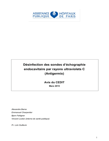 Désinfection des sondes d’échographie endocavitaire par rayons ultraviolets C (Antigermix) Avis du CEDIT Mars 2015 Alexandre Barna Emmanuel Charpentier Bjorn Fahlgren Vincent Looten (interne de santé publique) Pr. Loïc Guillevin 1 Table des matières 1. 2. Introduction, problématique..................................................................................................7 1.1. Les sondes d’échographie endocavitaire ......................................................................7 1.2. Risque infectieux des sondes endocavitaires................................................................8 1.3. Diminuer le risque infectieux. Recommandations actuelles ......................................... 13 1.4. Pratique actuelle de la désinfection à l’AP-HP ............................................................ 16 Désinfection des sondes par rayons UV-C......................................................................... 18 2.1. Aspects techniques..................................................................................................... 18 2.1.1. L’enceinte de désinfection par rayons UV-C Antigermix....................................... 18 2.1.2. Les dispositifs alternatifs ...................................................................................... 19 2.2. Aspects médicaux....................................................................................................... 20 2.2.1. Différents éléments disponibles (fabricant, ANSM,…) .......................................... 20 2.2.2. Revue de la littérature sur les dispositifs UV-C .................................................... 20 2.3. Aspects médico-économiques .................................................................................... 22 2.3.1. Données microéconomiques générales ............................................................... 22 2.3.2. Résultats d’une étude menée par les Hospices Civils de Lyon ............................ 23 2.4. Aspects organisationnels ............................................................................................ 24 3. Discussion ......................................................................................................................... 25 4. Recommandations du CEDIT ............................................................................................ 26 2 RESUME Le CEDIT a été saisi en juin 2013 par le Pr. D. Vadrot, chef du service de radiologie et par M. Ph. Gerson, cadre supérieur radiologie et médecine nucléaire de l’Hôtel-Dieu, sur l’intérêt de la désinfection par rayons ultraviolets C (dispositif ANTIGERMIX) des sondes d’échographie endocavitaire (endorectales et endovaginales) qui constituent potentiellement des vecteurs de contamination microbiologique entre patients. Aspects techniques : L’enceinte de désinfection Antigermix de l’entreprise Germitec utilise des rayons ultraviolets d’une longueur d’onde de 254 nm générés par six lampes à décharge de mercure basse pression. L’enceinte est de forme cylindrique avec un diamètre de 55cm et une hauteur d’un mètre et pèse 60kg. Le système comporte des fonctions de traçabilité permettant notamment de générer des tickets papier. Chaque sonde est identifiée par une puce RFID fixée sur le câble, permettant ainsi un suivi de l’historique de chaque sonde. L'enceinte Antigermix est un dispositif médical de classe IIb (marquage CE depuis 2007). Le procédé de désinfection dure environ 2 minutes. Les moyens de désinfection alternatifs sont le trempage (32 min), le système Trophon (7 min) et le système GUS (8 à 12 min). Aspects médicaux: Malgré des études et des modélisations, le risque infectieux lié à l’usage des sondes endocavitaires est difficile à évaluer. L’Académie nationale de Médecine a confirmé en 2008 les recommandations du Haut Conseil de la Santé Publique (HCSP) émises cette même année, actuellement en cours de révision suite à une saisine de la DGS de juillet 2013. Les recommandations du HCSP ne comportent pas de préconisation quant à l’utilisation des UV-C comme moyen de désinfection des sondes entre patients. Antigermix est un moyen de désinfection alternatif aux systèmes Trophon ou GUS, voire au trempage lorsque la procédure est de qualité. L’utilisation d’Antigermix soulève la question de la pertinence de généraliser le recours systématique, entre patients, à ces moyens de désinfection, et le cas échéant de savoir s’il faut préférer ce dispositif UV-C à l’alternative historique qu’est le trempage. Les trois études disponibles sur l’utilisation des UV-C, toutes financées par la société Germitec, montrent que le dispositif Antigermix, utilisé en combinaison avec d’autres méthodes, est un bon moyen de désinfection. Néanmoins aucune des études ne permet d’établir l’apport propre et la place de la désinfection par UV-C dans l’ensemble du processus de désinfection. De plus, deux de ces études sortent du cadre des échographies endocavitaires. Ces études n’ont pas de portée clinique. Aspects médico-économiques : aucun argument n’est disponible permettant de comparer l’efficacité et les coûts respectifs des différentes méthodes de désinfection. Les coûts à prendre en considération seraient liés au dispositif et à son entretien, comme au temps d’immobilisation 3 du matériel, voire à la nécessité de matériel supplémentaire (pour le trempage, deux sondes qui seraient utilisées en alternance, désinfection de l’une pendant l’utilisation de l’autre). Si le recours systématique à une désinfection de haute criticité entre patients avait un intérêt clinique et devait être préconisé, une étude médico-économique plus élaborée devrait dans ce cas être réalisée. Aspects organisationnels : Les pratiques de désinfection peuvent influencer l’organisation de pl