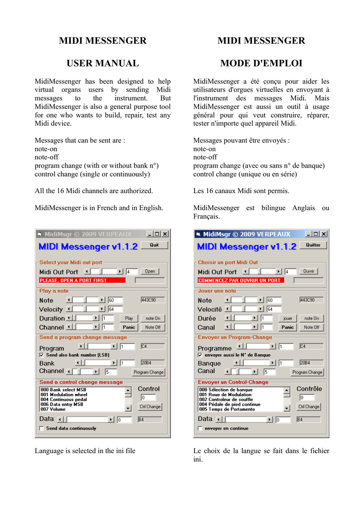 MIDI MESSENGER MIDI MESSENGER USER MANUAL MODE D'EMPLOI MidiMessenger has been designed to help virtual organs users by sending Midi messages to the instrument. But MidiMessenger is also a general purpose tool for one who wants to build, repair, test any Midi device. MidiMessenger a été conçu pour aider les utilisateurs d'orgues virtuelles en envoyant à l'instrument des messages Midi. Mais MidiMessenger est aussi un outil à usage général pour qui veut construire, réparer, tester n'importe quel appareil Midi. Messages that can be sent are : note-on note-off program change (with or without bank n°) control change (single or continuously) Messages pouvant être envoyés : note-on note-off program change (avec ou sans n° de banque) control change (unique ou en série) All the 16 Midi channels are authorized. Les 16 canaux Midi sont permis. MidiMessenger is in French and in English. MidiMessenger est bilingue Anglais ou Français. Language is selected in the ini file Le choix de la langue se fait dans le fichier ini. FIRST STEPS PREMIERS PAS First you must open your Midi Out port. Switch on your organ. Vous devez d'abord ouvrir un port de sortie Midi. Allumez votre orgue; You may have several ports, so you must find the port(s) driving your organ. Start by opening port one, then press the button PLAY.; this will play the note C3 for 1 seconde in channel one. If your hear no sound, close port 1 and open port 2, and so on. Of course your organ must have a stop engaged on the manual responding to channel 1. Vous en avez surement plusieurs ports, alors il faut identifier celui ou ceux qui pilotent l'orgue. Ouvrez d'abord le port 1 puis appuyez sur PLAY. Vous devez entendre la note ut3 pendant une seconde. Sinon refermez le port 1 et faites pareil avec le port 2 et ainsi de suite. Bien évidement un jeu doit être engagé sur le clavier qui répond au canal 1. Save this value in the ini file if you want. Mémorisez cette valeur dans le fichier ini. PLAY A NOTE JOUER UNE NOTE Select the Midi channel corresponding to the keyboard you want to test. Choisissez le canal Midi associé au clavier que vous voulez tester. Select a note. Choisissez une note. Select a velocity (not need for organs). Choisissez une vélocité (inutile pour l'orgue). Then, there are 2 ways to play the note : Il y a deux façons de jouer une note : • Push NOTE ON. The not is played but does not stop unless you press NOTE OFF (with same channel and same note number). • Pressez NOTE ON. La note est jouée mais ne s'arrête que si on presse NOTE OFF (avec les mêmes n° de note et de canal). • Push PLAY. The note is played only for the displayed duration (1s to 1mn). • Pressez PLAY. La note est jouée pour la durée affichée (1s à 1 mn). The PANIC button stops every notes in every channels. Le bouton PANIC stoppe toutes les notes, dans tous les canaux. The grey label on the right shows the Midi message, in hexadecimal. Read it from right to lefts as 92,2C.40. Le champs grisé à droite montre le message Midi en héxadécimal. Lisez-le de droite à gauche comme 90.16.40. SEND A PROGRAM CHANGE ENVOYER UN PRG CHANGE This frame permits to send program change message, in a channel different from the channel used for notes. The default channel is stored in the ini file. Cette boîte permet d'envoyer un message program change avec un canal diffèrent de celui des notes. La valeur par défaut est stockée dans le fichier ini. Select your program number and your channel, then press PROGRAM CHANGE. Choisissez un n° de programme et de canal puis pressez PROGRAM CHANGE. If the box Send also bank number is checked, a select bank number (LSB) message is sent before the program change. Si la boîte Envoyer aussi le n° de banque est cochée, un message bank select est émis juste avant le message prg change. SEND A CONTROL CHANGE ENVOYER UN CTRL CHANGE Select a controller in the list or enter a number in the field control, select a value with the slider data then press CTRLCHANGE. A single message is sent. Sélectionnez un contrôle dans la liste ou entrez son n° dans le champ control, choisissez une valeur avec le potentiomètre data. Un message unique est émis. Channel used is the same than PRG CHANGE Le canal utilisé est le même que PRG CHANGE. If Send data continuously is checked, a control change message is sent each time the slider data moves. Si Envoyer en continu est coché, un message control change est émis à chaque mouvement du potentiomètre data. This is very useful to test continuous controller like 007 Volume often used to drive the expressive pedal of your organ. Ceci est particulièrement utile pour tester un contrôleur continu comme 007 Volume souvent utilisé pour commander la boîte d'expression d'un orgue.
