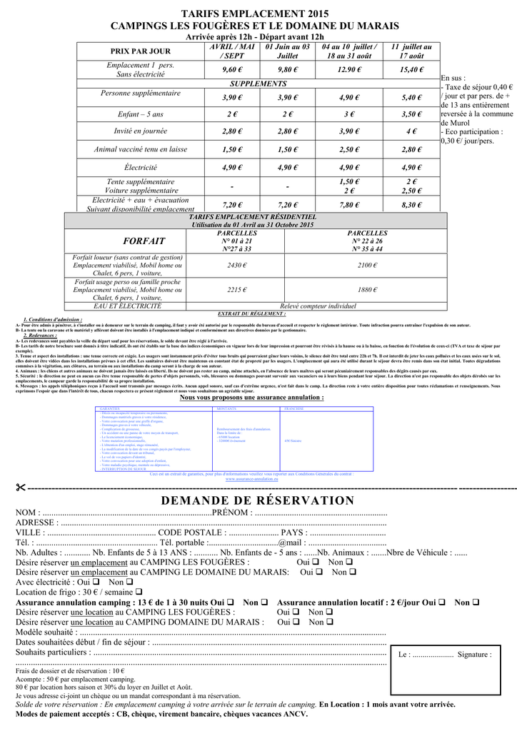 TARIFS EMPLACEMENT 2015 CAMPINGS LES FOUGÈRES ET LE DOMAINE DU MARAIS Arrivée après 12h - Départ avant 12h PRIX PAR JOUR AVRIL / MAI / SEPT 01 Juin au 03 Juillet 04 au 10 juillet / 18 au 31 août 11 juillet au 17 août Emplacement 1 pers. Sans électricité 9,60 € 9,80 € 12.90 € 15,40 € SUPPLEMENTS Personne supplémentaire 3,90 € 3,90 € 4,90 € 5,40 € Enfant – 5 ans 2€ 2€ 3€ 3,50 € Invité en journée 2,80 € 2,80 € 3,90 € 4€ Animal vacciné tenu en laisse 1,50 € 1,50 € 2,50 € 2,80 € Électricité 4,90 € 4,90 € 4,90 € 4,90 € - - 1,50 € 2€ 2€ 2,50 € 7,20 € 7,20 € 7,80 € 8,30 € Tente supplémentaire Voiture supplémentaire Electricité + eau + évacuation Suivant disponibilité emplacement TARIFS EMPLACEMENT RÉSIDENTIEL Utilisation du 01 Avril au 31 Octobre 2015 PARCELLES N° 01 à 21 N°27 à 33 FORFAIT Forfait loueur (sans contrat de gestion) Emplacement viabilisé, Mobil home ou Chalet, 6 pers, 1 voiture, Forfait usage perso ou famille proche Emplacement viabilisé, Mobil home ou Chalet, 6 pers, 1 voiture, EAU ET ÉLECTRICITÉ En sus : - Taxe de séjour 0,40 € / jour et par pers. de + de 13 ans entièrement reversée à la commune de Murol - Eco participation : 0,30 €/ jour/pers. PARCELLES N° 22 à 26 N° 35 à 44 2430 € 2100 € 2215 € 1880 € Relevé compteur individuel EXTRAIT DU RÉGLEMENT : 1. Conditions d'admission : A- Pour être admis à pénétrer, à s'installer ou à demeurer sur le terrain de camping, il faut y avoir été autorisé par le responsable du bureau d'accueil et respecter le règlement intérieur. Toute infraction pourra entraîner l'expulsion de son auteur. B- La tente ou la caravane et le matériel y afférent doivent être installés à l'emplacement indiqué et conformément aux directives données par le gestionnaire. 2. Redevances : A- Les redevances sont payables la veille du départ sauf pour les réservations, le solde devant être réglé à l'arrivée. B- Les tarifs de notre brochure sont donnés à titre indicatif, ils ont été établis sur la base des indices économiques en vigueur lors de leur impression et pourront être révisés à la hausse ou à la baisse, en fonction de l'évolution de ceux-ci (TVA et taxe de séjour par exemple). 3. Tenue et aspect des installations : une tenue correcte est exigée. Les usagers sont instamment priés d'éviter tous bruits qui pourraient gêner leurs voisins, le silence doit être total entre 22h et 7h. Il est interdit de jeter les eaux polluées et les eaux usées sur le sol, elles doivent être vidées dans les installations prévues à cet effet. Les sanitaires doivent être maintenus en constant état de propreté par les usagers. L'emplacement qui aura été utilisé durant le séjour devra être remis dans son état initial. Toutes dégradations commises à la végétation, aux clôtures, au terrain ou aux installations du camp seront à la charge de son auteur. 4. Animaux : les chiens et autres animaux ne doivent jamais être laissés en liberté. Ils ne doivent pas rester au camp, même attachés, en l'absence de leurs maîtres qui seront pécuniairement responsables des dégâts causés par eux. 5. Sécurité : le direction ne peut en aucun cas être tenue responsable de pertes d'objets personnels, vols, blessures ou dommages pouvant survenir aux vacanciers ou à leurs biens pendant leur séjour. La direction n'est pas responsable des objets dérobés sur les emplacements, le campeur garde la responsabilité de sa propre installation. 6. Messages : les appels téléphoniques reçus à l'accueil sont transmis par messages écrits. Aucun appel sonore, sauf cas d'extrême urgence, n'est fait dans le camp. La direction reste à votre entière disposition pour toutes réclamations et renseignements. Nous exprimons l'espoir que dans l'intérêt de tous, chacun respectera ce présent règlement et nous vous souhaitons un agréable séjour. Nous vous proposons une assurance annulation : GARANTIES - Décès ou incapacité temporaire ou permanente, - Dommages matériels graves à votre résidence, - Votre convocation pour une greffe d'organe, - Dommages graves à votre véhicule, - Complication de grossesse, - Un accident ou une panne de votre moyen de transport, - Le licenciement économique, - Votre mutation professionnelle, - L'obtention d'un emploi, stage rémunéré, - La modification de la date de vos congés payés par l'employeur, - Votre convocation devant un tribunal, - Le vol de vos papiers d'identité, - Votre convocation pour une adoption d'enfant, - Votre maladie psychique, mentale ou dépressive, - INTERRUPTION DE SEJOUR MONTANTS FRANCHISE Remboursement des frais d'annulation. Dans la limite de : - 6500€/location - 32000€/événement 45€/Sinistre Ceci est un extrait de garanties, pour plus d'informations veuillez vous reporter aux Conditions Générales du contrat : www.assurance-annulation.eu ----------------------------------------------------------------------------------------------------------------------------- ----------------- DEMANDE DE RÉSERVATION NOM : ..............................................................................PRÉNOM : ............................................................. ADRESSE : ...................................................................................................................................................... VILLE : .................................................. CODE POSTALE : ....................... PAYS : ................................... Tél. : ........................................................ Tél. portable :................................@mail : .................................... Nb. Adultes : ............ Nb. Enfants de 5 à 13 ANS : ........... Nb. Enfants de - 5 ans : ......Nb. Animaux : .......Nbre de Véhicule : ...... Oui Non Désire réserver un emplacement au CAMPING LES FOUGÈRES : Désire réserver un emplacement au CA