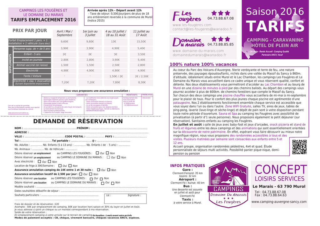 CAMPINGS LES FOUGÈRES ET LE DOMAINE DU MARAIS Arrivée après 12h - Départ avant 12h - Taxe de séjour: 0,50€/jour/pers de plus de 18 ans entièrement reversée à la commune de Murol. (Indice 2015) TARIFS EMPLACEMENT 2016 PRIX PAR JOUR 1er Juin au 3 Juillet Forfait Emplacement 1 pers. + 1 Installation + 1 véhicule (Sans élec) 9,60€ 9,80€ Personne supp. de + de 5 ans 3,90€ 3,90€ 4,90€ 5,40€ Enfant - 5 ans 2€ 2€ 3€ 3,50€ Invité en journée 2,80€ 2,80€ 3,90€ 5,40€ Animal vacciné (en laisse) 1,50€ 1,50€ 2,50€ 2,80€ Electricité 4,90€ 4,90€ 4,90€ 4,90€ Tente / Voiture - - 1,50€ / 2€ 2€ / 2,50€ 7,20€ 7,20€ 7,80€ 8,30€ SUPPLEMENTS Avril / Mai / Septembre Electricité + eau + evacuation (Suivant disponibilité emplacement) 4 au 10 Juillet / 18 au 31 Août 11 Juillet au 17 Août 13€ GARANTIES Ceci est un extrait de garanties. Pour plus d’informations veuillez vous reporter aux Conditions Générales du contrat : www.assurance-annulation.eu MONTANTS - La modification de la date de vos congés payés par l’employeur, - Votre convocation devant un tribunal, - Votre convocation devant un tribunal, - Le vol de vos papiers d’identité, - Votre convocation pour une adoption d’enfant, - Votre maladie psychique, mentale ou dépressive, - INTERRUPTION DE SEJOUR Remboursement des frais d’annuation. Dans la limite de: - 6 500€/location - 32 000€/évenement FRANCHISE 45€/sinistre DEMANDE DE RÉSERVATION NOM : .....................................................................PRÉNOM : ......................................................................... ADRESSE : .......................................................................................................................................................... VILLE : .................................................... CODE POSTAL : ........................ PAYS : .......................................... Tel : ........................................ Tel portable : ........................... @ : ........................................... Nb. Adultes : ............... Nb. Enfants (5 à 13 ans) : ............... Nb. Enfants ( de - 5 ans) : ............... Nb. Animaux : ............... Nb. de Véhicule : ............... Désire réserver un emplacement au CAMPING LES FOUGÈRES : Désire réserver un emplacement au CAMPING LE DOMAINE DU MARAIS : Oui Non Oui www.les-fougeres.com contact@[email protected] 15,50€ Nous vous proposons une assurance annulation : - Décès ou incapacité temporaire ou permanente, - Dommages matériels graves à votre résidence, - Votre convocation pour une greffe d’organe, - Dommages graves à votre véhicule, - Complication de grossesse, - Un accident ou une panne de votre moyen de transport, - Le licenciement économique, - Votre mutation professionnelle, - L’obtention d’un emploi, stage rémunéré, 04.73.88.67.08 04.73.88.85.85 www.domaine-du-marais.com [email protected] Oui Assurance annulation locatif de 2,50€ par jour : Gare : Non Désire réserver une location Oui au CAMPING LES FOUGÈRES : Non Oui Non Désire réserver une location au CAMPING LE DOMAINE DU MARAIS : Oui Clermont-Ferrand: 35 km Issoire: 32 km Aéroport : Non Clermont-Fd / Aulnat: 40 km Modèle souhaité : ................................................................................................................................................ Dates souhaitées début/fin de séjour : ................................................................................................................ Souhaits particuliers : .......................................................................... Le : Clé Verte - Rando Accueil - Camping Qualité Partenaire ANCV, Vacaf Au coeur du Parc des Volcans d’Auvergne, féerie verdoyante et terre de feu, une nature préservée, des paysages époustouflants, nichés dans une vallée du Massif du Sancy à 860m. d’altitude, idéalement situés entre Murol et le Lac Chambon, les campings Les Fougères et Le Domaine du Marais vous accueillent dans ce cadre unique et vous réservent qualité, confort et détente. Nos deux établissements vous permettront d’accéder au Lac Chambon et au bourg de Murol en une dizaine de minutes à pied par des chemins balisés. Au départ des campings vous pourrez accéder à plus de 600km. de chemins forestiers que compte le Massif du Sancy. Sur chacun des deux campings une piscine chauffée vous accueillera de mi-mai à mi-septembre pour le plaisir de tous. Pour le confort des plus jeunes chaque piscine est agrémentée d’une pataugeoire. Nos 2 établissements fonctionnent ensemble chaque service est accessible que vous soyez dans l’un ou dans l’autre. Zone WIFI Gratuite, salles TV, aires de jeux, tables de ping-pong, laverie (lave-linge et sèche-linge) et dépôt de pain sont à votre disposition pendant toute notre période d’ouverture. Sauna et Spa au camping les Fougères avec possibilité de privatisation (à partir d’1 seule personne). Nous proposons également le petit déjeuner (sur réservation). Sanitaires enfants au camping les Fougères. En juillet et août : salle de jeux avec baby-foot et jeux d’arcades, snack pizzeria et stand de fruits et légumes entre les deux campings et des animations qui sont essentiellement orientées sur la découverte de notre patrimoine. En effet, espérant vous faire découvrir au mieux notre magnifique région, nous vous proposons des randonnées accessibles à tous et des visites. Plusieurs matinées par semaine sont consacrées aux enfants entre 5 et 12 ans. Accueil groupe, organisation randonnées pédestres, 4x4 et quad. Étude personnalisée de séjours multi activités. Possibilité panier pique-nique, demipension ou pension INFOS PRATIQUES Oui CAMPING - CARAVANING HÔTEL DE PLEIN AIR Non Non Assurance annulation camping de 14€ entre 1 et 30 nuits : TARIFS 100% nature 100% vacances Avec électricité : Oui Non Loc