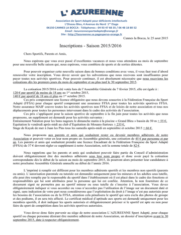 Association de Sport Adapté pour déficients intellectuels L’Oiseau Bleu, 4 Avenue du Nord 1er Etage 06150 CANNES LA BOCCA - Téléphones : 04 93 47 68 35 / 06 48 18 80 52 Email : [email protected] Site : http://lazureenne.sa.pagesperso-orange.fr Cannes la Bocca, le 25 aout 2015 Inscriptions - Saison 2015/2016 Chers Sportifs, Parents et Amis, Nous espérons que vous avez passé d’excellentes vacances et nous vous attendons au mois de septembre pour une nouvelle belle saison qui, nous espérons, vous comblera de sports et de sorties détentes. Pour pouvoir organiser cette nouvelle saison dans de bonnes conditions avec vous, il vous faut tout d’abord renouveler votre inscription. Vous devez savoir que les subventions que nous recevons sont insuffisantes pour payer toutes nos activités sportives. Pour pouvoir continuer, il est absolument nécessaire que nous recevions les cotisations dès les premiers jours du mois de septembre et au plus tard le 30 septembre 2015. La cotisation 2015/2016 a été votée lors de l’Assemblée Générale du 7 février 2015, elle est égale à : 120 € par sportif de moins de 18 ans au 1er octobre 2015, 140 € par sportif de 18 ans et plus au 1er octobre 2015. Ces prix comprennent une licence obligatoire que nous devons souscrire à la Fédération Française du Sport Adapté (FFSA) pour chaque sportif comprenant une assurance FFSA pour toutes les activités sportives FFSA. Notre assurance MAIF couvre toutes les activités sportives non FFSA et de loisirs de notre association et tous nos déplacements pour toutes les personnes intervenant dans le cadre des activités de l’association. Ces prix s’appliquent pour la saison sportive de septembre à la fin juin pour toutes les activités que nous proposons, un supplément est demandé pour les activités suivantes : Entrainement Natation pour les bons nageurs le dimanche matin à la piscine « Grand Bleu » bassin de 50 m + 55 €, Equitation le vendredi après-midi au club d’Equitation de Mouans-Sartoux + 235 €, Stage de Kayak de mer à Juan les Pins tous les samedis après-midi en septembre et octobre 2015 + 66 €. Nous proposons aux parents et amis qui souhaitent rester ou devenir membres adhérents de notre Association et pouvoir voter en leur nom propre en Assemblée générale, une cotisation de 45 € par personne et par an. Les parents et amis qui souhaitent prendre une licence Encadrant de la Fédération Française du Sport Adapté (FFSA) de 37 € devront régler ce supplément à notre Association, soit la somme totale de 82 €. Nous rappelons que les parents et amis qui souhaitent pouvoir faire partie du Conseil d’administration doivent obligatoirement être des membres adhérents sous leur nom propre et donc avoir payé la cotisation correspondante dès le début de la saison au mois de septembre 2015, ils pourront alors présenter leur candidature à notre prochaine Assemblée Générale annuelle au début de l’année 2016. L’imprimé à remplir est différent pour les membres adhérents sportifs et les membres non sportifs (parents ou amis). L’autorisation parentale ou tutorale est demandée uniquement pour les mineurs et les adultes sous tutelle, elle peut être remplie par le responsable du sportif dans l’établissement où il est placé dans le cadre des fonctions et responsabilités qui lui sont attribuées pour la personne qui lui est confiée. Attention, la non fourniture de ce document signé ne permettra pas au sportif mineur ou sous tutelle de s’inscrire à l’association. Vous devez obligatoirement indiquer si vous accordez ou vous n’accordez pas l’utilisation de l’image sur un document daté et signé, sans indication de votre part nous considèrerons que l’exploitation du droit à l’image n’est pas autorisée pour les besoins de l’association ou de la FFSA, attention cela pénalisera le sportif qui sera exclu des photos de groupe et des podiums, il en sera très affecté. Le certificat médical d’aptitude aux sports est demandé uniquement pour les membres sportifs, il doit indiquer les sports autorisés et obligatoirement préciser si le sportif est apte ou non pour faire du sport de compétition dans les activités sportives autorisées. Vous devez donc faire parvenir au siège de notre association L’AZUREENNE Sport Adapté, pour chaque sportif ou chaque personne désirant être membre adhérent de notre Association, un dossier d’inscription avant le 30 septembre 2015, date à respecter obligatoirement. Association de Sport Adapté pour déficients intellectuels L’Oiseau Bleu, 4 Avenue du Nord 1er Etage 06150 CANNES LA BOCCA - Téléphones : 04 93 47 68 35 / 06 48 18 80 52 Email : [email protected] Site : http://lazureenne.sa.pagesperso-orange.fr Pièces du dossier d’inscription pour les Sportifs : - - Renseignements personnels des Membres Sportifs (1 et 2) à remplir entièrement, Autorisation Parentale ou Tutorale (uniquement pour les mineurs et adultes sous tutelle), Deux photos d’identité (pour les nouveaux adhérents), Un certificat médical autorisant les activités sportives en entrainement, en compétition, en précisant les restrictions demandées, Un chèque de 140 € (ou 120 € moins de 18 ans), ou plus pour les activités choisies avec un supplément, pour les sportifs avec licence FFSA, ou plusieurs chèques en indiquant les dates d’encaissement demandées. Les chèques doivent être libellés au nom de : L’Azuréenne Sport Adapté. Indiquez sur la fiche de renseignements les activités sportives choisies parmi celles mentionnées. Pièces du dossier d’inscription pour les Parents ou Amis : - Renseignements personnels des Membres Adhérents non sportifs à remplir entièrement, Deux photos d’identité (pour les nouveaux adhérents), Un chèque de 45 € pour les membres adhérents sans licence FFSA. Les personnes désirant posséder une licence FFSA Encadrant au nom de L’Azuréenne doivent en faire l