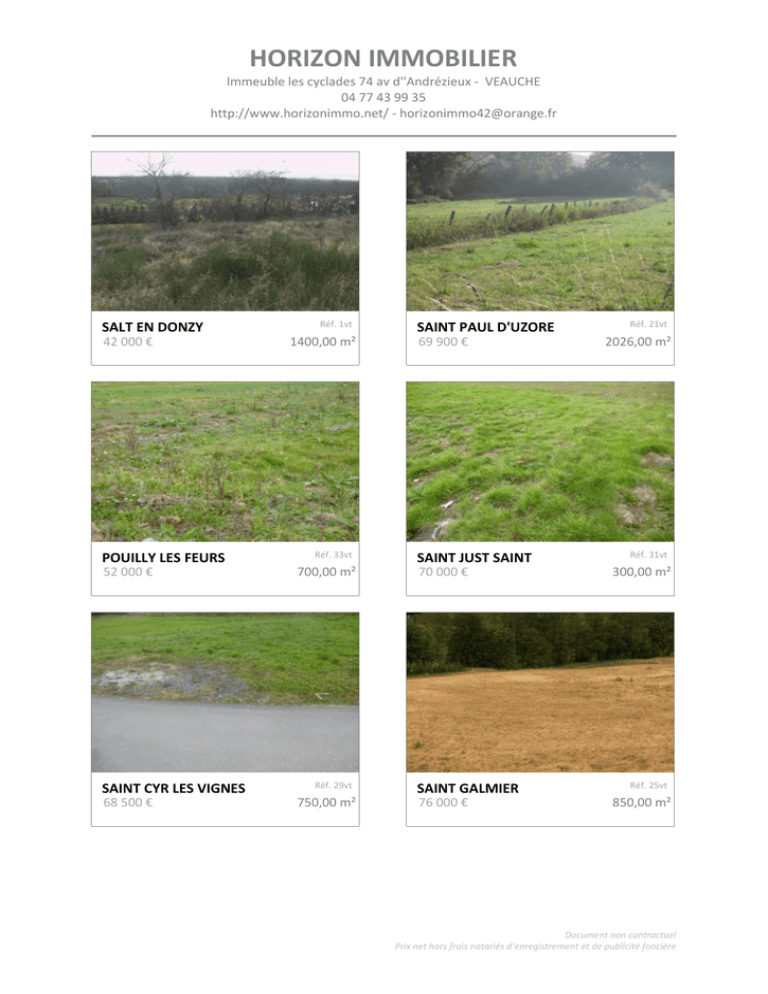 HORIZON IMMOBILIER Immeuble les cyclades 74 av d''Andrézieux - VEAUCHE 04 77 43 99 35 http://www.horizonimmo.net/ - [email protected] SALT EN DONZY 42 000 € POUILLY LES FEURS 52 000 € SAINT CYR LES VIGNES 68 500 € Réf. 1vt 1400,00 m² Réf. 33vt 700,00 m² Réf. 29vt 750,00 m² SAINT PAUL D'UZORE 69 900 € SAINT JUST SAINT 70 000 € RAMBERT SAINT GALMIER 76 000 € Réf. 21vt 2026,00 m² Réf. 31vt 300,00 m² Réf. 25vt 850,00 m² Document non contractuel Prix net hors frais notariés d’enregistrement et de publicité foncière HORIZON IMMOBILIER Immeuble les cyclades 74 av d''Andrézieux - VEAUCHE 04 77 43 99 35 http://www.horizonimmo.net/ - [email protected] PLANFOY 85 000 € SAINT ETIENNE 85 000 € SAINT CHAMOND 92 000 € Réf. 17vt 650,00 m² Réf. 10vt 700,00 m² Réf. 36vt 550,00 m² LE CHAMBON 95 000 € FEUGEROLLES SAINT GALMIER 89 900 € ANDREZIEUX 110 000 € BOUTHEON Réf. 12vt 700,00 m² Réf. 32vt 664,00 m² Réf. 35vt 531,00 m² Document non contractuel Prix net hors frais notariés d’enregistrement et de publicité foncière HORIZON IMMOBILIER Immeuble les cyclades 74 av d''Andrézieux - VEAUCHE 04 77 43 99 35 http://www.horizonimmo.net/ - [email protected] GENILAC 115 900 € Réf. 26vt 600,00 m² LA FOUILLOUSE 180 000 € Réf. 2vt 1600,00 m² Document non contractuel Prix net hors frais notariés d’enregistrement et de publicité foncière