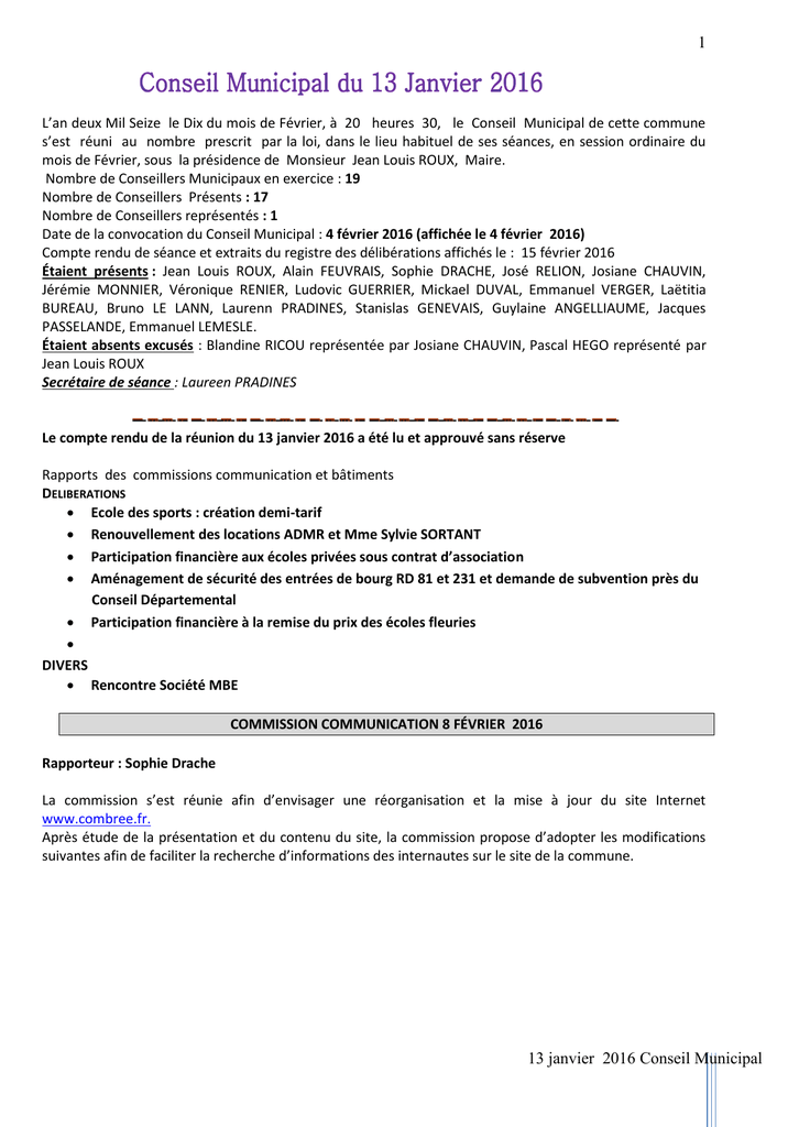 1 L’an deux Mil Seize le Dix du mois de Février, à 20 heures 30, le Conseil Municipal de cette commune s’est réuni au nombre prescrit par la loi, dans le lieu habituel de ses séances, en session ordinaire du mois de Février, sous la présidence de Monsieur Jean Louis ROUX, Maire. Nombre de Conseillers Municipaux en exercice : 19 Nombre de Conseillers Présents : 17 Nombre de Conseillers représentés : 1 Date de la convocation du Conseil Municipal : 4 février 2016 (affichée le 4 février 2016) Compte rendu de séance et extraits du registre des délibérations affichés le : 15 février 2016 Étaient présents : Jean Louis ROUX, Alain FEUVRAIS, Sophie DRACHE, José RELION, Josiane CHAUVIN, Jérémie MONNIER, Véronique RENIER, Ludovic GUERRIER, Mickael DUVAL, Emmanuel VERGER, Laëtitia BUREAU, Bruno LE LANN, Laurenn PRADINES, Stanislas GENEVAIS, Guylaine ANGELLIAUME, Jacques PASSELANDE, Emmanuel LEMESLE. Étaient absents excusés : Blandine RICOU représentée par Josiane CHAUVIN, Pascal HEGO représenté par Jean Louis ROUX Secrétaire de séance : Laureen PRADINES Le compte rendu de la réunion du 13 janvier 2016 a été lu et approuvé sans réserve Rapports des commissions communication et bâtiments DELIBERATIONS Ecole des sports : création demi-tarif Renouvellement des locations ADMR et Mme Sylvie SORTANT Participation financière aux écoles privées sous contrat d’association Aménagement de sécurité des entrées de bourg RD 81 et 231 et demande de subvention près du Conseil Départemental Participation financière à la remise du prix des écoles fleuries DIVERS Rencontre Société MBE COMMISSION COMMUNICATION 8 FÉVRIER 2016 Rapporteur : Sophie Drache La commission s’est réunie afin d’envisager une réorganisation et la mise à jour du site Internet www.combree.fr. Après étude de la présentation et du contenu du site, la commission propose d’adopter les modifications suivantes afin de faciliter la recherche d’informations des internautes sur le site de la commune. 13 janvier 2016 Conseil Municipal 2 1. Les thématiques actuelles Elles sont au nombre de cinq : La Commune Vie Municipale Vie Quotidienne Vie associative Infos Utiles La commission a remarqué que la thématique « Vie quotidienne » contient des informations qu’on ne penserait pas forcément à aller chercher ici et qui n’ont pas de rapport entre elles (assistance à la personne, commerce-artisanat-industrie). Par ailleurs, la thématique « Infos utiles » contient aujourd’hui tellement de rubriques différentes et nombreuses qu’il devient difficile de s’y retrouver. 2. Modifications et mises à jour proposées La commission propose donc de réorganiser l’arborescence du site en supprimant certaines thématiques et en en créant d’autres plus explicites. Elles seraient au nombre de sept : La Commune Vie Municipale Sport-Culture-Loisirs Urbanisme-Environnement Social-Santé Enfance-Jeunesse Commerce-Artisanat-Industrie Ci-après la nouvelle arborescence détaillée avec les mises à jour nécessaires : La Commune : Découverte Histoire : plan et blason. Hier et aujourd’hui : texte sur la Cité Jeanne d’Arc et photos. Patrimoine Du collège à … : photos. L’Epide : texte à mettre à jour. Tour des Gueltiers : photos. Eglise de Combrée : photos. Chapelle St Joseph : photos. Forêt communale : photos. Culture : à mettre dans Sport-Culture-Loisirs Vie municipale : Rubriques à mettre à jour : La Mairie vous accueille. Les permanences : modifier permanence du RAM. Commissions municipales. Ajouter la rubrique « Vos démarches en mairie » (état-civil…) Elections. Concours des Maisons fleuries à mettre dans les loisirs. 13 janvier 2016 Conseil Municipal 3 Supprimer départ retraite Suzanne Richard. Supprimer Agenda 21. Ajouter « Avis consultation du public ». Ajouter les arrêtés. Ajouter une rubrique sur la réforme territoriale. Création d’une thématique Urbanisme-Environnement Urbanisme : Déclarations et permis : créer un lien vers les différents imprimés Cerfa. Ajouter une rubrique PLUI. Acheter une parcelle à Combrée : faire référence à la prime de 5 000 € pour certaines parcelles du Chemin Bleu II. SCOT. Subventions travaux rénovation : à mettre à jour (se référer au site de l’ANAH + aide Com com). Tournée annuelle cadastrale. Environnement : Ramassage des ordures ménagères. Horaires déchetterie. Balayage des rues. Ajouter coupes de bois. Bouchons d’Amour 49. Création d’une thématique Enfance-Jeunesse Petite enfance : RAM. Halte-garderie « Les Pitchouns ». Activités 4-11 ans : Ecole de sport : ajouter le groupe du vendredi. Club des Lutins (mercredi après-midi). Accueil de loisirs itinérant (petites vacances scolaires). Multi-Act (vacances scolaires). Accueil de loisirs Familles Rurales (juillet-août). Activités 11-17 ans : Canto-jeunes. Club des ados (mercredi après-midi). Programme des vacances. Les écoles : Groupe scolaire public de l’Ombrée. Ecole Saint-François : à mettre à jour. Ecole Notre-Dame des Ardoisières : à mettre à jour. 13 janvier 2016 Conseil Municipal 4 Accueils périscolaires : Garderie périscolaire. TAP. Restaurant scolaire. PIJ : à mettre à jour. Logement solidaire. Lien vers Centre Epide. Création d’une thématique Sport-Culture-Loisirs Sport. Equipements sportifs (salles de sport, terrains de foot, terrains de tennis, city stade, skate park, piscine…) Les infos sur les différentes associations sportives sont à mettre à jour (USCBAN, EHA, tennis, tennis de table, VTT … Loisirs. Les infos sur les différentes associations sont à mettre à jour. Ajouter piscine et plan d’eau. Ajouter Concours des Maisons Fleuries. Ajouter un lien vers Ecole de musique de l’Anjou Bleu. Proposition : envoyer un courrier aux différents responsables des associations afin qu’ils nous transmettent un article de présentation sur les activités proposées, les membres du bureau et éventue